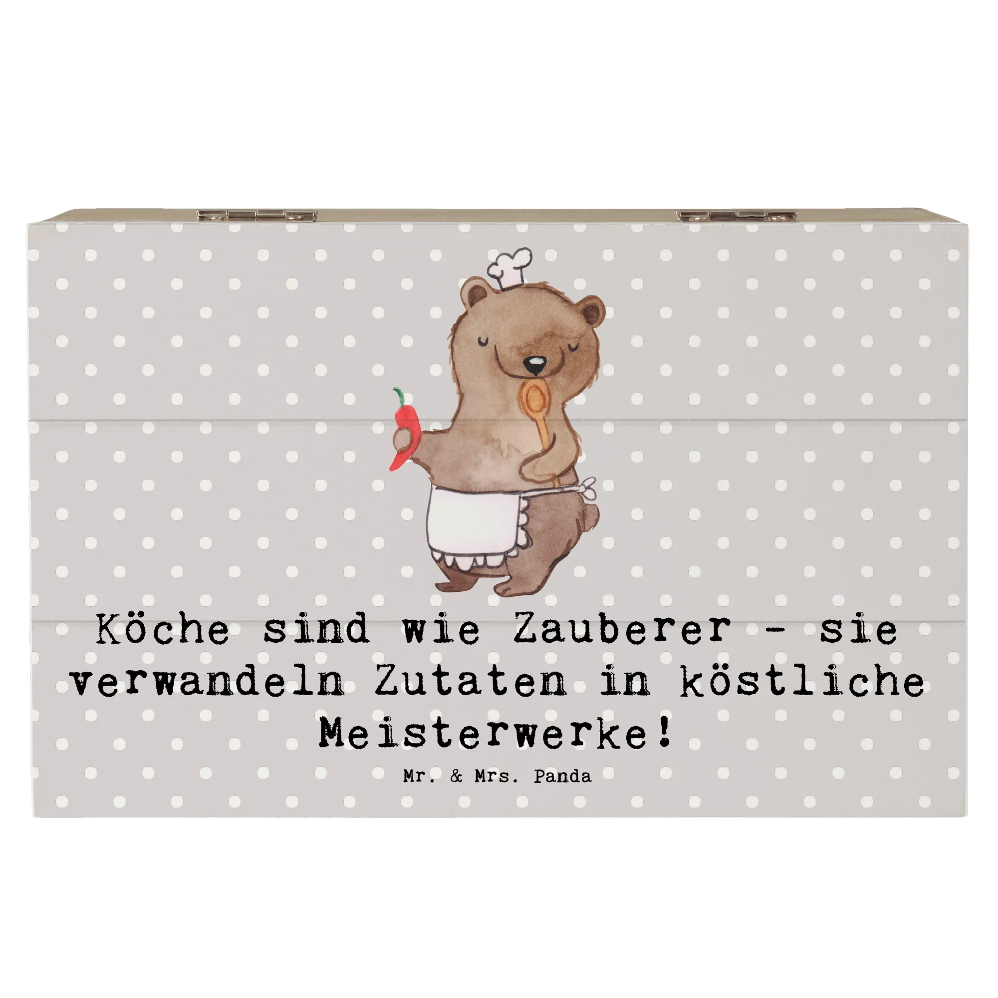 Entdecke die einzigartige Holzkiste mit dem liebevollen Motiv "Koch" aus der Berufe Kollektion von Mr. & Mrs. Panda! Diese wunderschöne Holzkiste ist nicht nur ein idealer Aufbewahrungsort für Deine Schätze, sondern auch eine tolle Geschenkidee für all jene, die gerne kochen oder einfach die Magie der Kochkunst lieben.