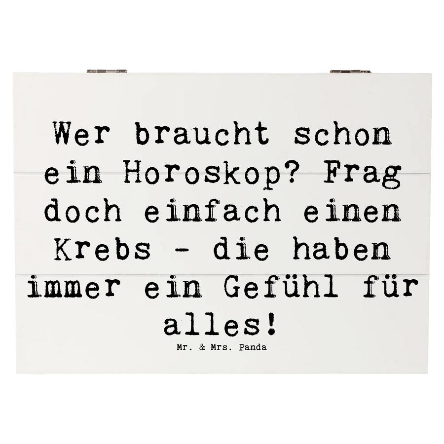 Entdecke die wunderschöne Holzkiste von Mr. & Mrs. Panda, die perfekt für alle Krebse ist! Mit einem lustigen Spruch, "Wer braucht schon ein Horoskop? Frag doch einfach einen Krebs - die haben immer ein Gefühl für alles!", begeistert diese Kiste ganz besonders.
