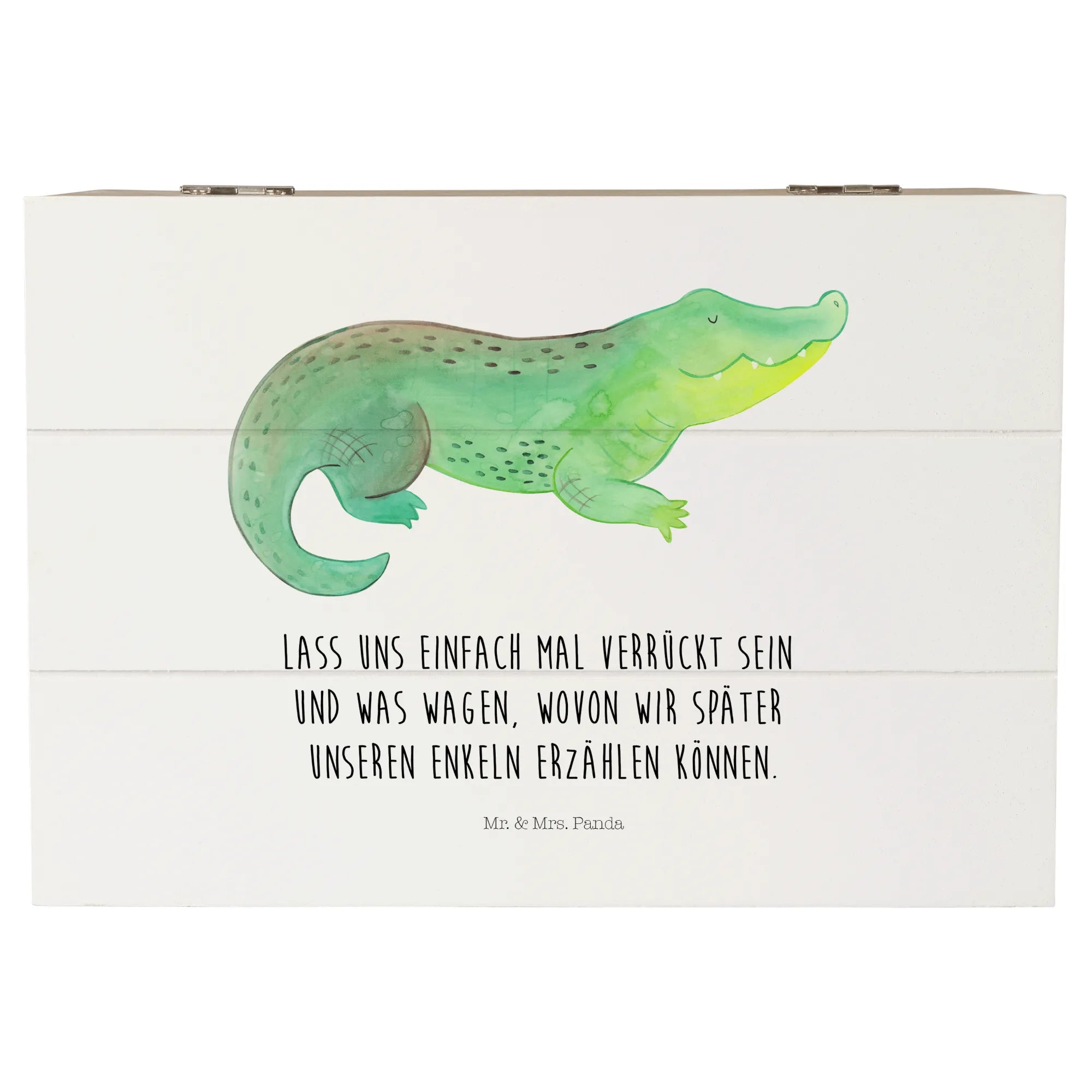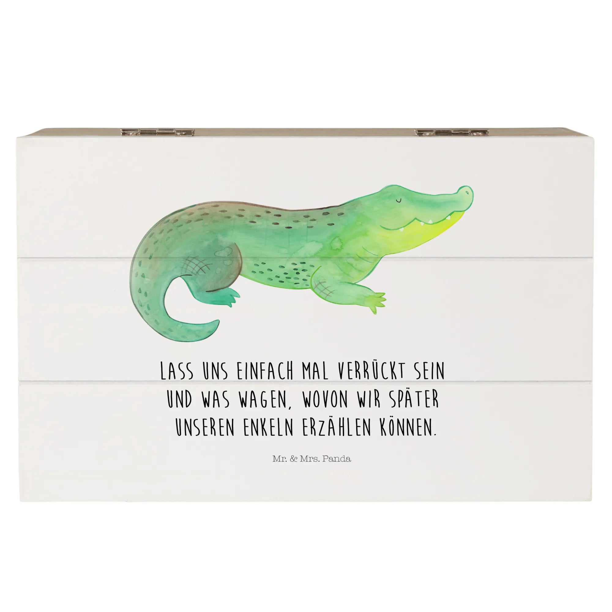 Die wunderschöne Holzkiste mit dem fröhlichen Krokodil-Motiv aus der Meerestiere Kollektion von Mr. & Mrs. Panda ist der perfekte Begleiter für all deine kostbaren Erinnerungen! Mit einem charmanten Slogan, "Lass uns einfach mal verrückt sein und was wagen, wovon wir später unseren Enkeln erzählen können", bringt diese Kiste Abenteuerlust und Spontaneität in dein Zuhause.
