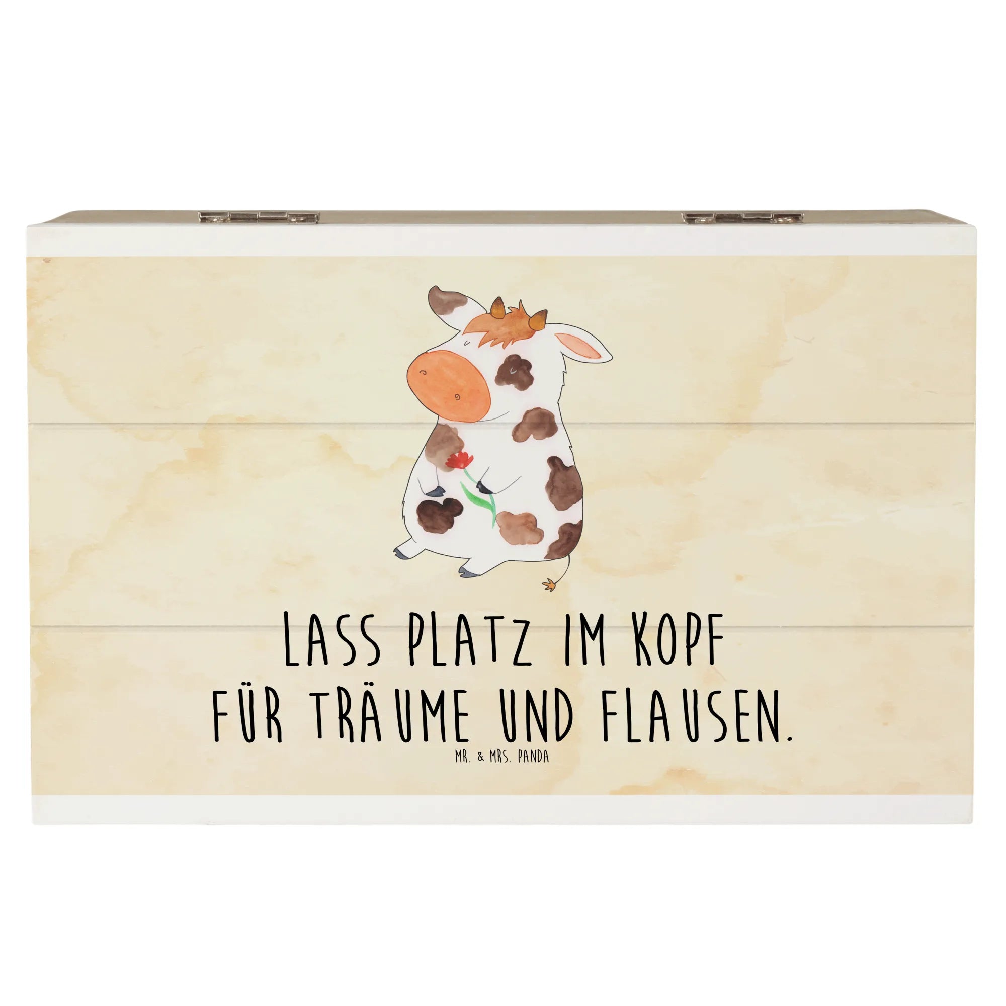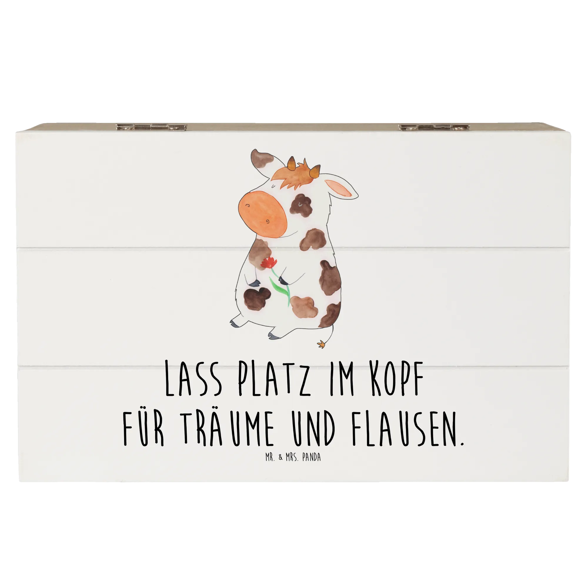 Die stabile Holzkiste hat die perfekten Maße von 22 cm x 15 cm und bietet ausreichend Platz für all deine Erinnerungen: ob Fotos, kleine Geschenke oder Andenken von besonderen Anlässen. Der niedliche Kuh-Aufdruck, der von Mrs. Panda mit viel Liebe handgezeichnet wurde, verleiht der Kiste einen besonderen Charme. Und der dazugehörige Spruch "Lass Platz im Kopf für Träume und Flausen" spricht für sich!