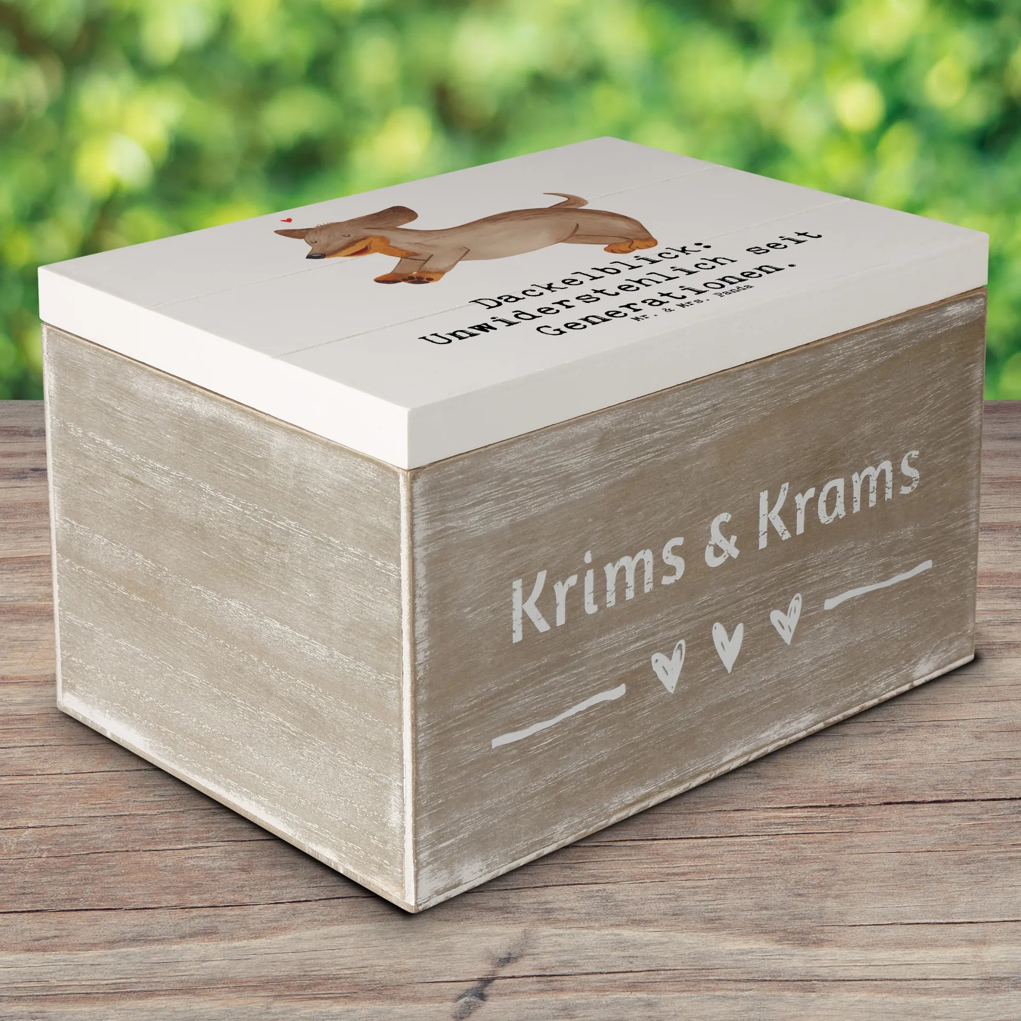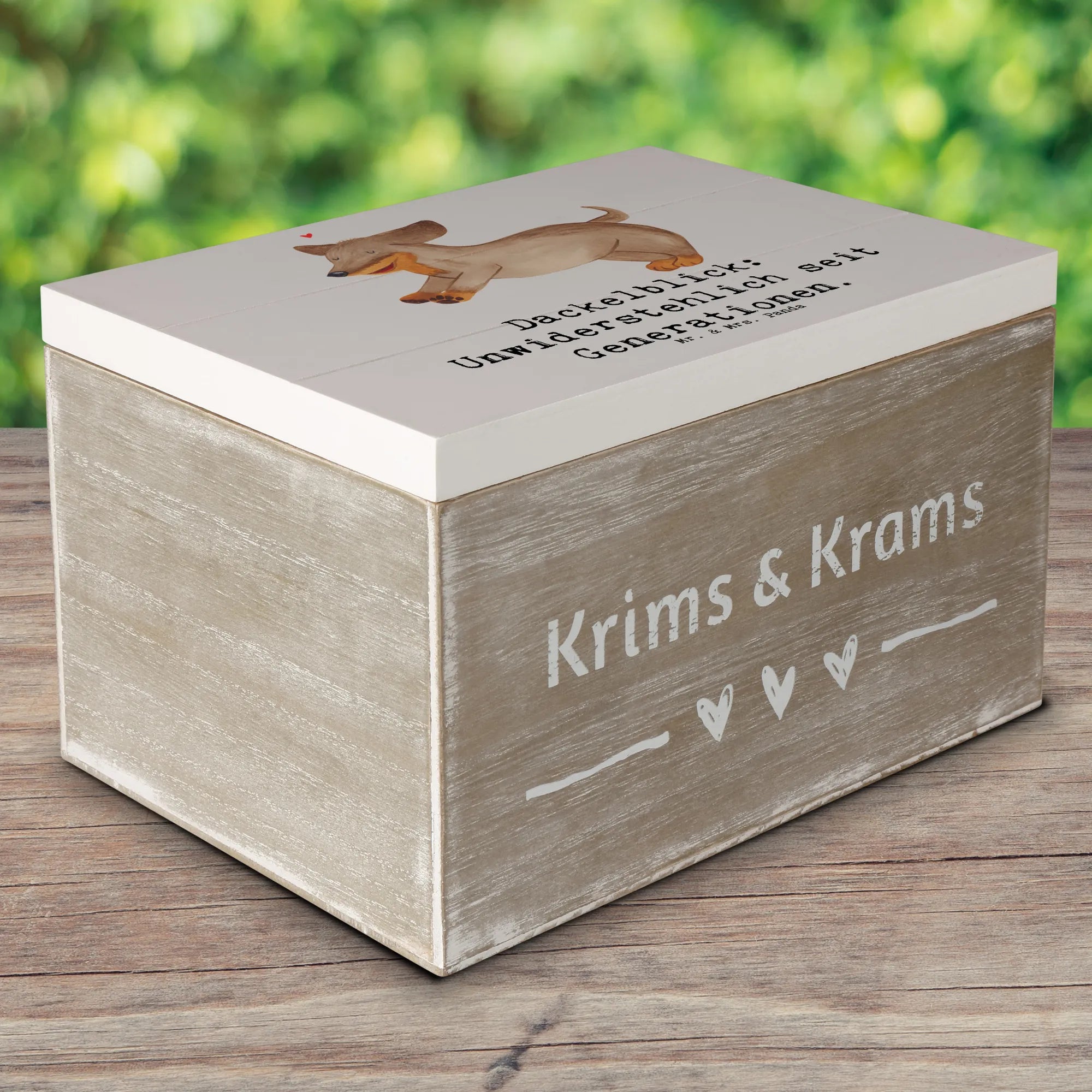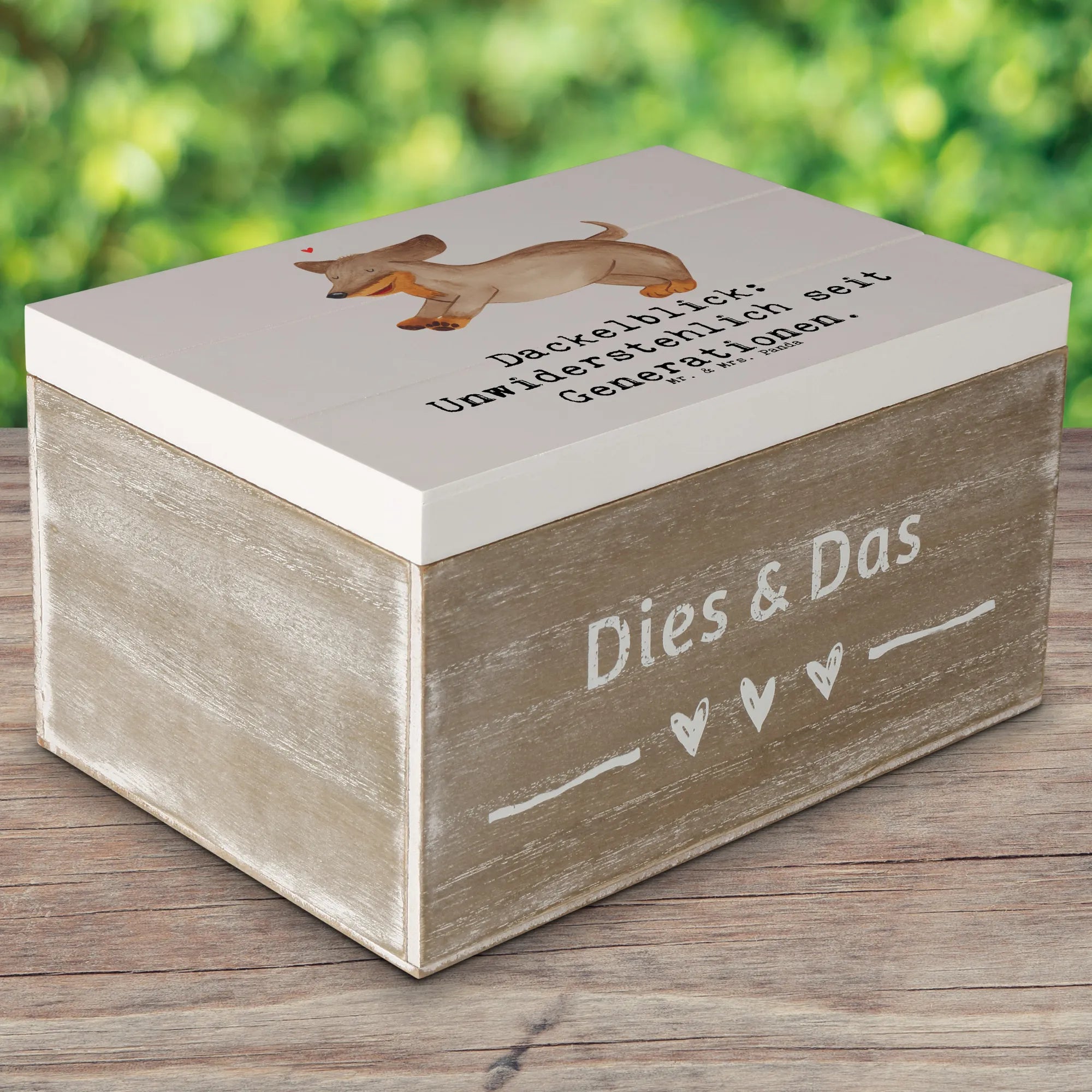Mit der liebevollen Aufschrift 'Dackelblick: Unwiderstehlich seit Generationen.' bringt diese Kiste eine Portion Freude in jedes Zuhause. Sie eignet sich hervorragend als Aufbewahrungsort für Erinnerungen, Schätze und Fotos oder als stilvolle Dekokiste.