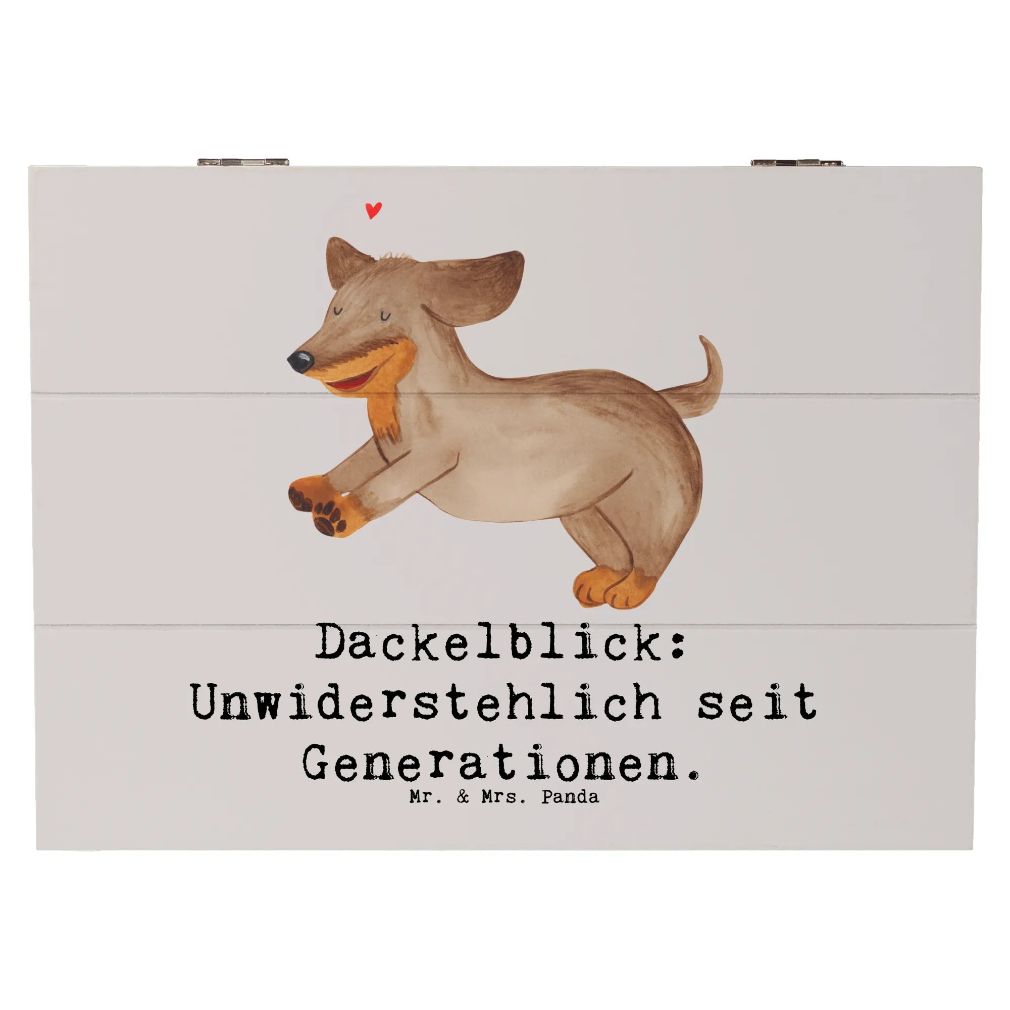 Die wunderschöne Holzkiste von Mr. & Mrs. Panda ist der perfekte Ort, um all deine kostbaren Erinnerungen sicher aufzubewahren. Diese besondere Kiste wird mit einem bezaubernden Motiv des Kurzhaardackels dekoriert, das nicht nur das Herz aller Hundefreunde höherschlagen lässt, sondern auch mit dem Spruch "Dackelblick: Unwiderstehlich seit Generationen." glänzt. Egal, ob du die Kiste als Erinnerungskiste für unvergessliche Momente, als Schatztruhe für persönlichen Krimskrams oder einfach als stilvolle Dekokiste verwenden möchtest – sie ist immer ein wahrer Hingucker!
