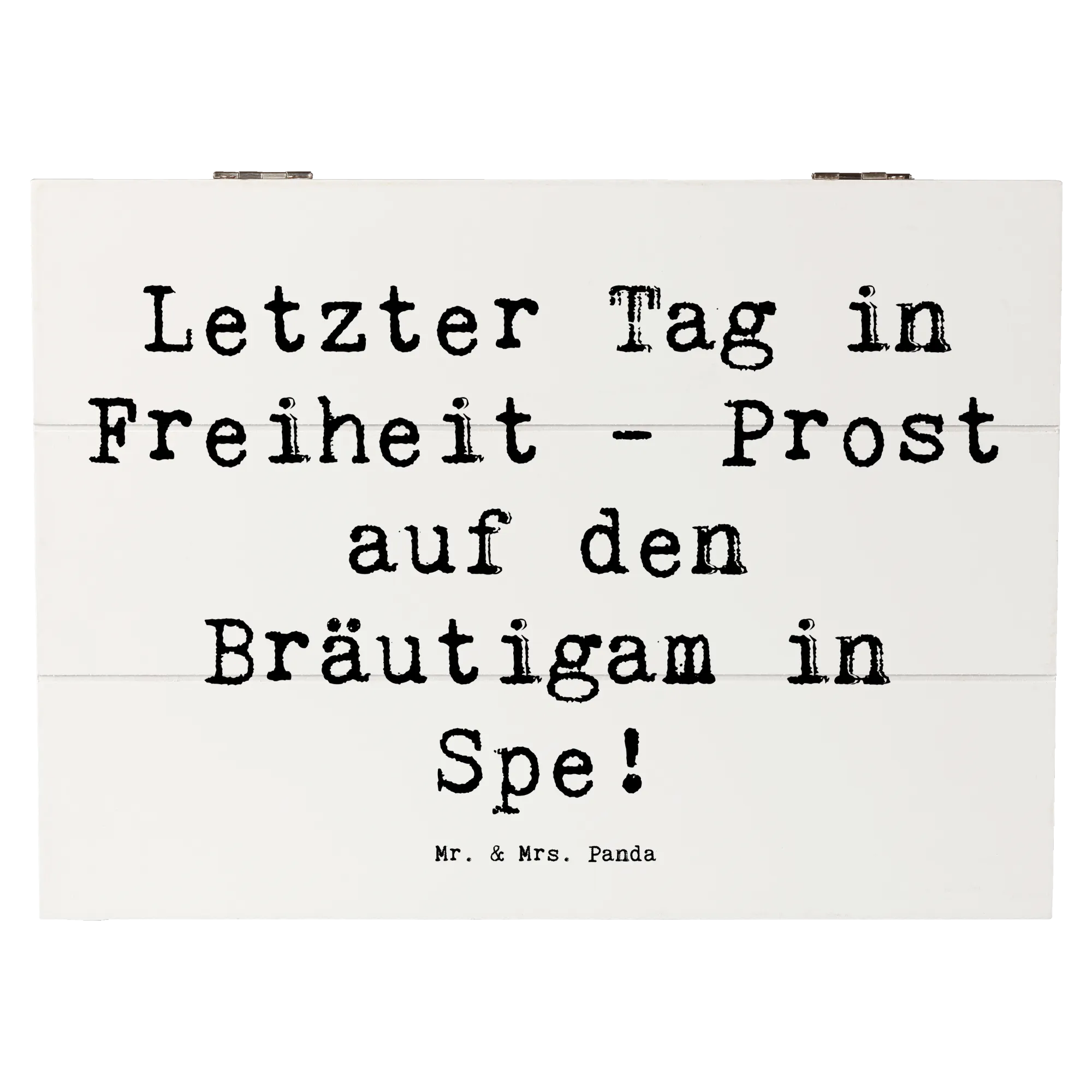 Mr. & Mrs. Panda Holzkiste Junggesellenabschied – die perfekte Mischung aus Witz und Erinnerung. Mit dem Spruch "Letzter Tag in Freiheit - Prost auf den Bräutigam in Spe!" ist diese Aufbewahrungsbox Holz ein wunderbares Geschenk für alle, die den Junggesellenabschied feiern oder nach einer besonderen Hochzeit Geschenkbox suchen.