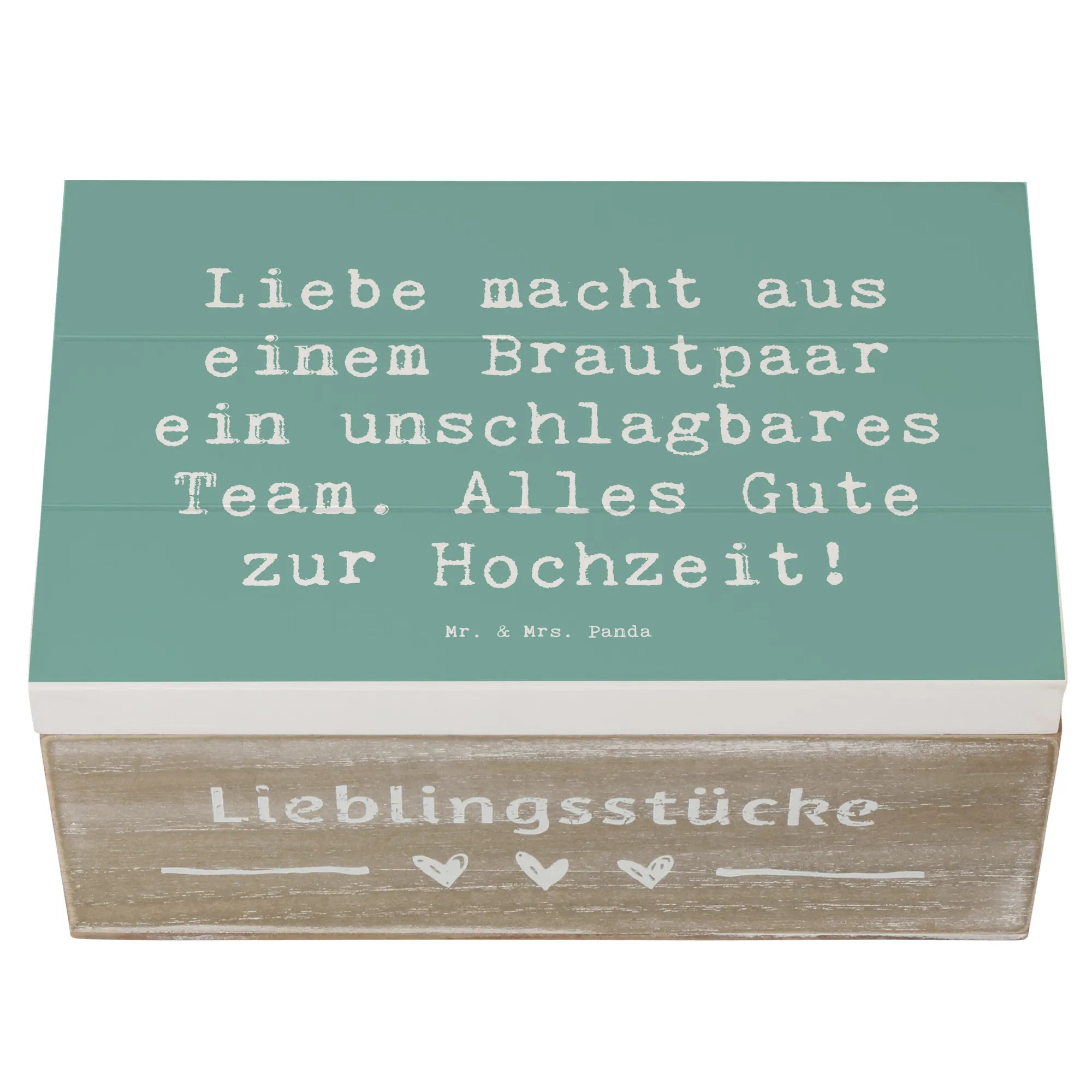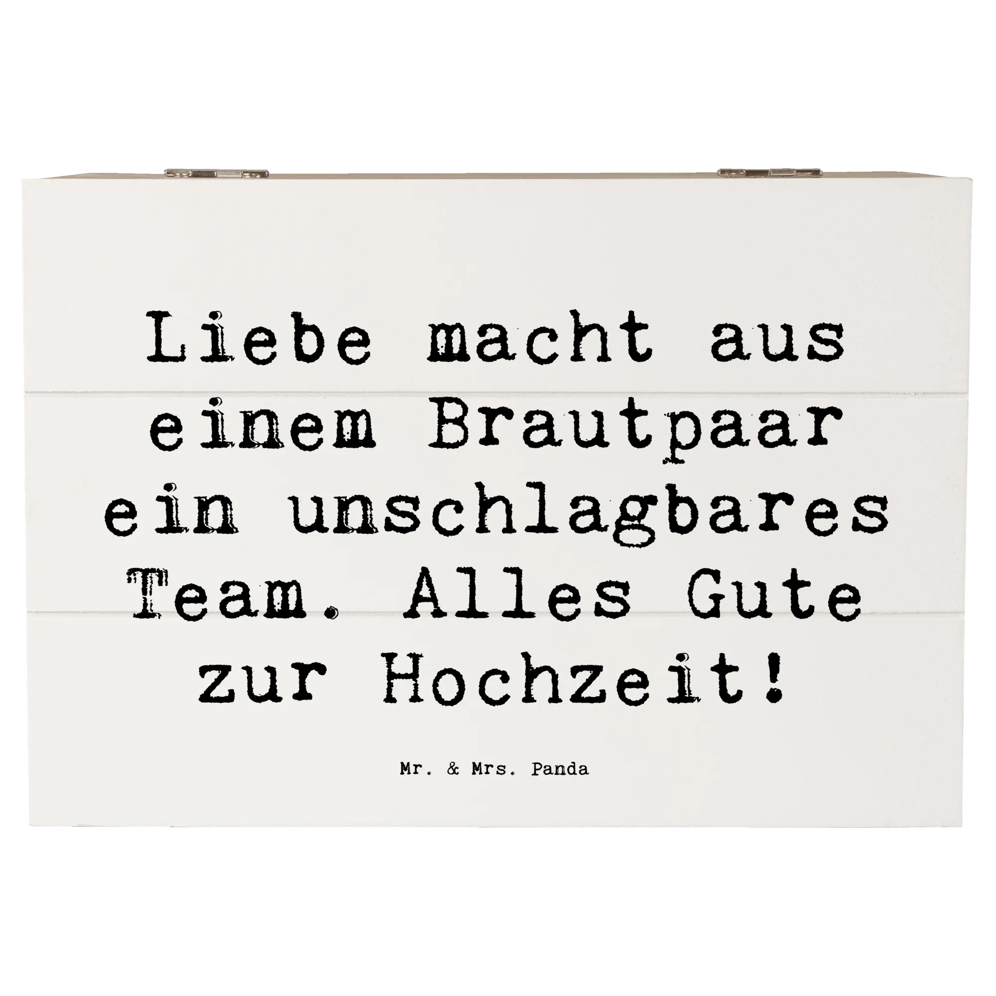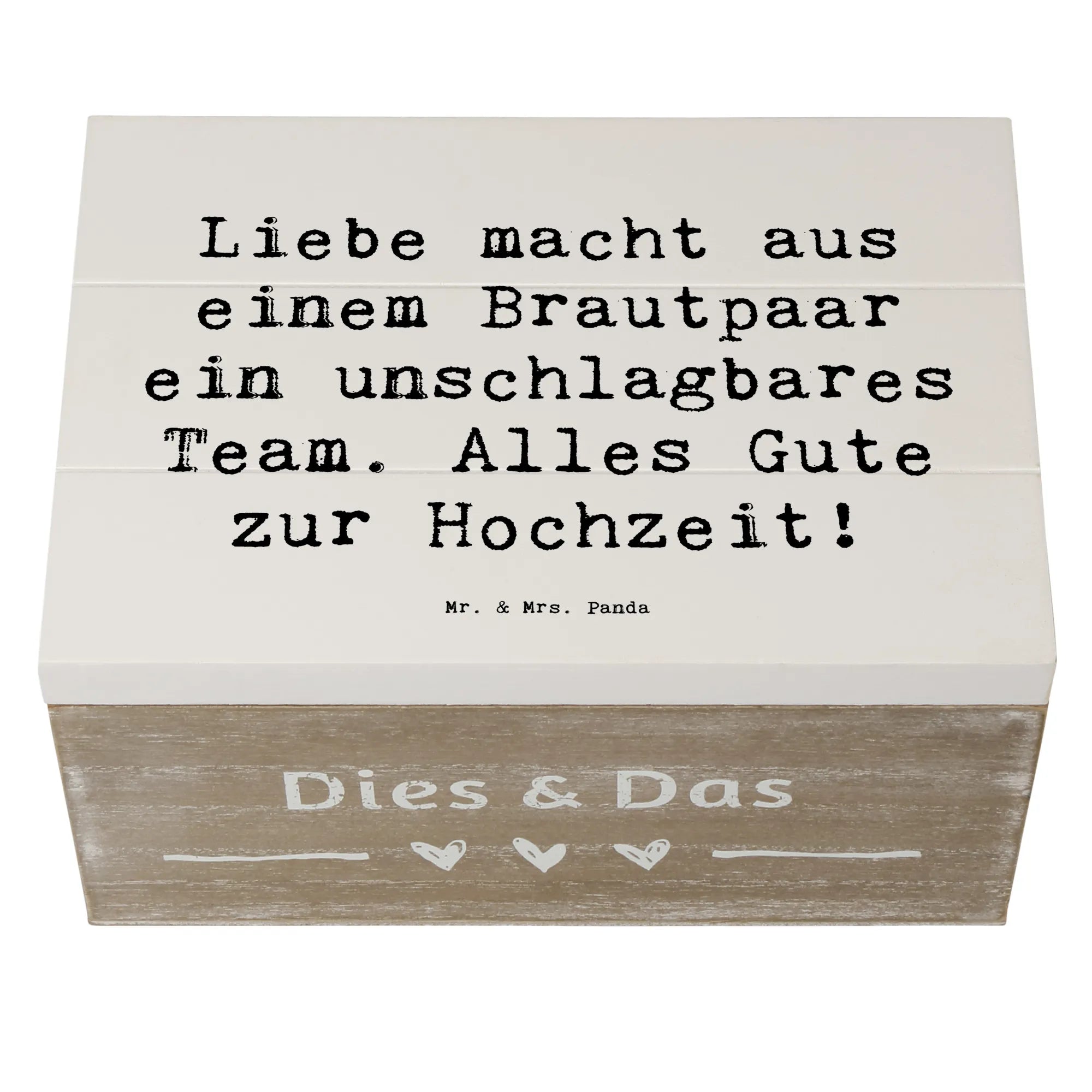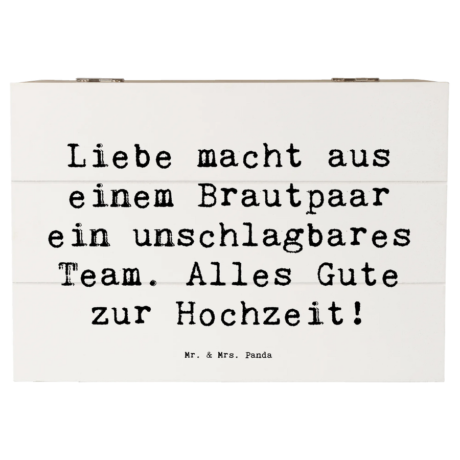 Die wunderschöne Holzkiste von Mr. & Mrs. Panda mit dem einzigartigen Motiv 'Brautpaar' ist das perfekte Geschenk für jeden Hochzeitsanlass! Sie ist liebevoll gestaltet und trägt den schönen Spruch: 'Liebe macht aus einem Brautpaar ein unschlagbares Team. Alles Gute zur Hochzeit!' Diese Erinnerungskiste eignet sich hervorragend, um die schönsten Momente des großen Tages aufzubewahren.