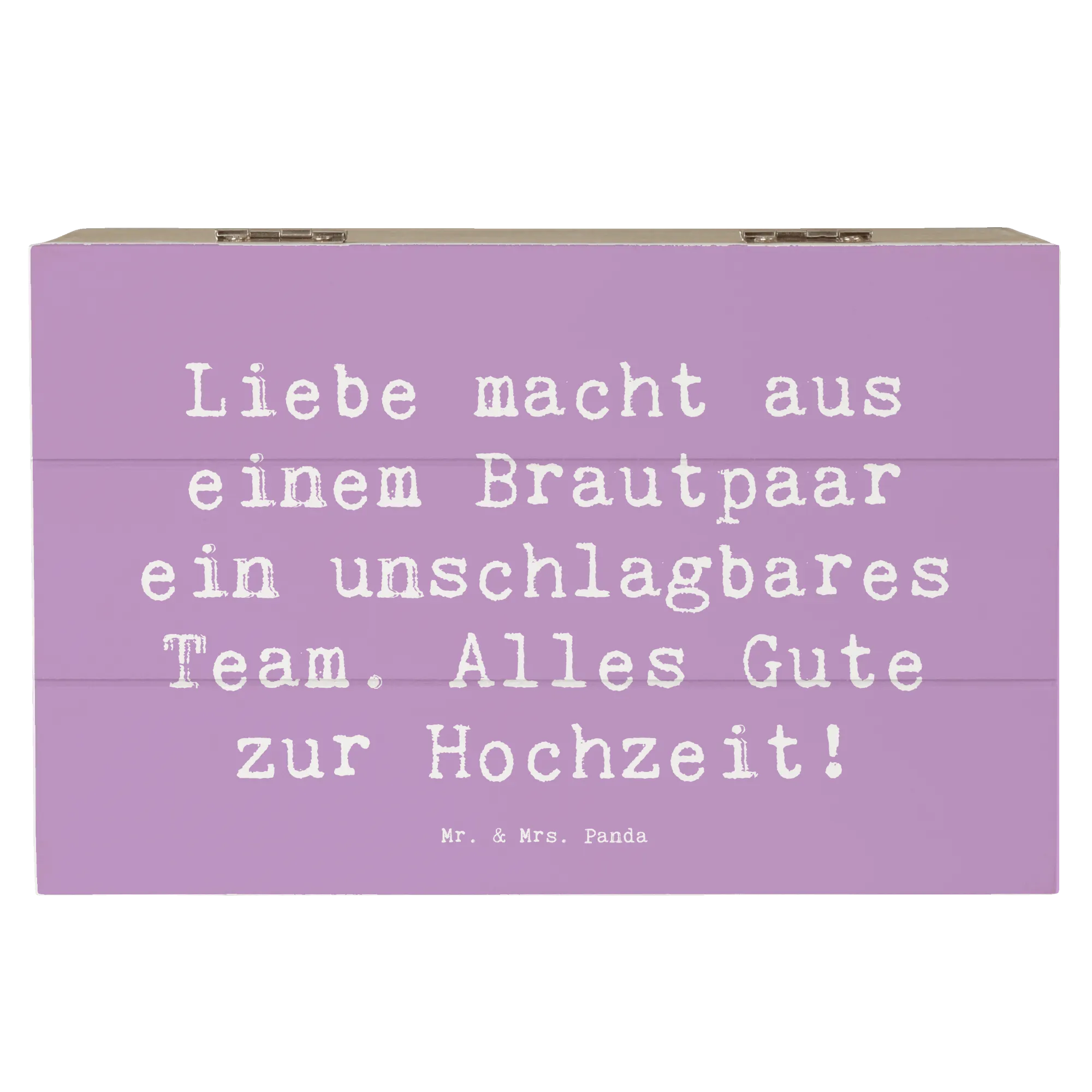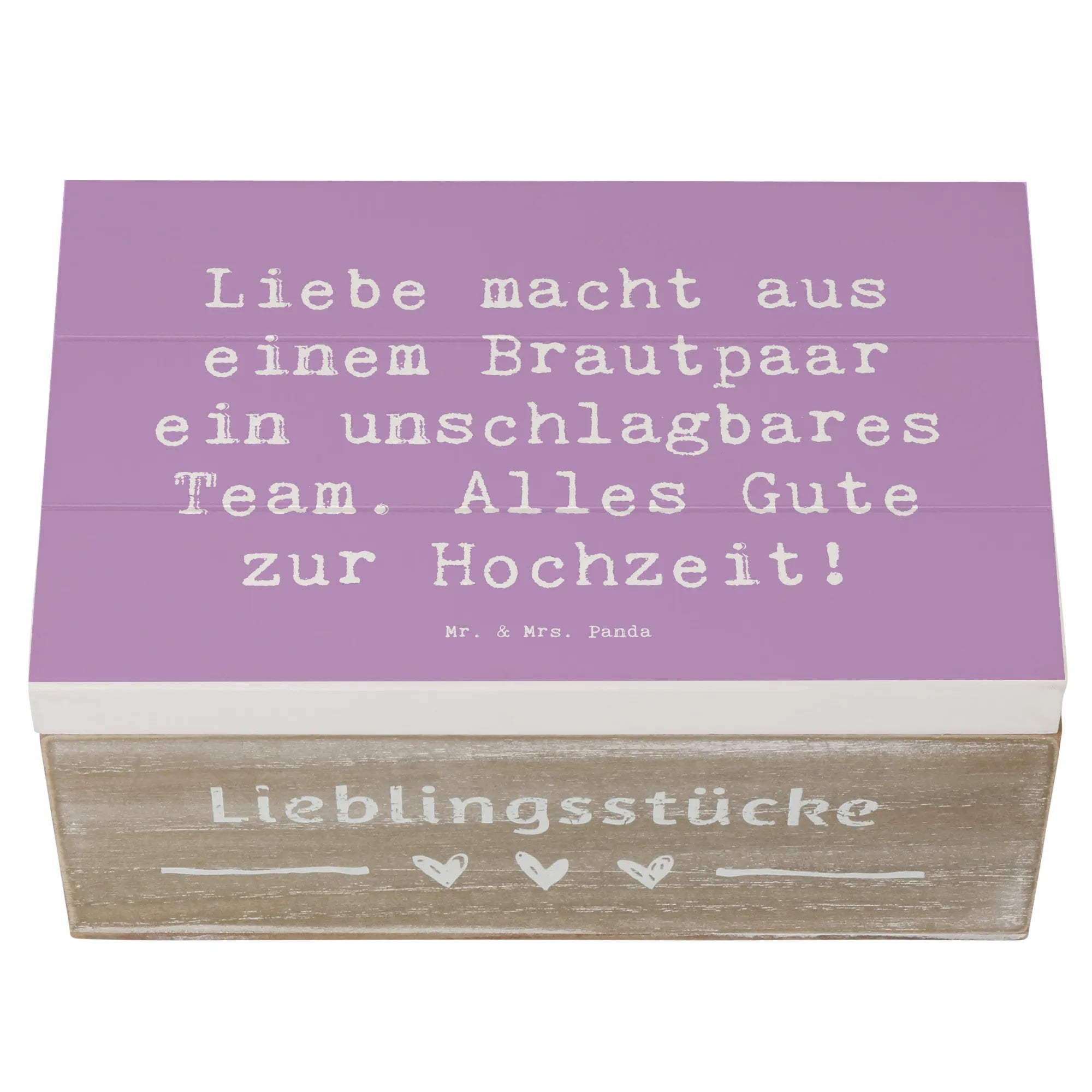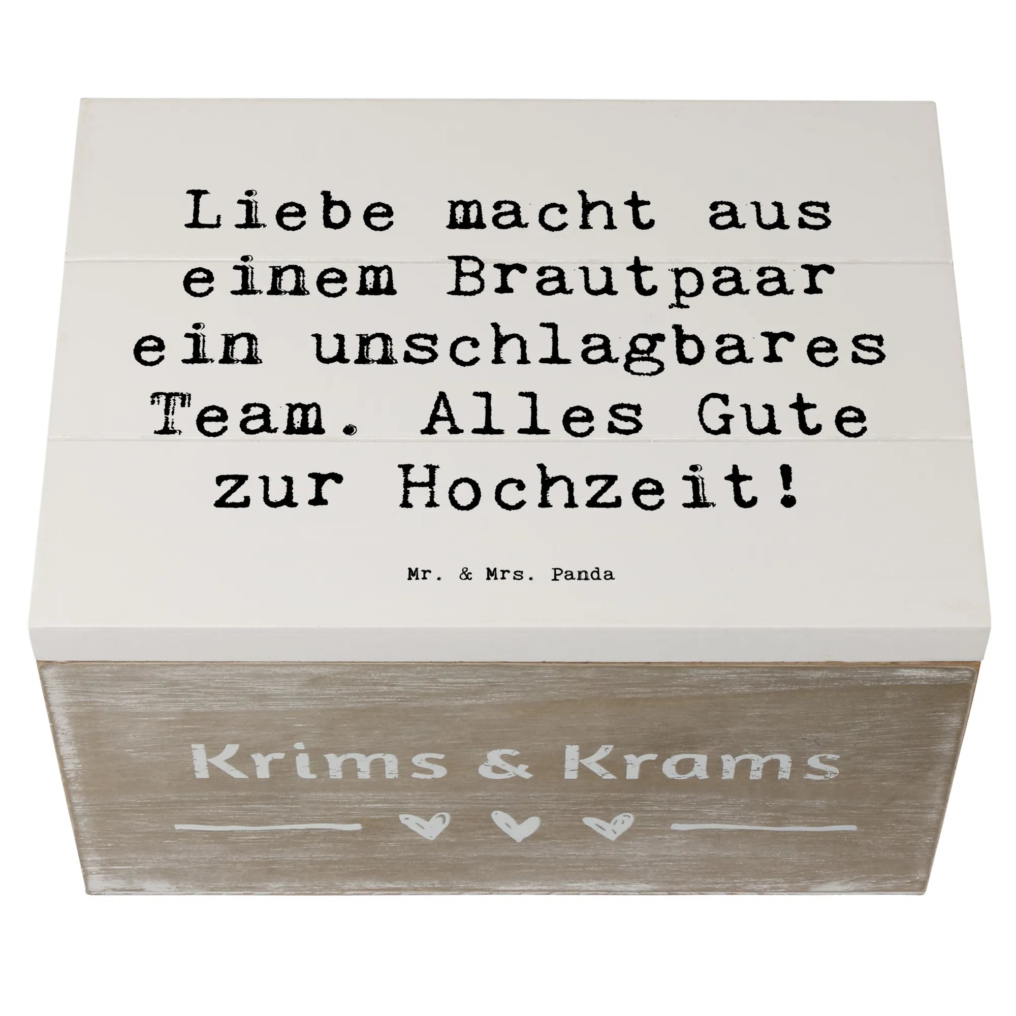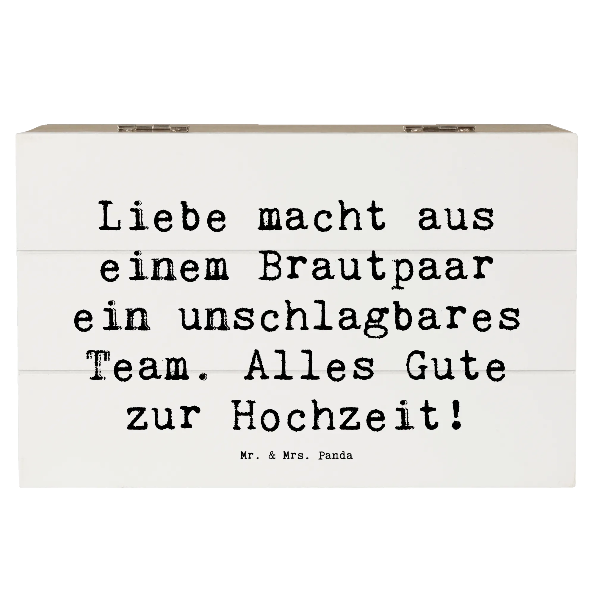 Die wunderschöne Holzkiste von Mr. & Mrs. Panda mit dem einzigartigen Motiv 'Brautpaar' ist das perfekte Geschenk für jeden Hochzeitsanlass! Sie ist liebevoll gestaltet und trägt den schönen Spruch: 'Liebe macht aus einem Brautpaar ein unschlagbares Team. Alles Gute zur Hochzeit!' Diese Erinnerungskiste eignet sich hervorragend, um die schönsten Momente des großen Tages aufzubewahren.