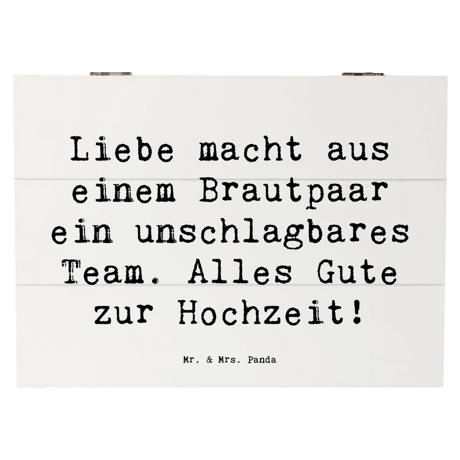 Entdecke die zauberhafte Holzkiste von Mr. & Mrs. Panda, die sich perfekt als Erinnerungskiste für das Brautpaar eignet! Mit dem liebevollen Slogan 'Liebe macht aus einem Brautpaar ein unschlagbares Team. Alles Gute zur Hochzeit!' ist diese Kiste ein ganz besonderes Geschenk zur Hochzeit. Ideal, um all die wundervollen Schätze und Erinnerungen zu bewahren, die an diesen besonderen Tag erinnern.