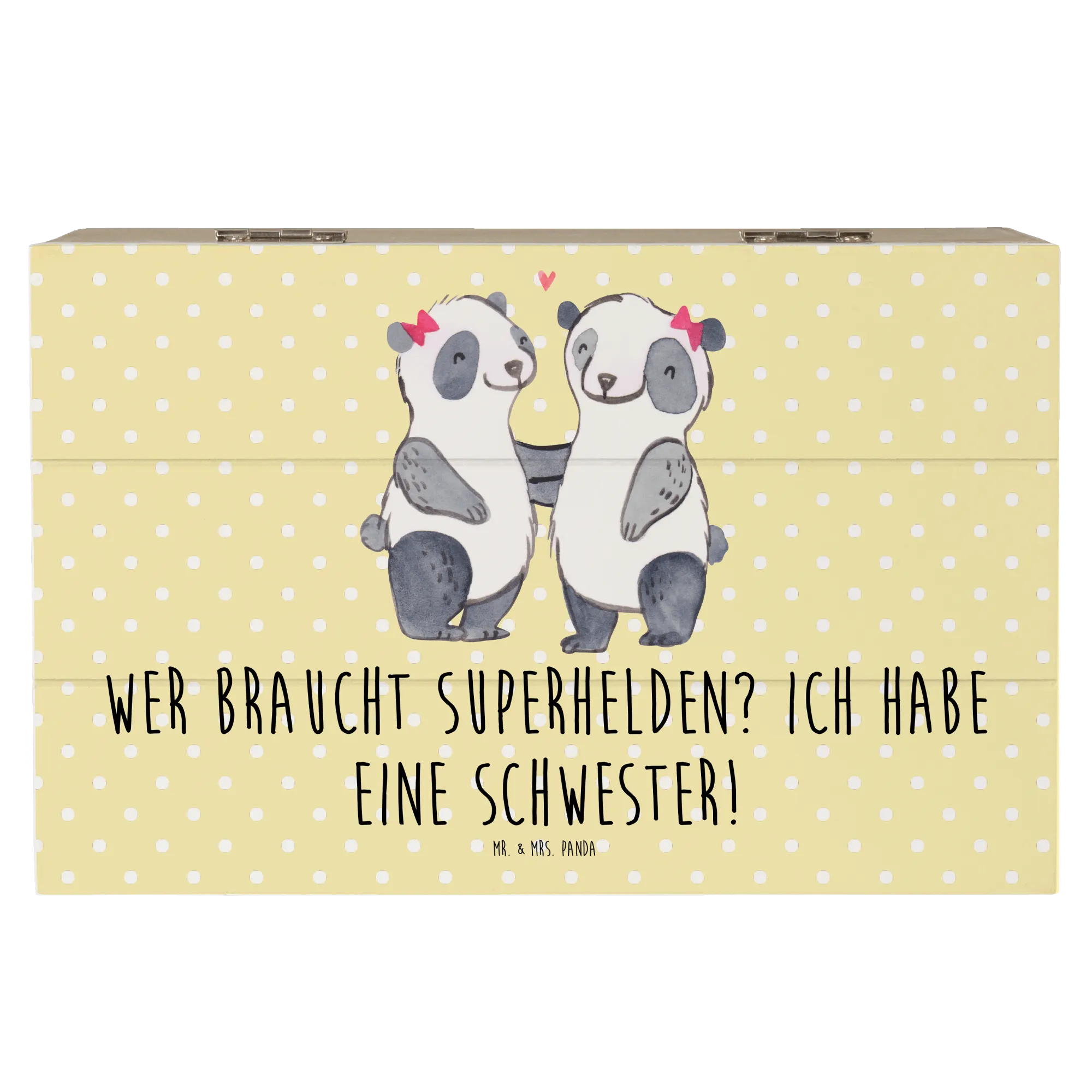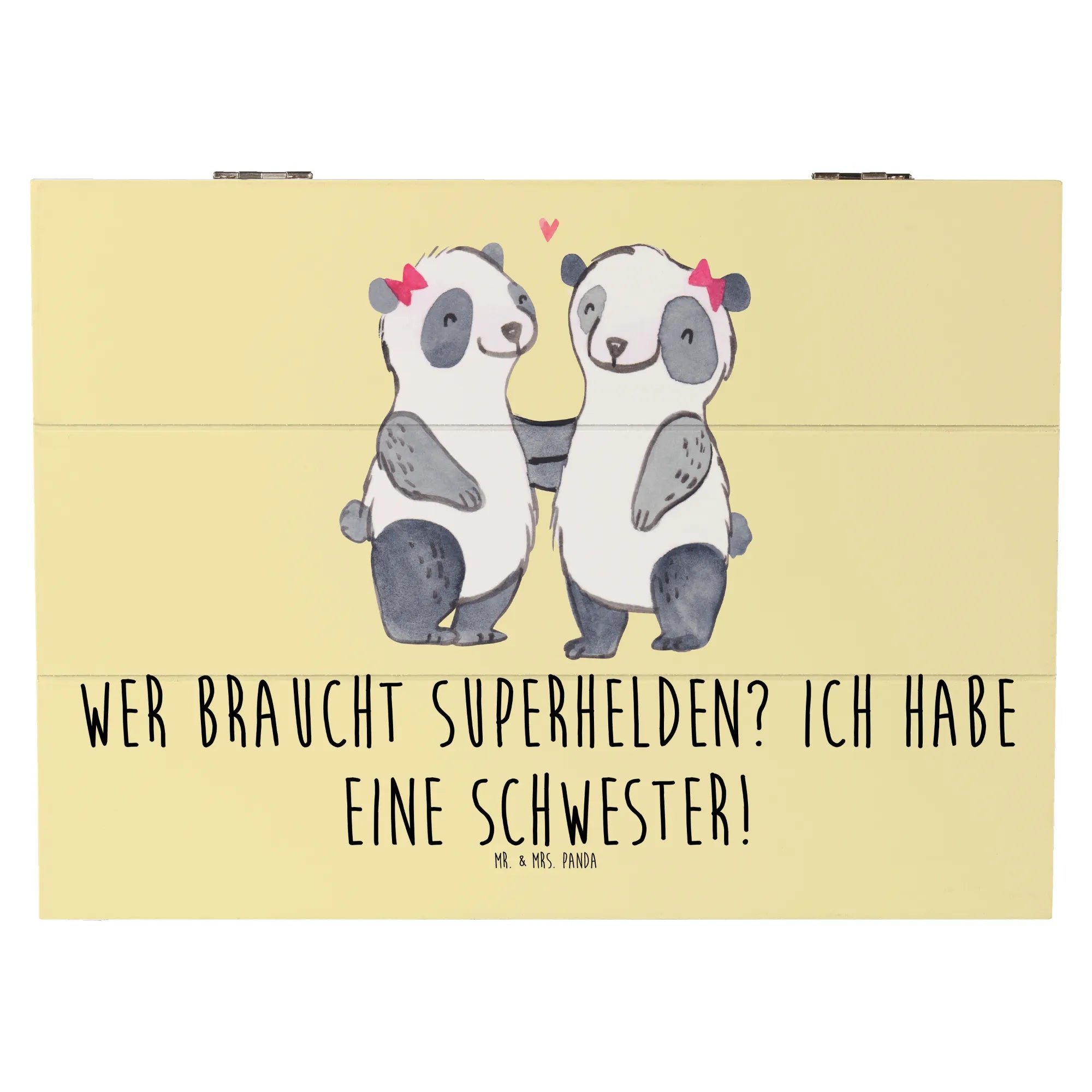 Mit ihrer hellgelben, pastellfarbenen Ausstrahlung fügt sich die Kiste harmonisch in jede Einrichtung ein und sorgt für gute Laune. Eine tolle Geschenkidee für Weihnachten, als Dankeschön für deine Schwester oder einfach nur so, um zu sagen, wie wertvoll sie für dich ist! Pflegeleicht, ebenso schnell abwischbar und durch die hochwertigen Materialien langlebig, kann diese Holzkiste ein Teil eures Familienerbes werden und über Generationen hinweg Geschichten erzählen. Verschenke also ein Stück Liebe und Emotion mit der Holzkiste „Schwester“ von Mr. & Mrs. Panda!