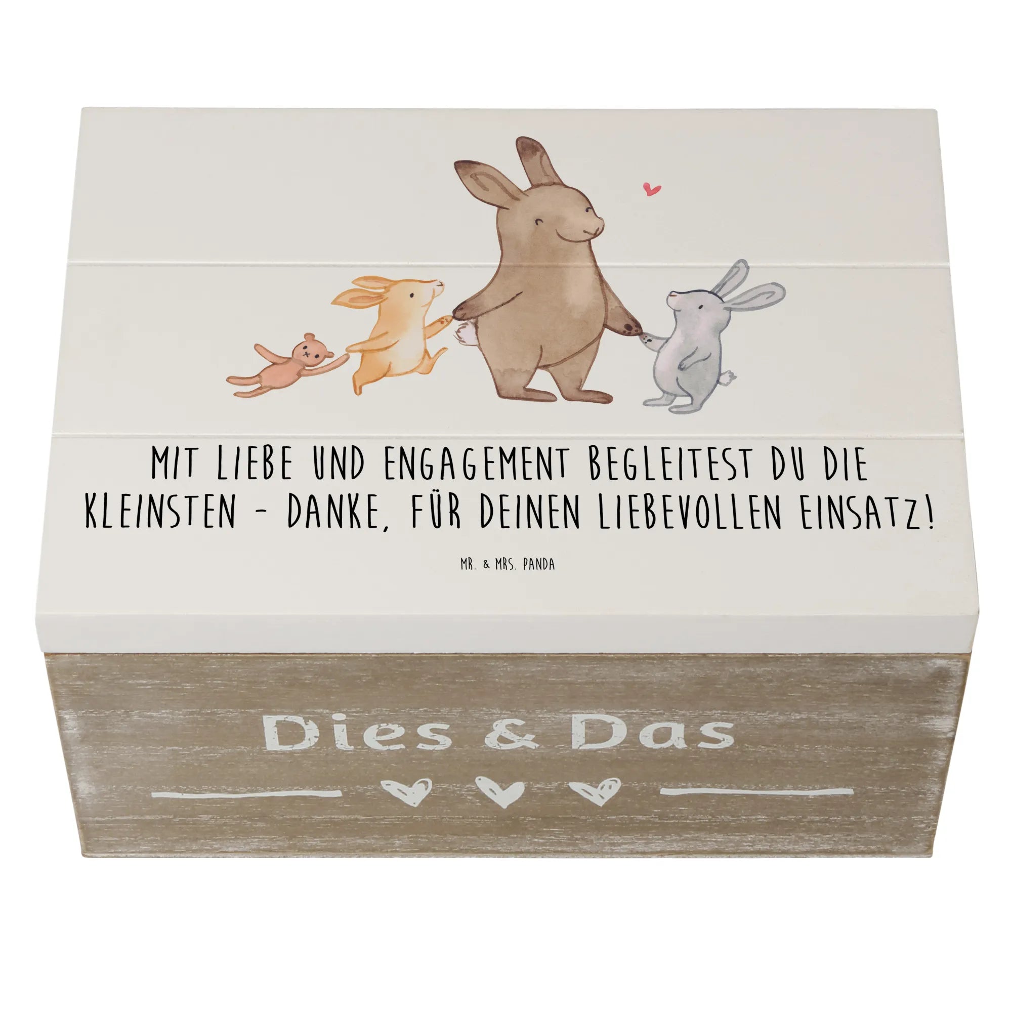 Die wunderschöne Holzkiste von Mr. & Mrs. Panda ist das ideale Geschenk für Erzieher und Erzieherinnen, die mit Herz und Engagement die Kleinsten begleiten. Diese besondere Erinnerungsbox, bedruckt mit dem liebevollen Slogan "Mit Liebe und Engagement begleitest du die Kleinsten - Danke, für deinen liebevollen Einsatz!", ist perfekt, um wertvolle Schätze, Erinnerungen und besondere Momente festzuhalten. Egal ob für den Kindergarten, die Grundschule oder als Dankeschön zur Kommunion oder Konfirmation - mit dieser Holzkiste sagst du auf herzliche Weise 'Danke'.