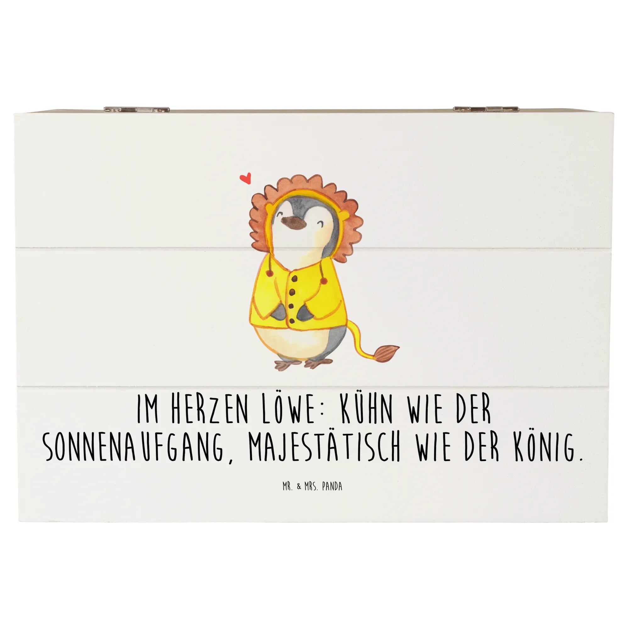 Mit einem außergewöhnlichen Design versprüht diese Kiste Lebensfreude und Charakter. Der handgezeichnete Löwe, schick verpackt im niedlichen Pinguin-Kostüm, bringt ein Lächeln auf jedes Gesicht. Auch der Slogan "Im Herzen Löwe: Kühn wie der Sonnenaufgang, majestätisch wie der König" betont die Stärke und Einzigartigkeit all derjenigen, die im Zeichen des Löwen geboren wurden.