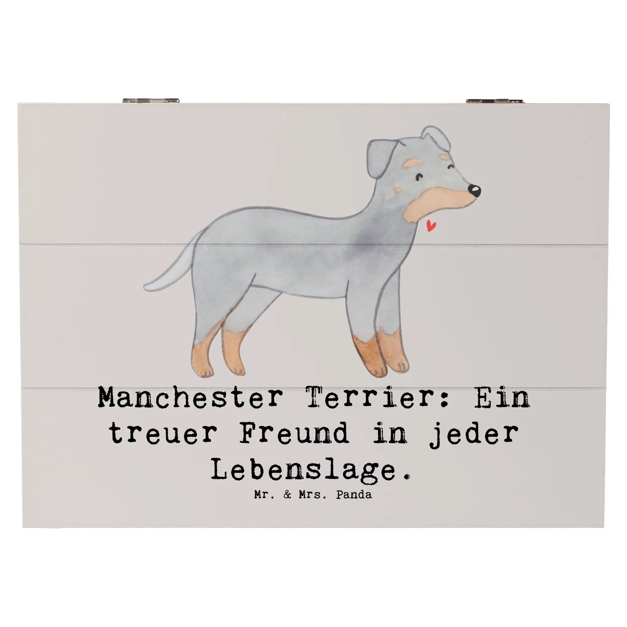 Dank der praktischen Einschlagscharniere lässt sich die Box leicht öffnen und schließen, und die Pflege ist unkompliziert: einfach vorsichtig mit einem feuchten Tuch abwischen. Mach Deinen Liebsten oder Dir selbst eine Freude und verschenke die Holzkiste 'Manchester Terrier'. Die Hunderassen Kollektion von Mr. & Mrs. Panda ist ideal für jeden Hundefan und bringt ein Lächeln in jedes Gesicht, ganz gleich, ob zum Geburtstag, zu Weihnachten oder einfach nur so.