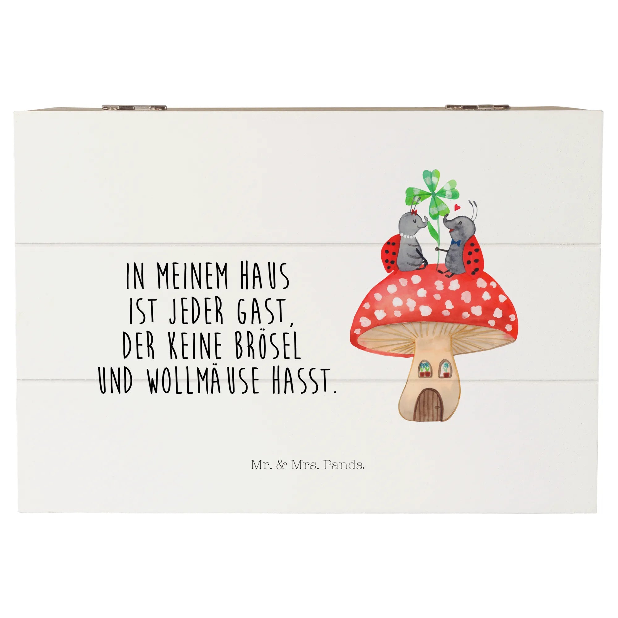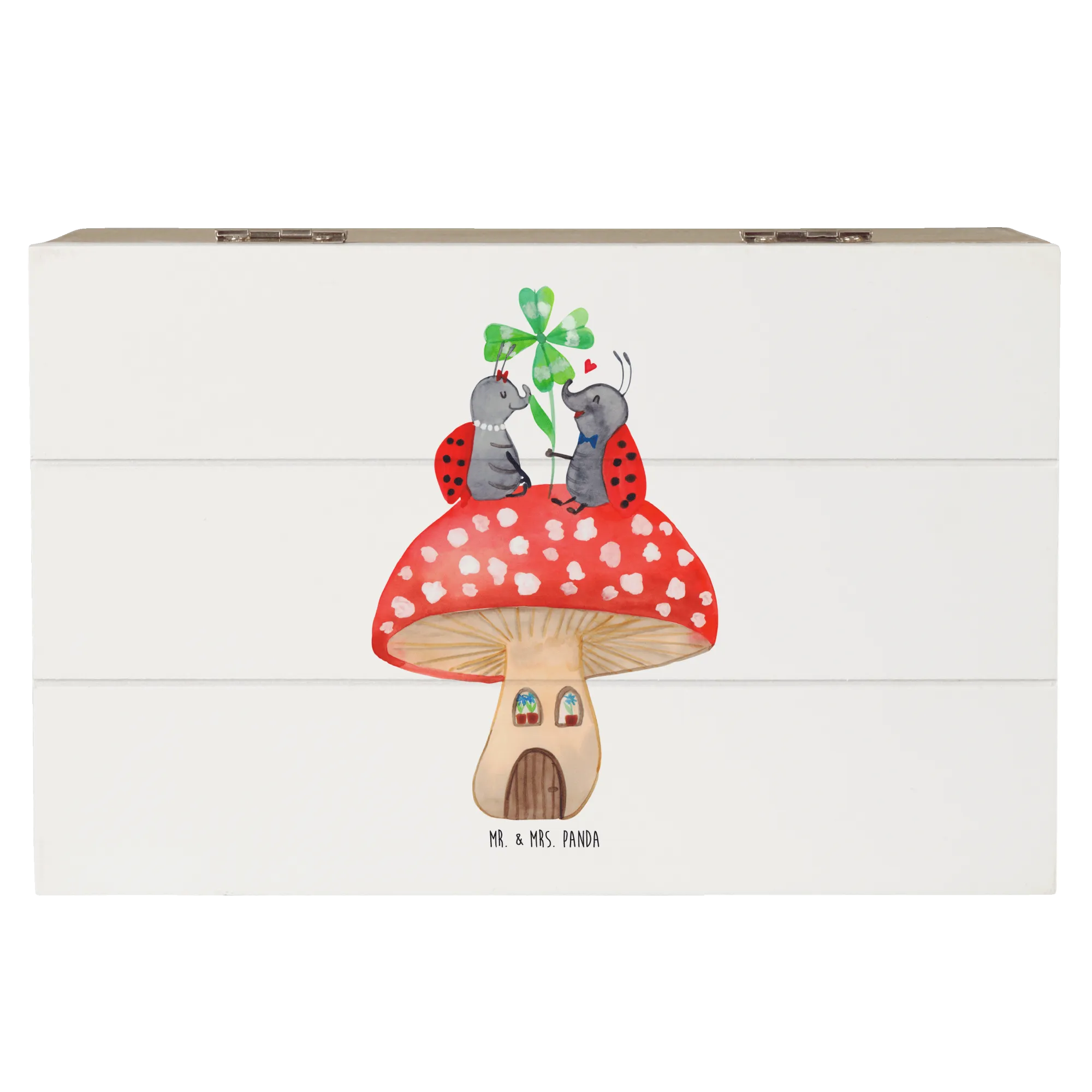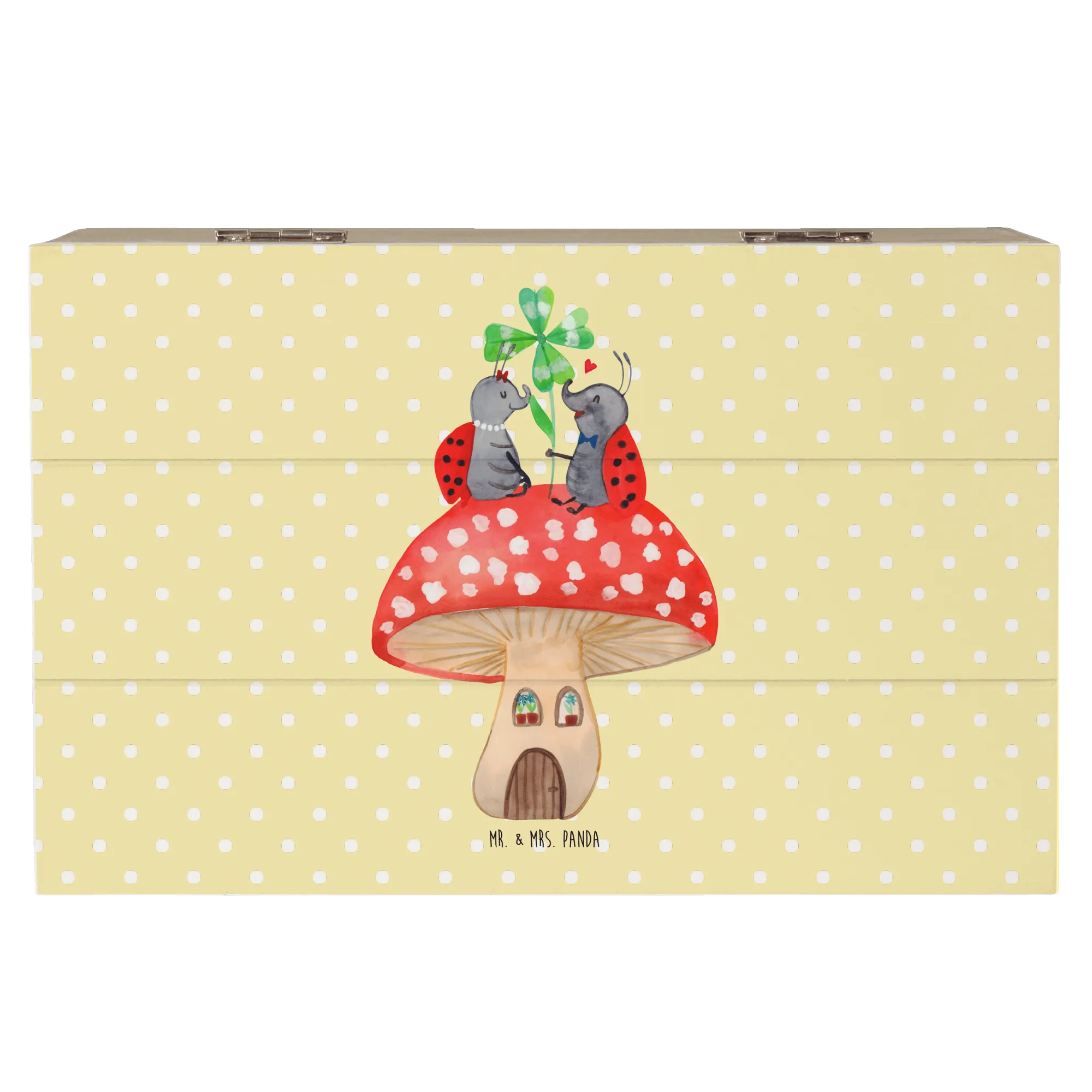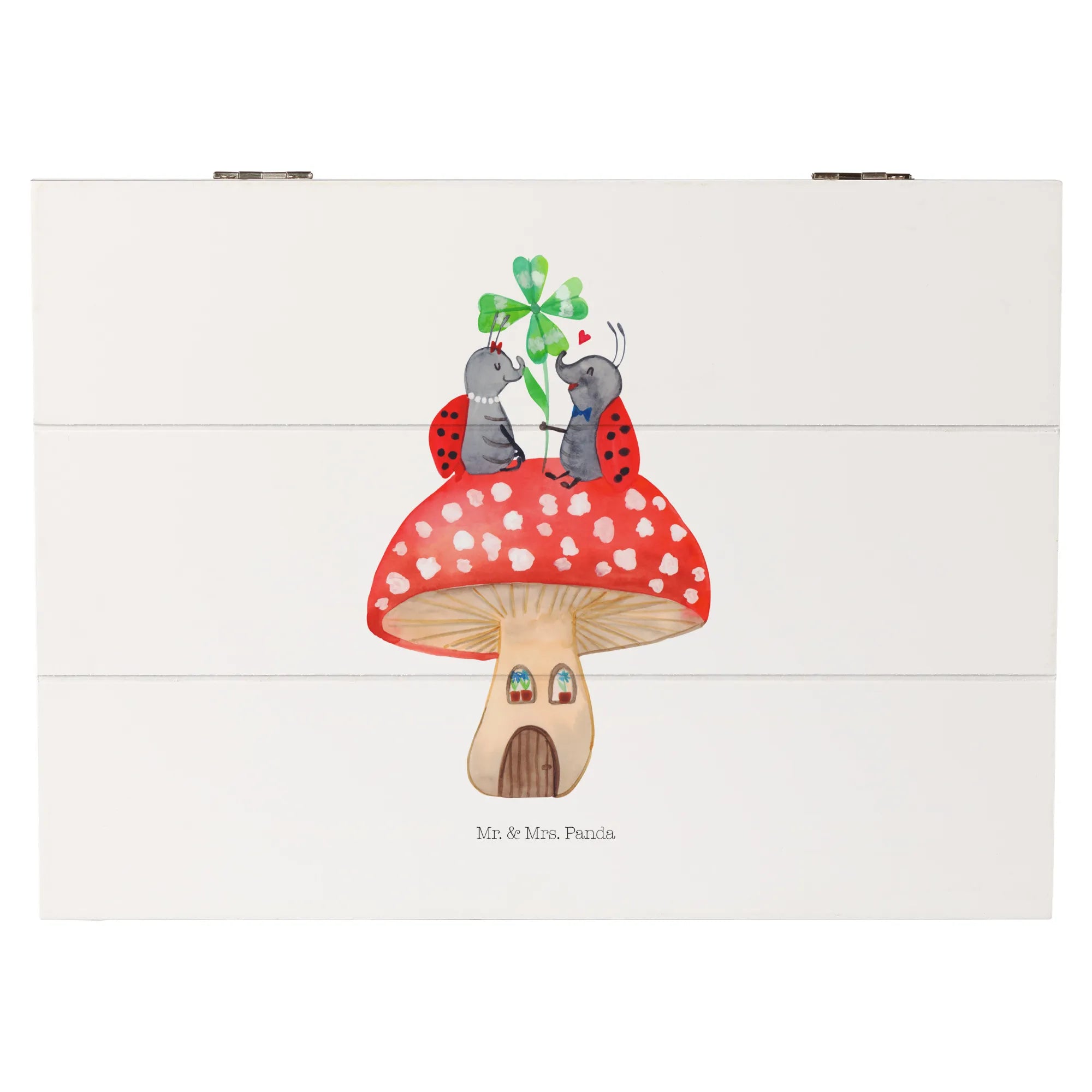 Die Holzkiste "Marienkäfer Paar Fliegenpilz" von Mr. & Mrs. Panda ist mehr als nur eine Kiste – sie ist ein kleiner Schatz, der Erinnerungen bewahrt!