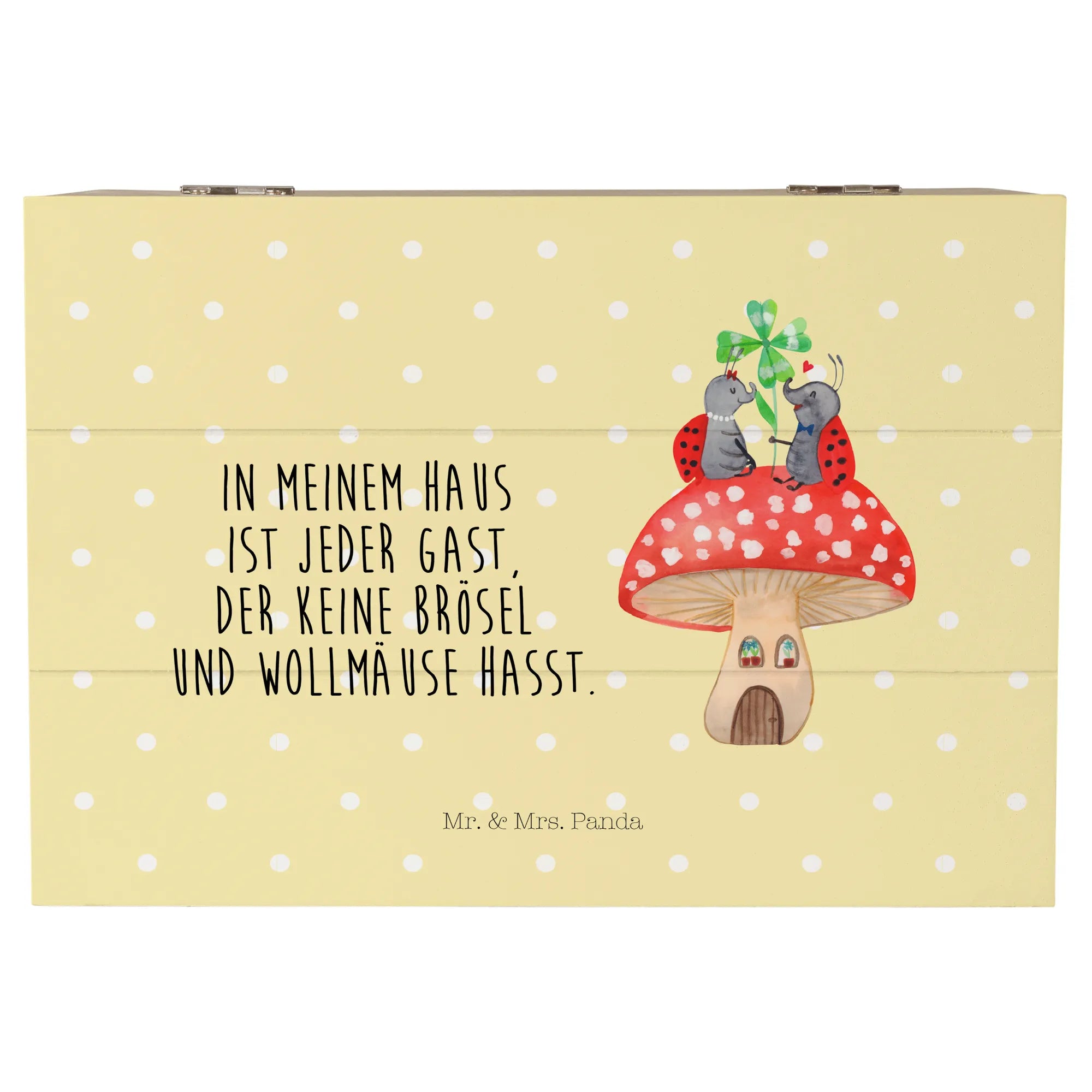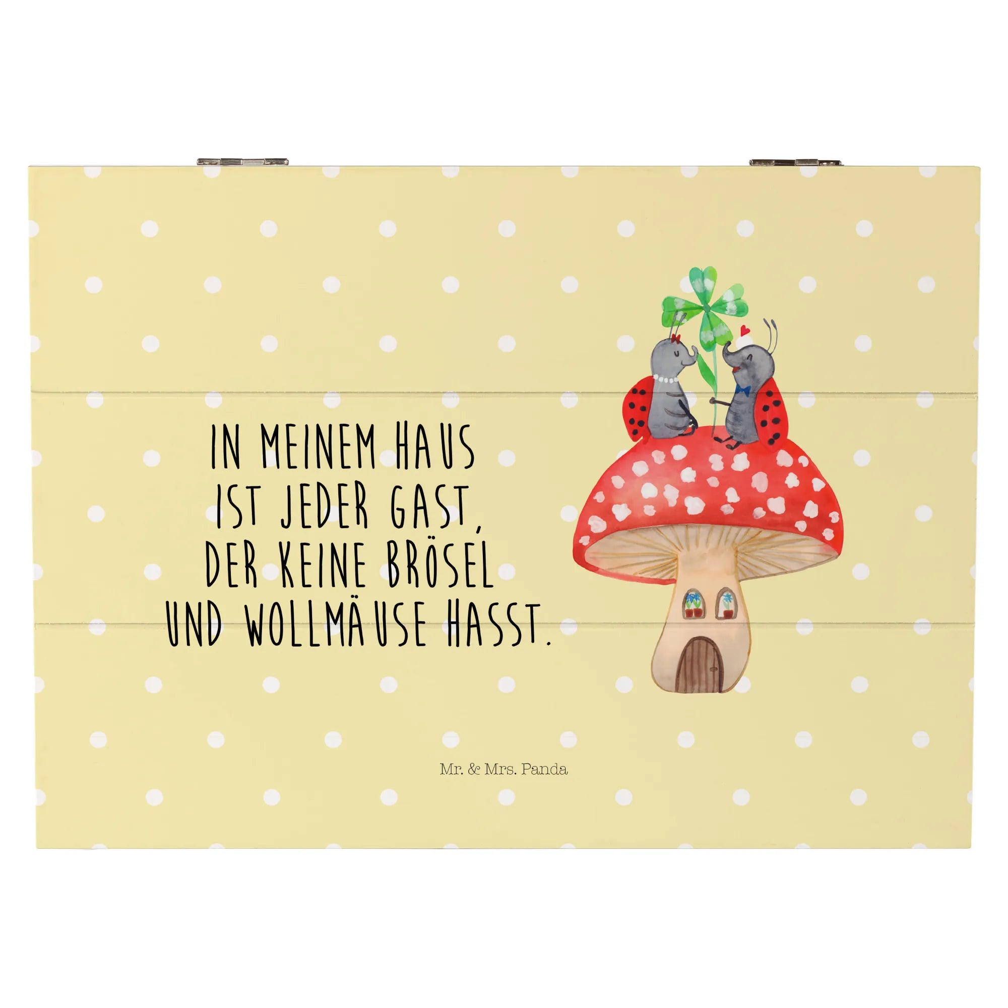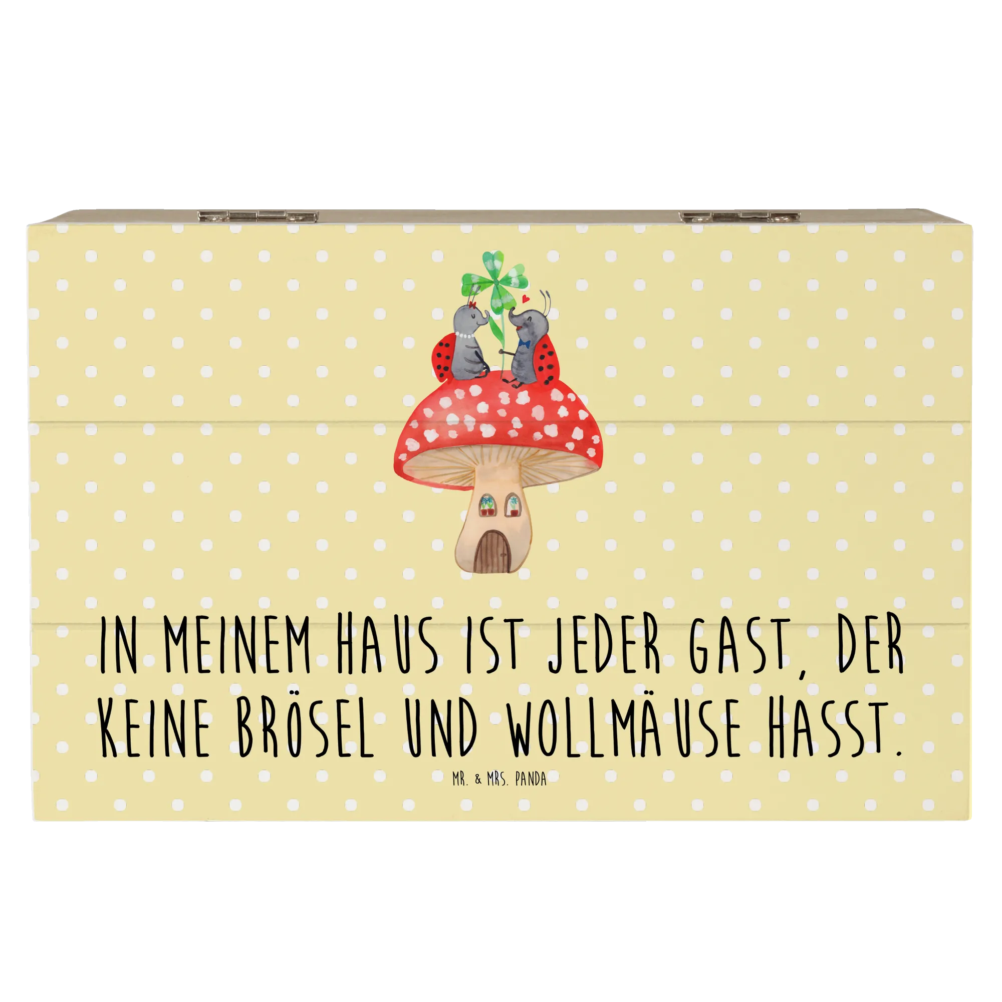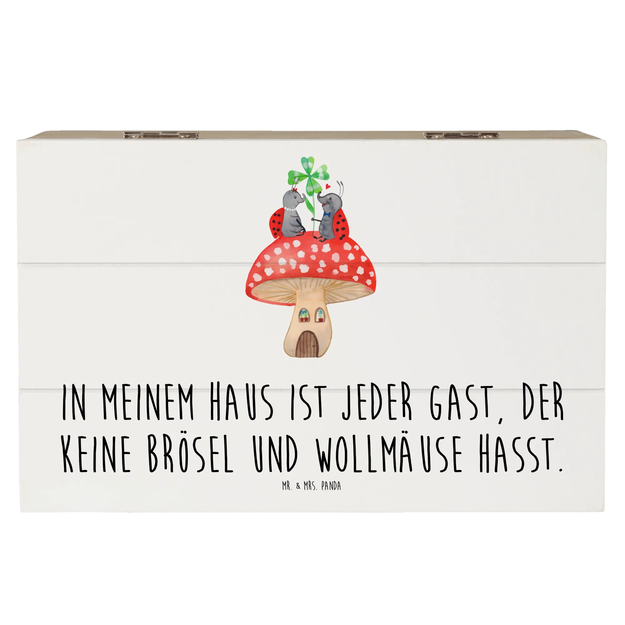 Die Holzkiste "Marienkäfer Paar Fliegenpilz" von Mr. & Mrs. Panda ist mehr als nur eine Kiste – sie ist ein kleiner Schatz, der Erinnerungen bewahrt!