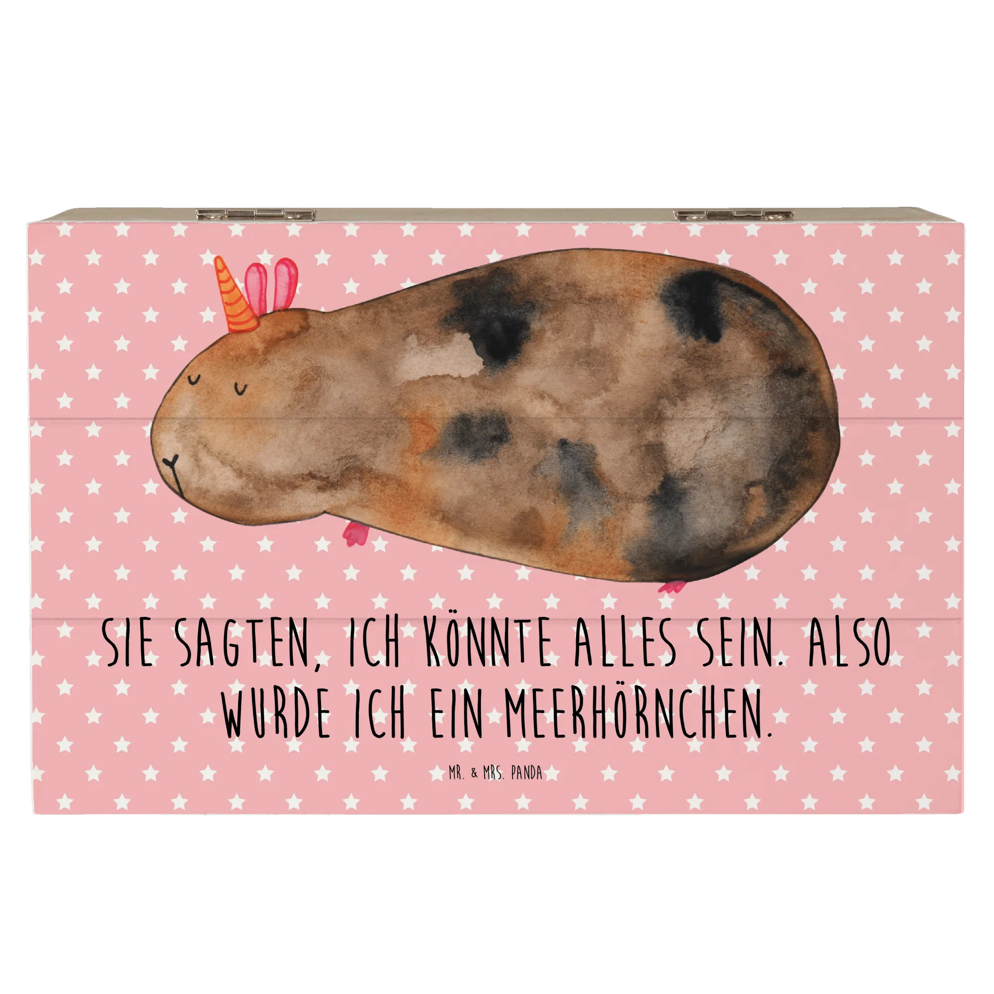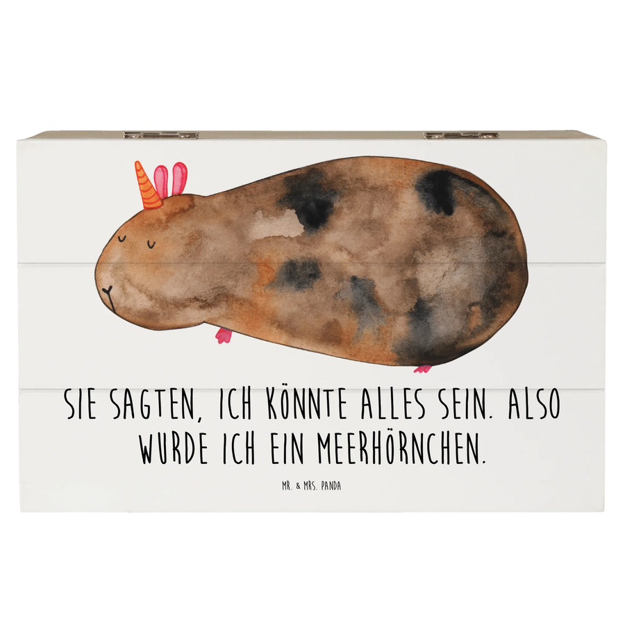 Das bezaubernde Motiv des Meerhörnchens – ein kreatives Mix aus Einhorn und Meerschweinchen – sorgt für ein Lächeln beim Öffnen der Kiste. Der putzige Spruch "Sie sagten, ich könnte alles sein. Also wurde ich ein Meerhörnchen." macht diese Kiste zu einem ganz besonderen Geschenk!