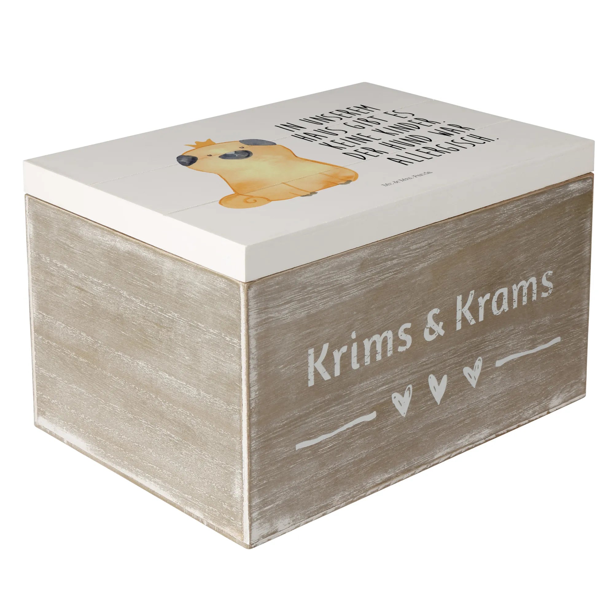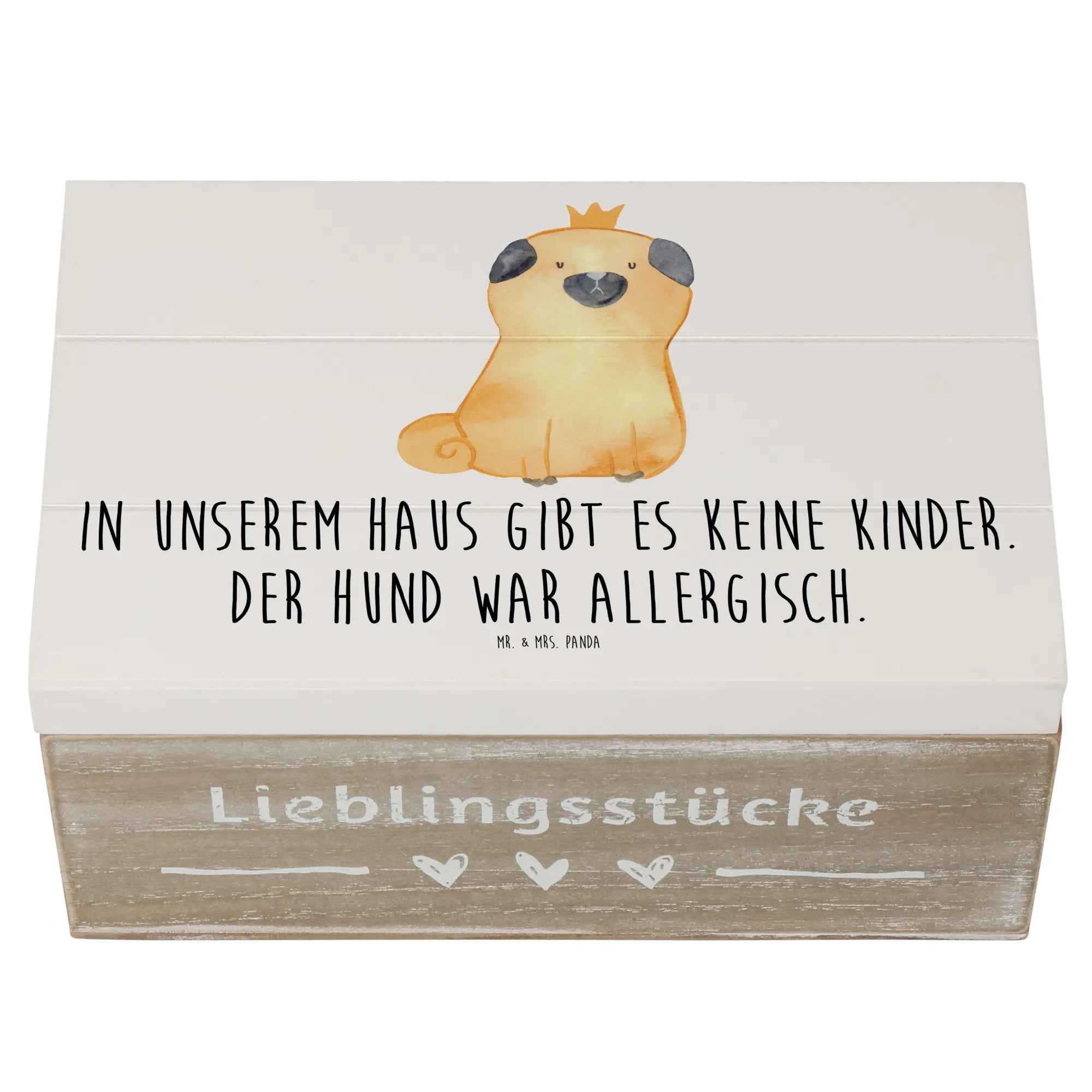 Unsere dekorative Holzkiste aus der Hunde Kollektion von Mr. & Mrs. Panda verbindet Humor mit Herz: Ein süßer Mops mit Krone trifft auf den frechen Spruch „In unserem Haus gibt es keine Kinder. Der Hund war allergisch.“ – das ideale Motiv für Paare ohne Nachwuchs, Hundebesitzer und alle, die das Leben mit Vierbeinern feiern möchten.
