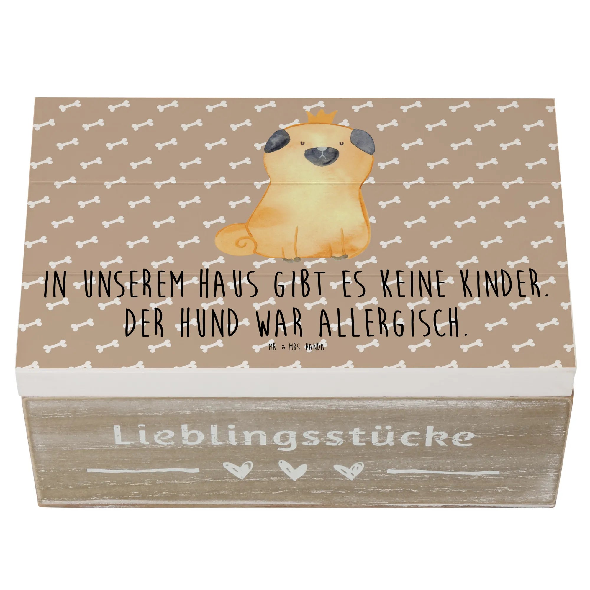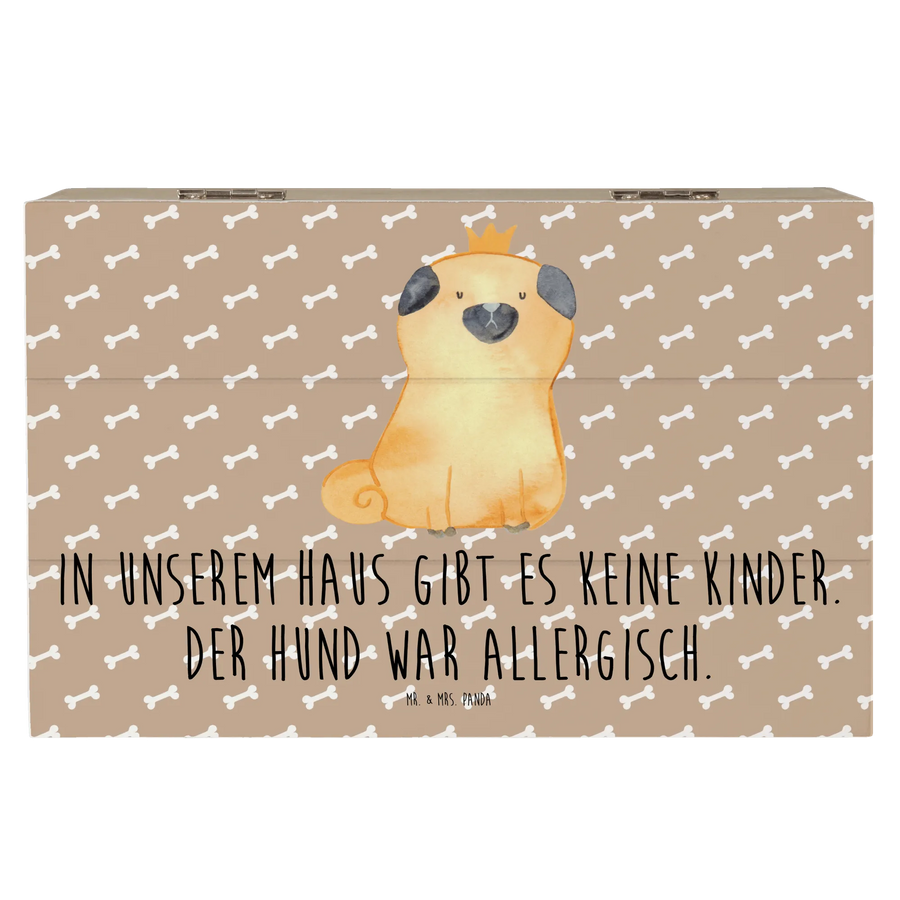 Die besondere Holzfaser sorgt nicht nur für eine edle Optik, sondern ist ebenfalls nachhaltig und wiederverwendbar. Die Kiste ziert ein stolzer Mops mit einer Krone auf dem Kopf, der jedem Raum einen Hauch von Niedlichkeit verleiht. Der dazugehörige Spruch "In unserem Haus gibt es keine Kinder. Der Hund war allergisch." bringt Humor in dein Zuhause und ist besonders bei Hundebesitzern äußerst beliebt.