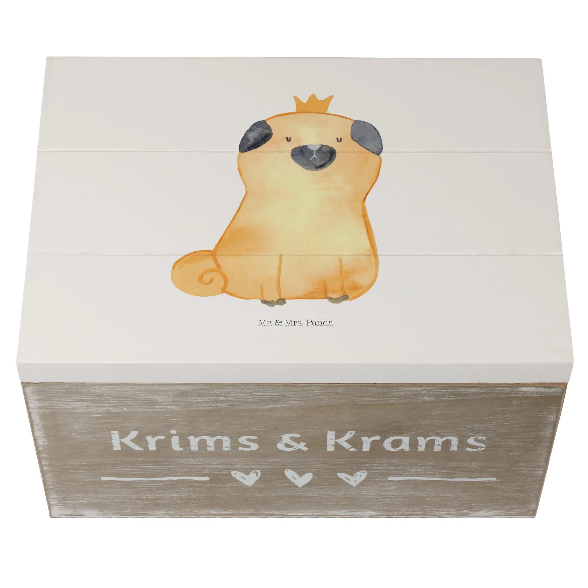 Die Holzkiste Mops Krone von Mr. & Mrs. Panda ist das perfekte Geschenk für Hundeliebhaber und Hundebesitzer, die ihre Schätze stilvoll aufbewahren möchten. Diese wunderschöne Holzkiste ist mit einem bezaubernden Motiv eines stolzen Mopses, der eine Krone trägt, bedruckt.