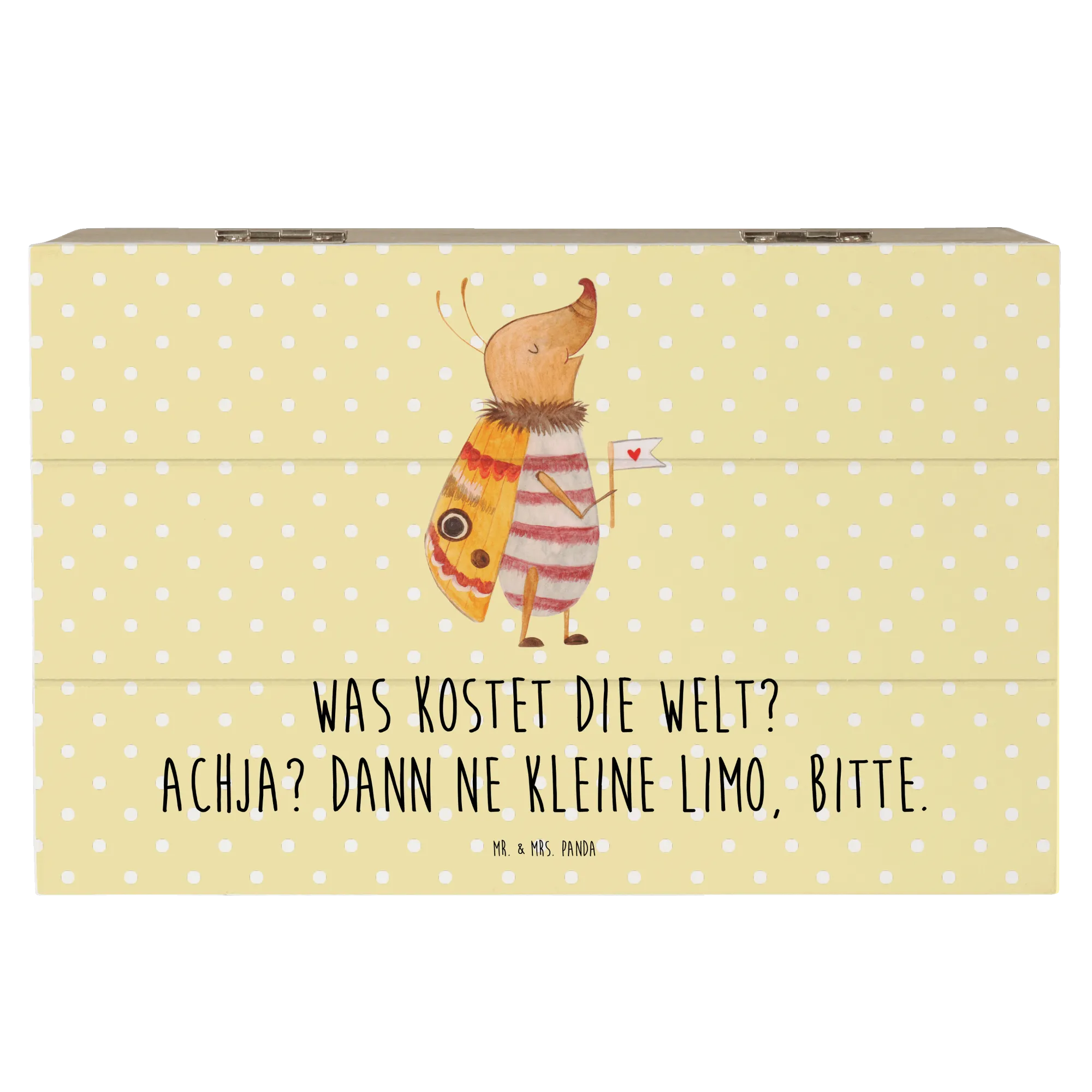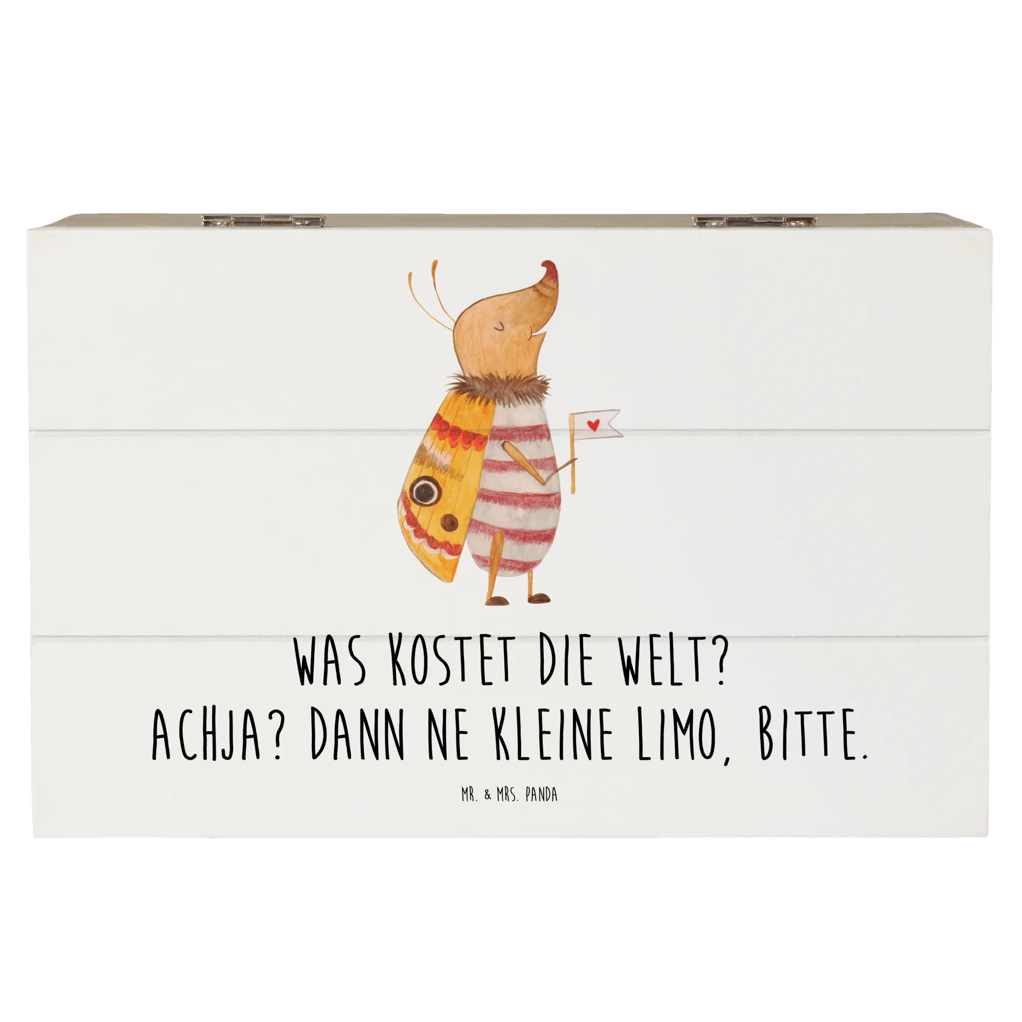 Die wunderschöne Holzkiste mit dem Motive "Nachtfalter mit Fähnchen" aus der zauberhaften Small World Kollektion von Mr. & Mrs. Panda ist das perfekte Geschenk für alle, die das Besondere lieben. Mit den Maßen von 25 x 18 cm bietet sie viel Platz, um deine wertvollen Erinnerungen aufzubewahren oder als stilvolle Dekokiste zu dienen. Diese stabile und edel aussehende Kiste aus robuster Holzfaser besticht durch ihr liebevolles Design, das einen kleinen, glücklichen Nachtfalter zeigt, der eine herzförmige Fahne in der Hand hält. Dieser Nachtfalter kommt in einem sanften Gelbton, der jede Ecke deines Zuhauses erhellt. Zusammen mit dem witzigen Spruch "Was kostet die Welt? Achja? Dann ne kleine Limo, bitte." zaubert sie jedem ein Lächeln ins Gesicht und sorgt für gute Laune.