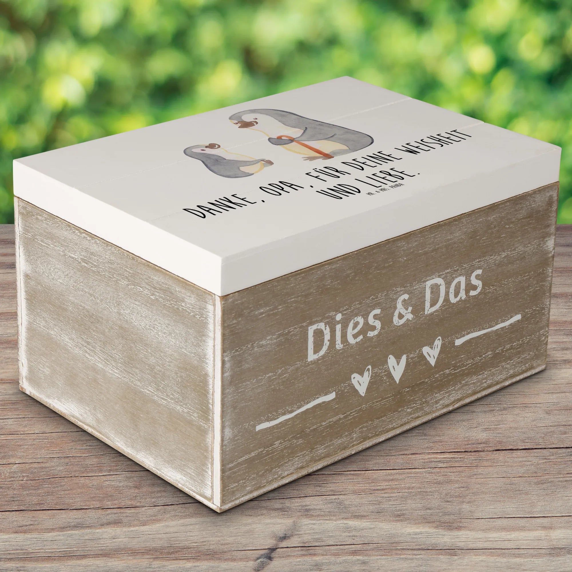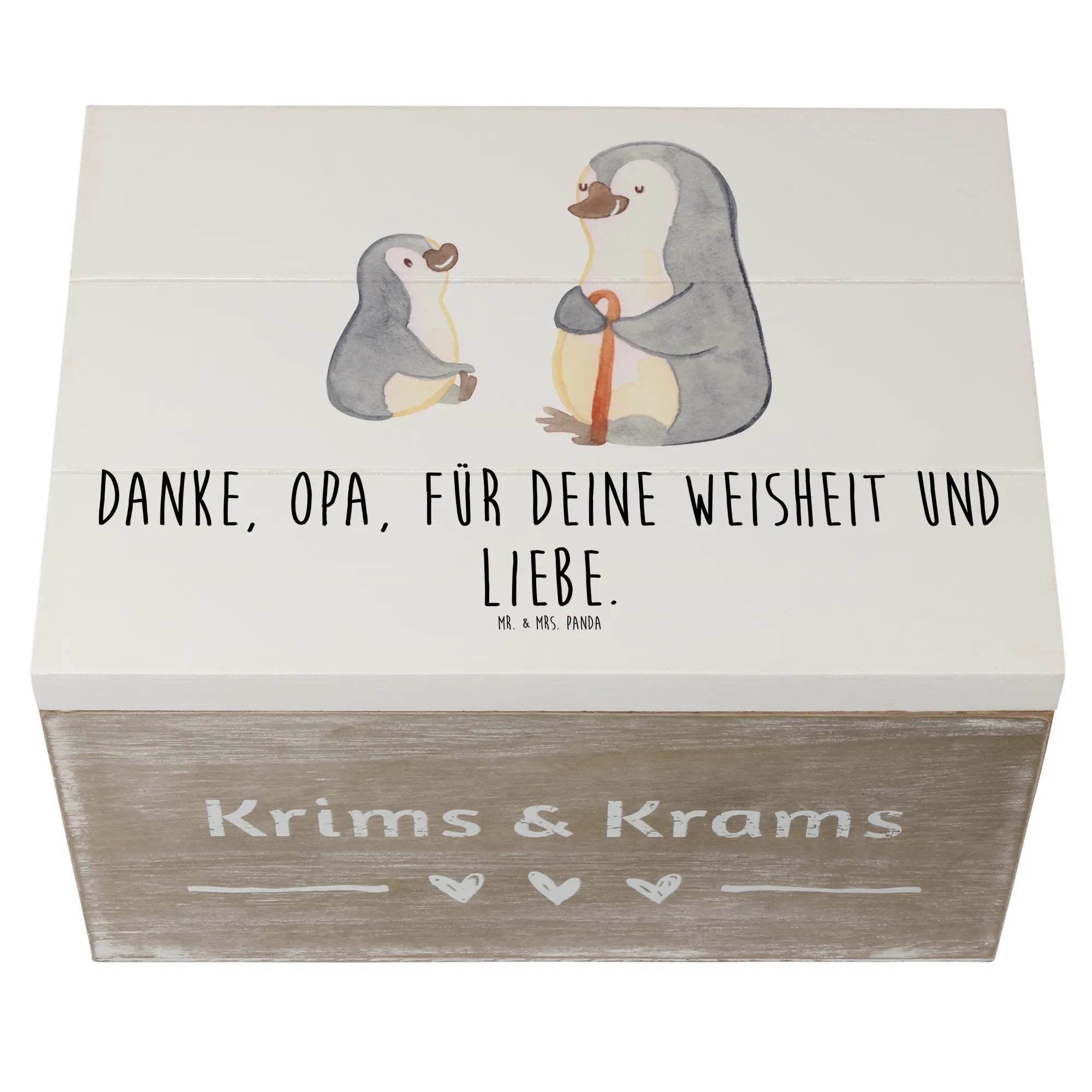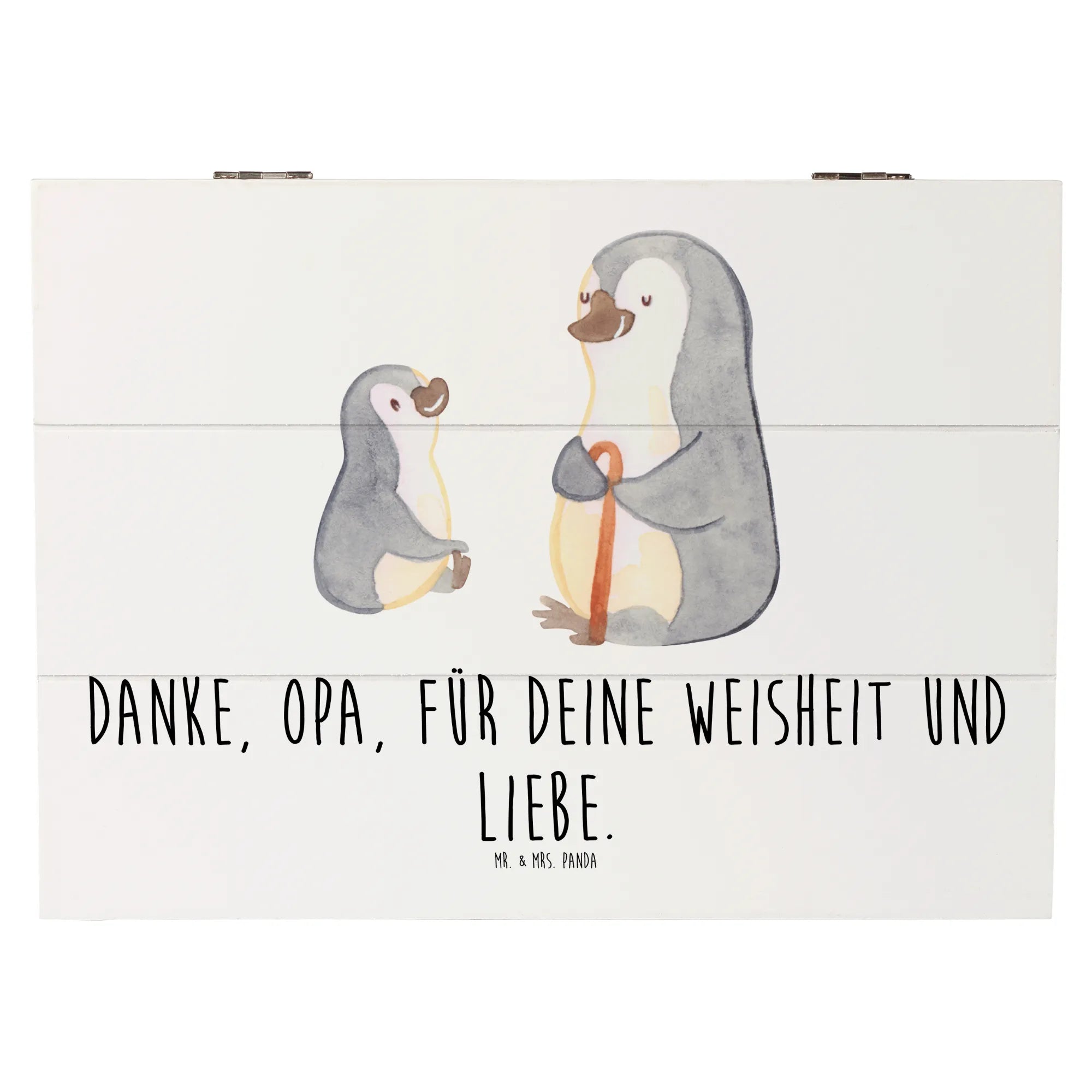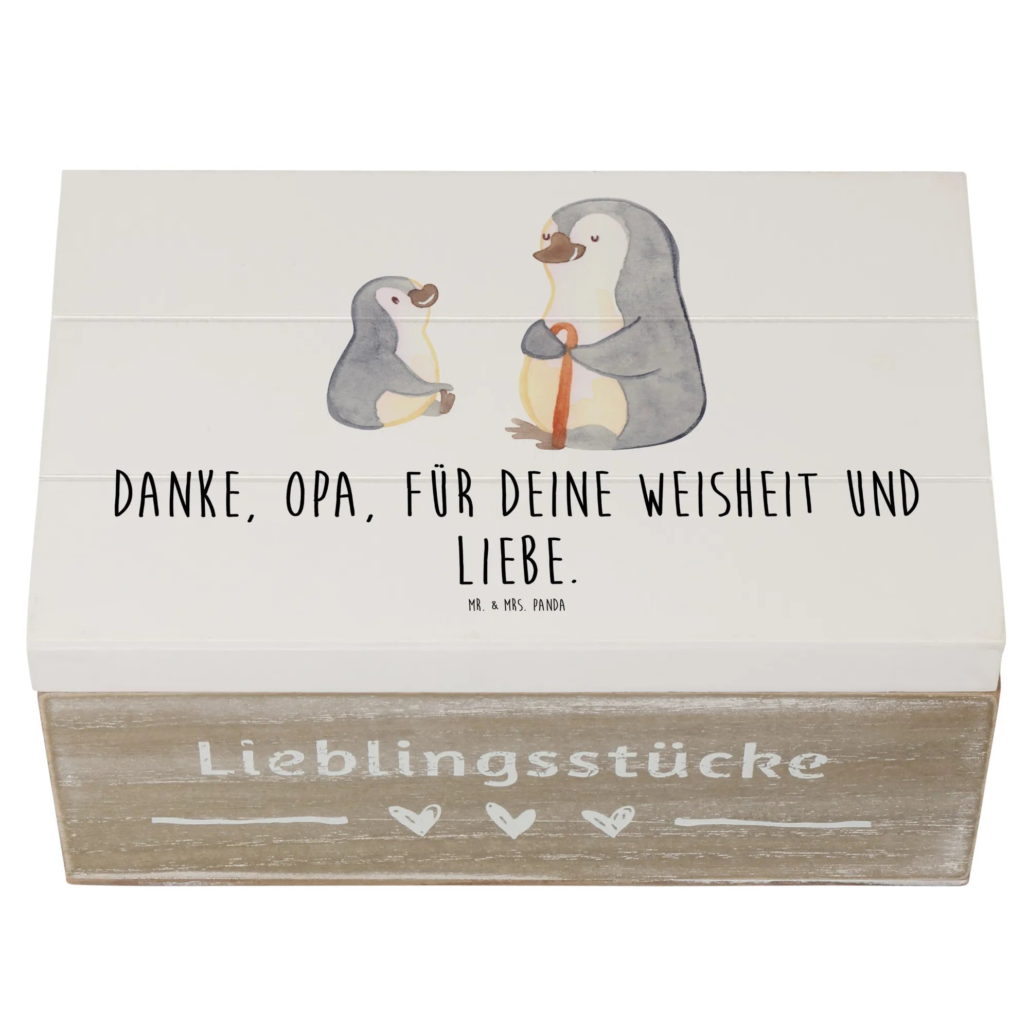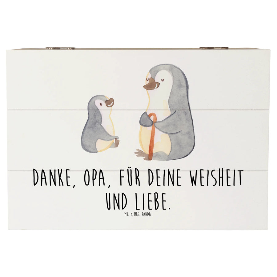 Die wunderschöne Holzkiste von Mr. & Mrs. Panda ist das perfekte Geschenk für Deinen Opa, um ihm zu danken. Mit dem liebevollen Slogan 'Danke, Opa, für deine Weisheit und Liebe.' ist diese Erinnerungskiste mehr als nur ein Aufbewahrungsort – sie ist ein Ort voller Herzen, Erinnerungen und Schatzkästchen!