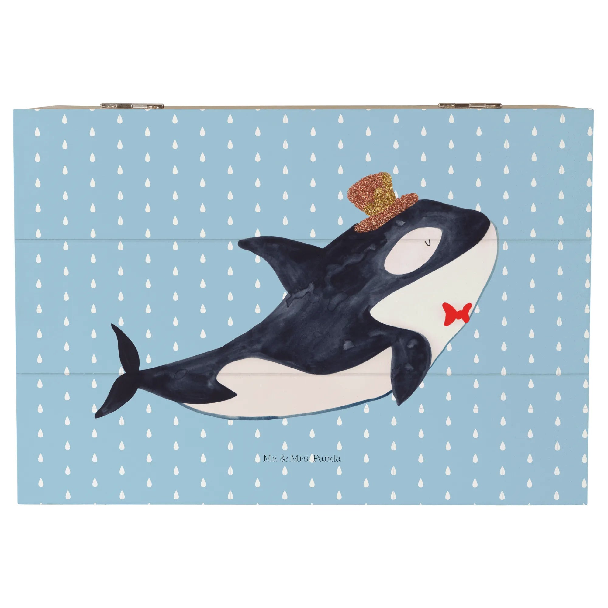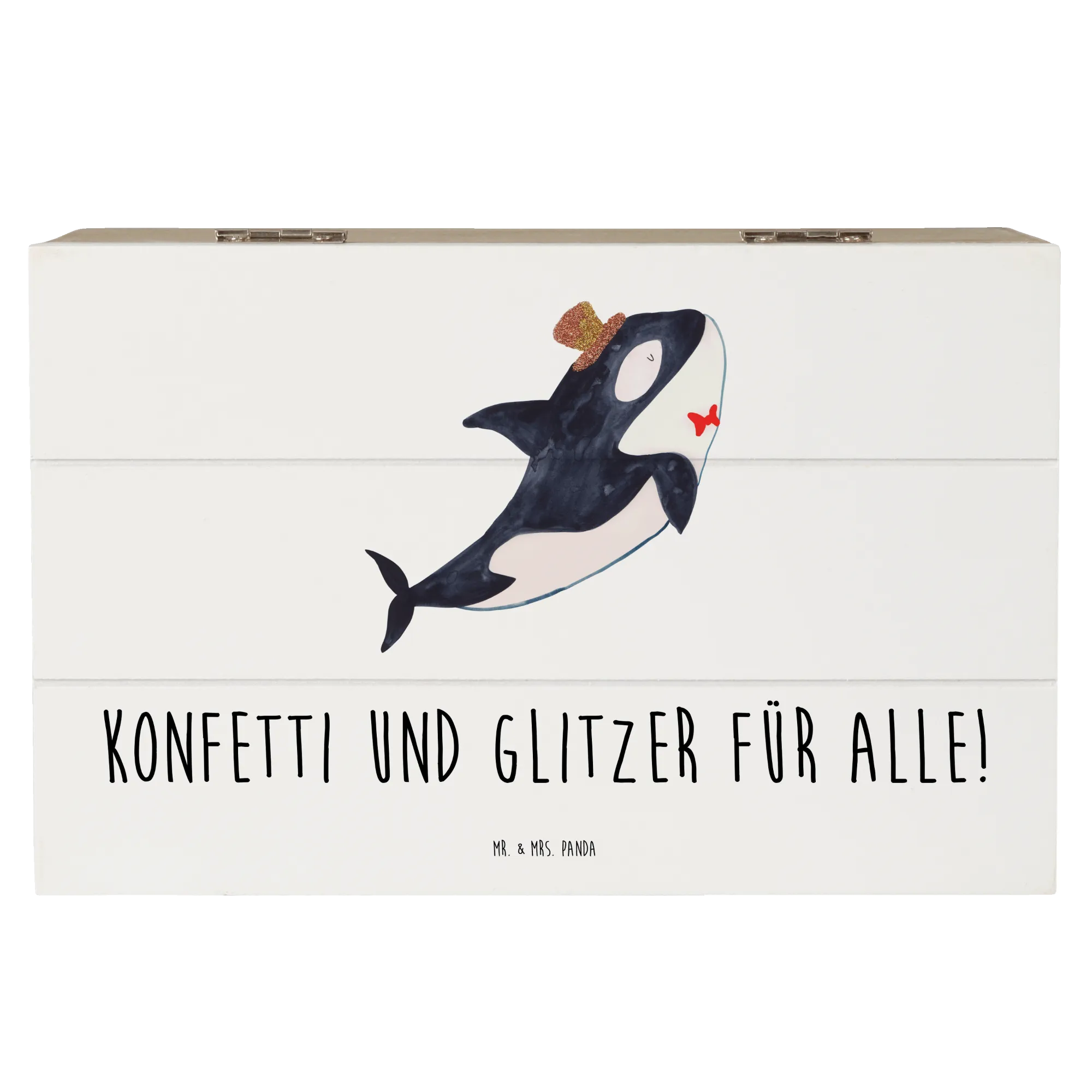 Die Holzkiste mit dem niedlichen Motiv des Orcas Zylinders von Mr. & Mrs. Panda ist der perfekte Aufbewahrungsort für all deine Erinnerungen und Schätze. Egal, ob du sie als Erinnerungskiste für die schönsten Erlebnisse deines Lebens nutzen möchtest oder sie einfach als Dekokiste ins Wohnzimmer stellst – diese Kiste ist ein wahrhaft zauberhaftes Accessoire voller Liebe und Kreativität.