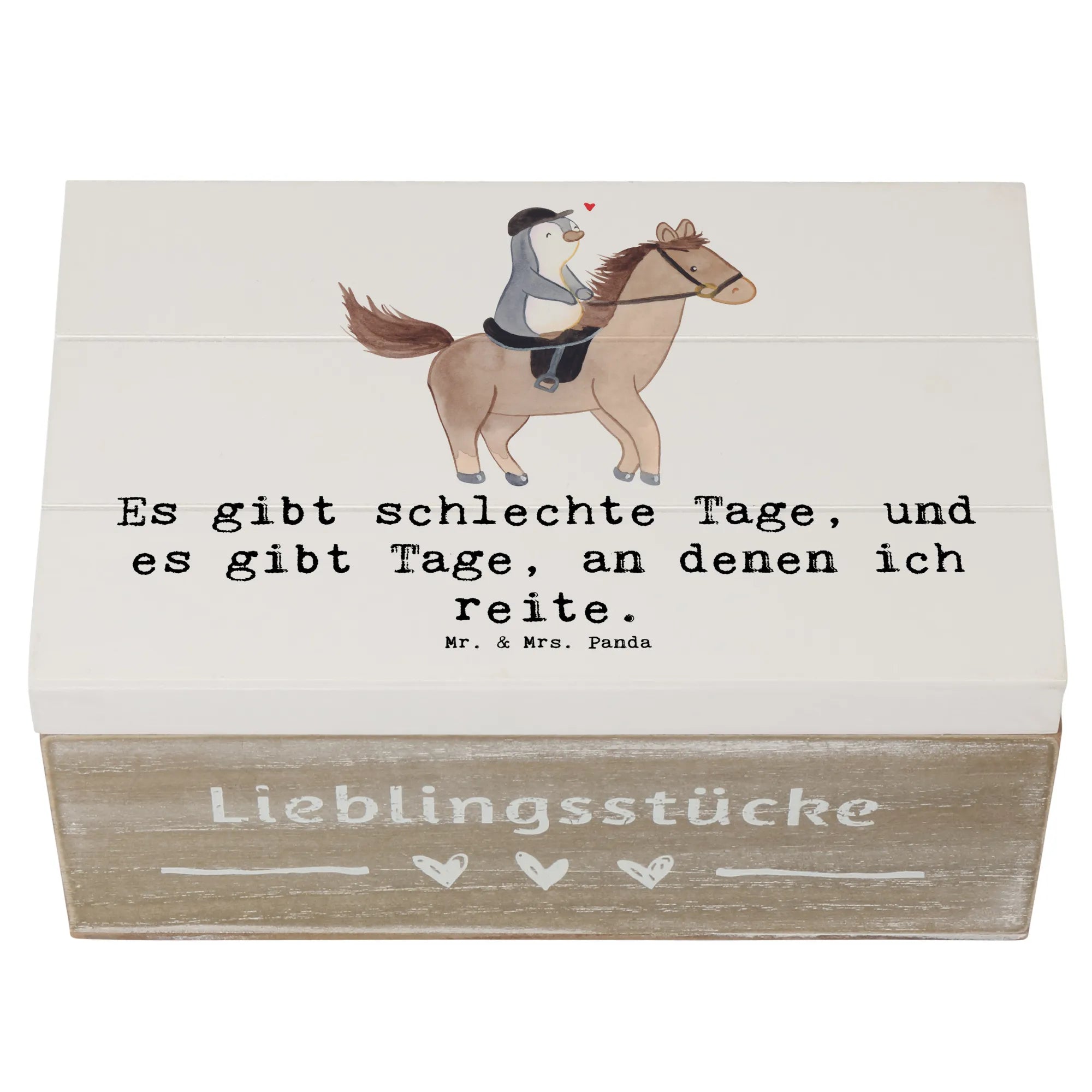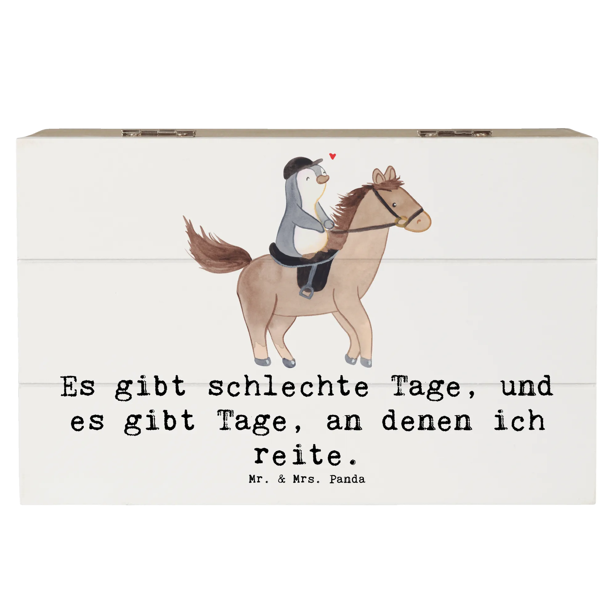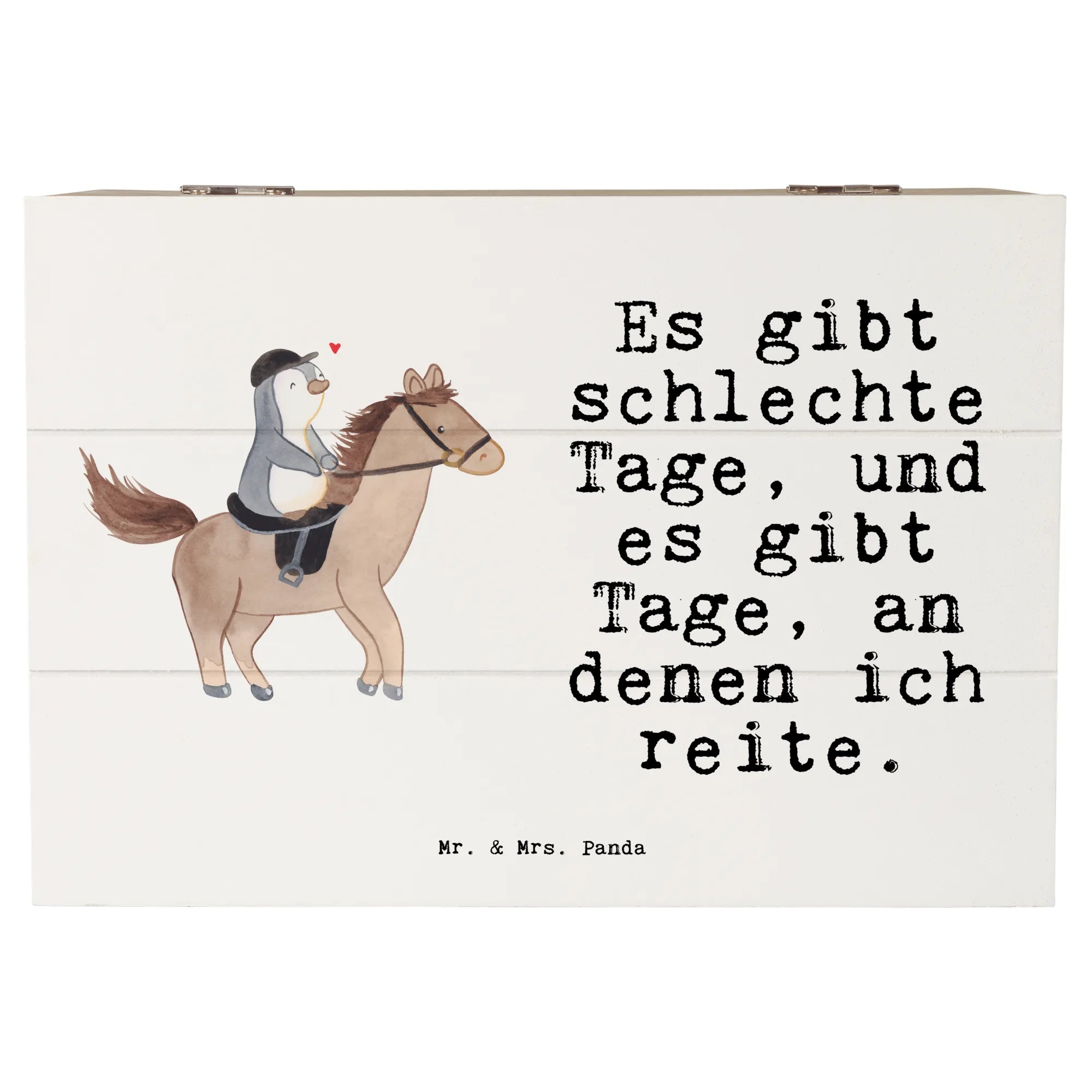 Suchst du ein Geschenk für Pferde- und Reitfans? Unsere Holzkiste „Pferd Reiten Tage“ von Mr. & Mrs. Panda ist mehr als nur eine Kiste – sie ist eine kleine Schatztruhe voller Emotionen und Erinnerungen. Auf dem liebevollen Motiv siehst du einen fröhlichen Pinguin, der begeistert auf einem Pferd reitet. Dazu passt der Spruch: „Es gibt schlechte Tage, und es gibt Tage, an denen ich reite.“ – perfekt für alle, die das Reiten lieben. 🐧🐴