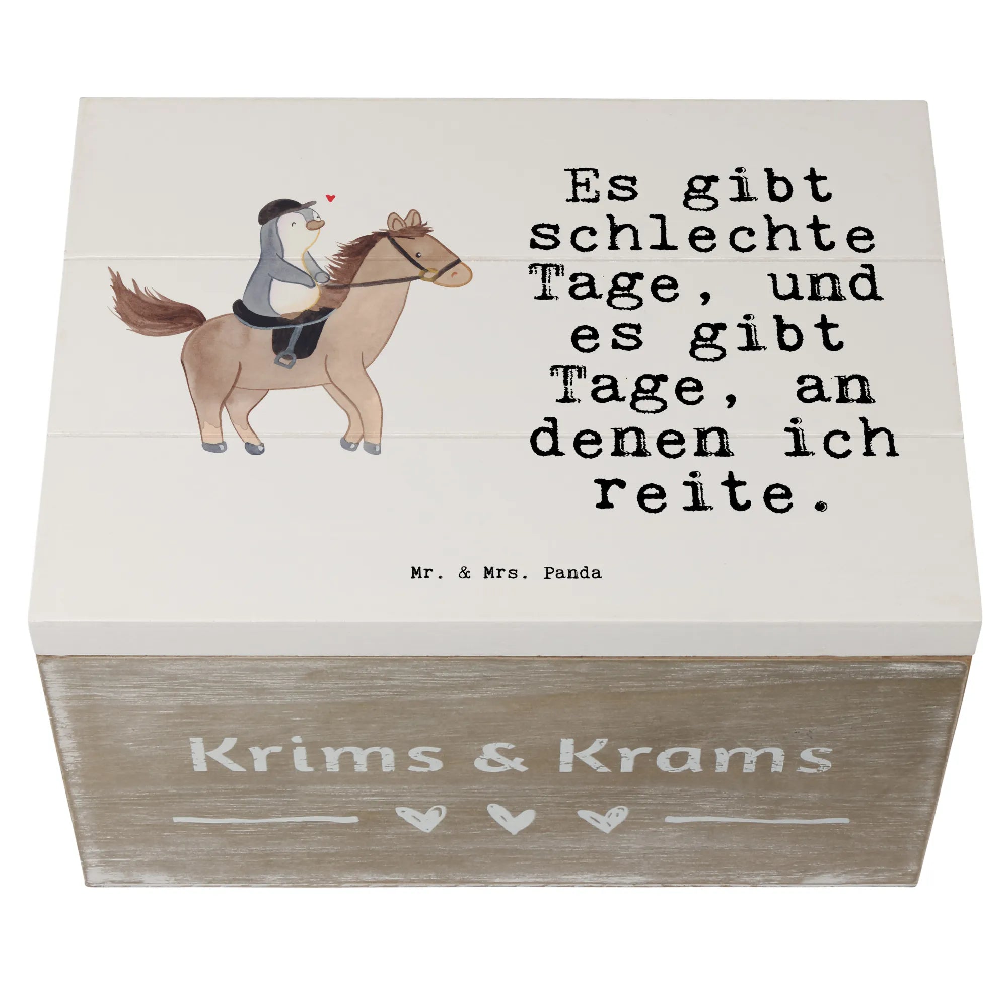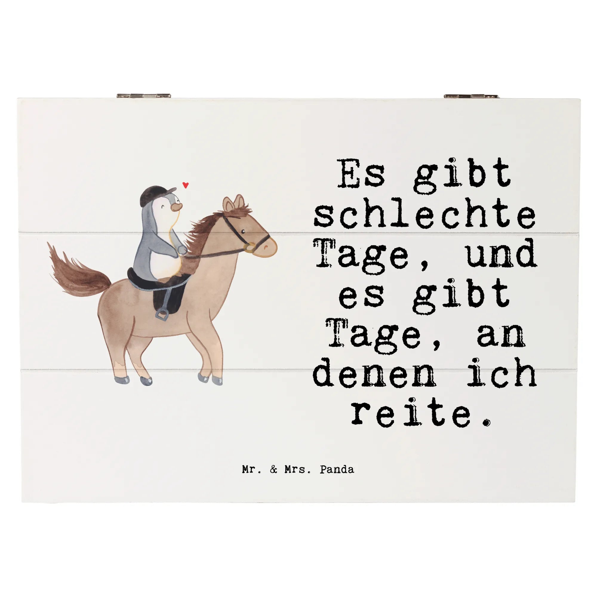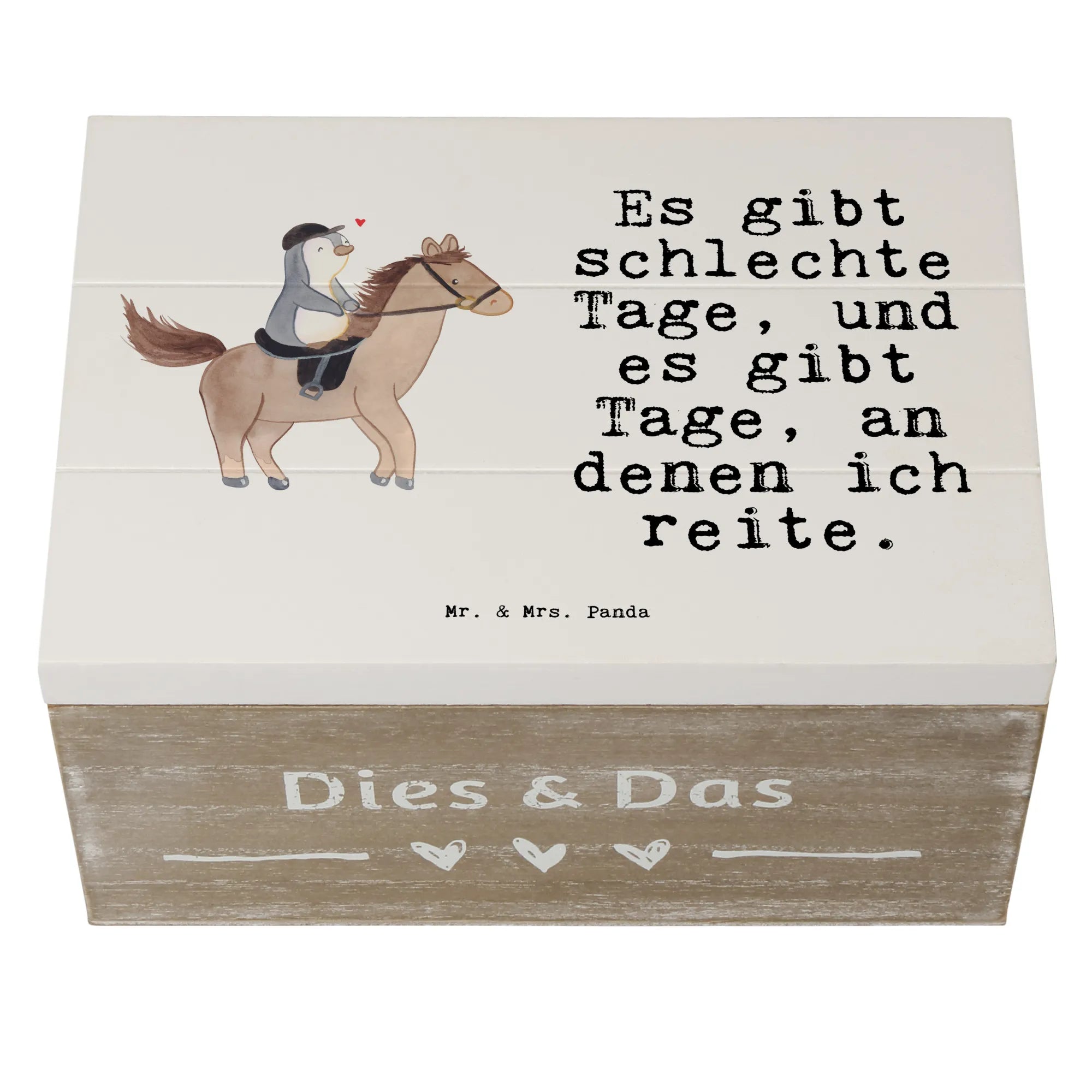 Suchst du ein Geschenk für Pferde- und Reitfans? Unsere Holzkiste „Pferd Reiten Tage“ von Mr. & Mrs. Panda ist mehr als nur eine Kiste – sie ist eine kleine Schatztruhe voller Emotionen und Erinnerungen. Auf dem liebevollen Motiv siehst du einen fröhlichen Pinguin, der begeistert auf einem Pferd reitet. Dazu passt der Spruch: „Es gibt schlechte Tage, und es gibt Tage, an denen ich reite.“ – perfekt für alle, die das Reiten lieben. 🐧🐴