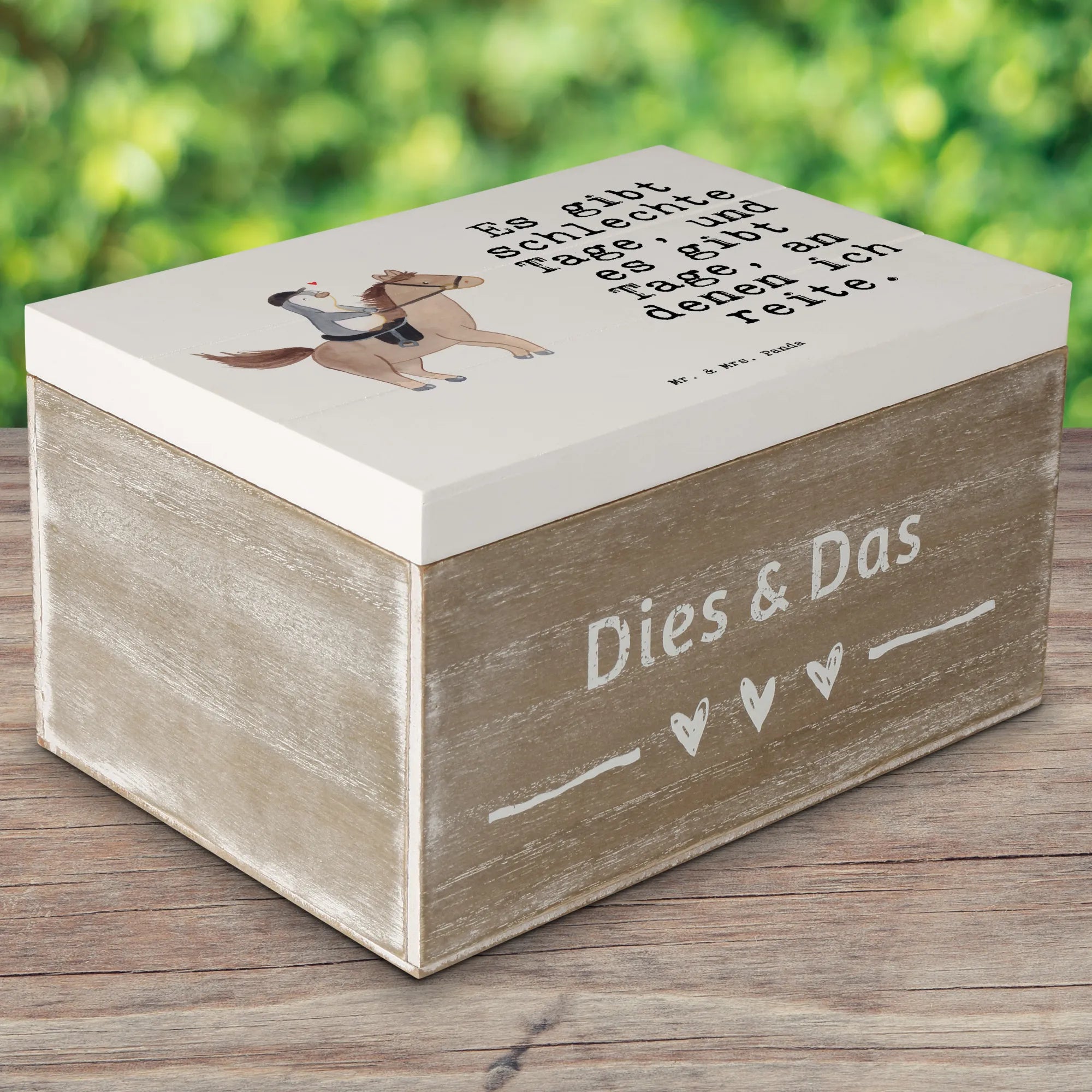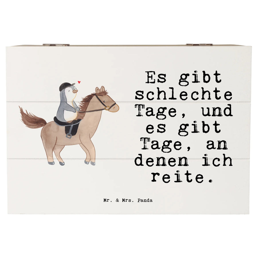 Entdecke die bezaubernde Holzkiste "Pferd Reiten Tage" von Mr. & Mrs. Panda! Diese wunderschöne Erinnerungskiste ist nicht nur ein praktischer Aufbewahrungsort für all deine Schätze, sondern auch ein liebevolles Geschenk für alle Pferdefreunde und Reitsportenthusiasten. Mit ihrem charmanten Motiv, das einen niedlichen Pinguin zeigt, der begeistert auf einem süßen Pferd reitet, bringt die Kiste Freude in jedes Zuhause. Der Spruch "Es gibt schlechte Tage, und es gibt Tage, an denen ich reite." spricht das Herz jedes Reiters an und erinnert uns an die Magie besonderer Reitmomente.