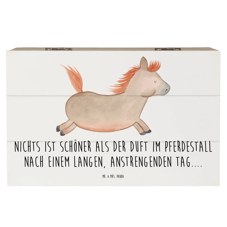Die wunderschöne Holzkiste von Mr. & Mrs. Panda ist das perfekte Geschenk für alle Pferdeliebhaber. Diese zauberhafte Kiste, bedruckt mit einem niedlichen Motiv eines springenden Pferdes und dem liebevollen Slogan "Nichts ist schöner als der Duft im Pferdestall nach einem langen, anstrengenden Tag...", bringt das Gefühl von Freiheit und Abenteuer in dein Zuhause.