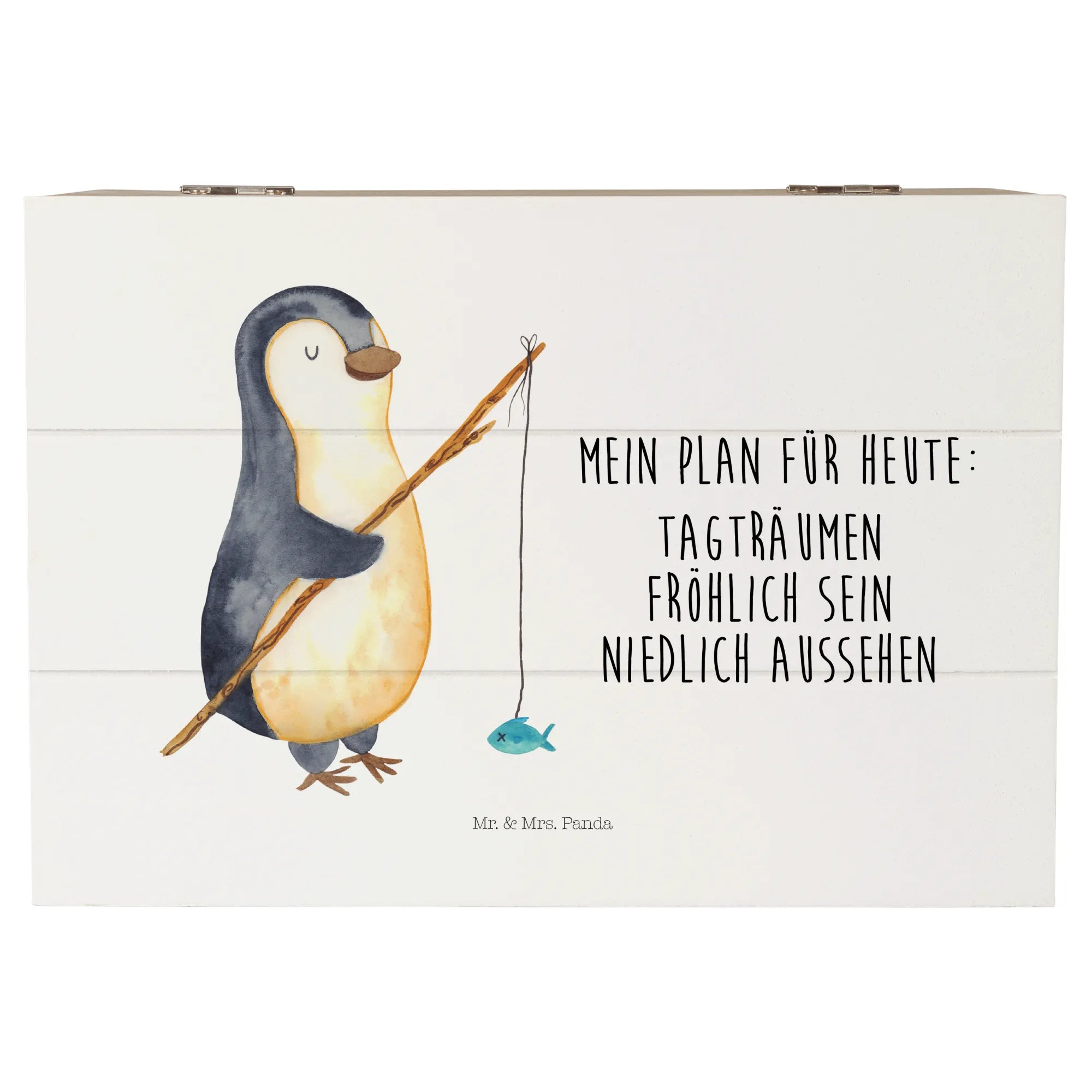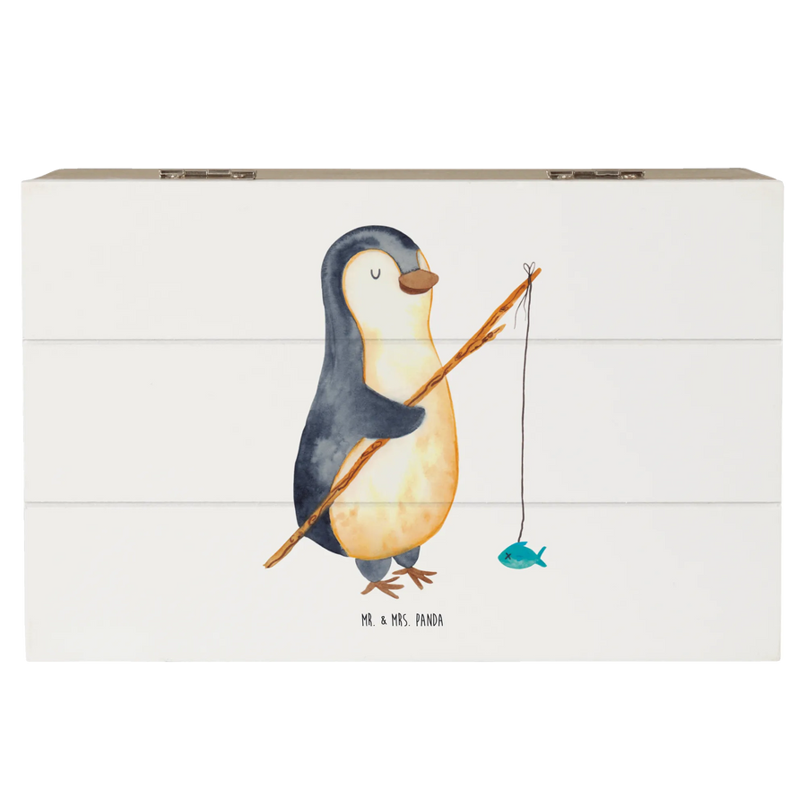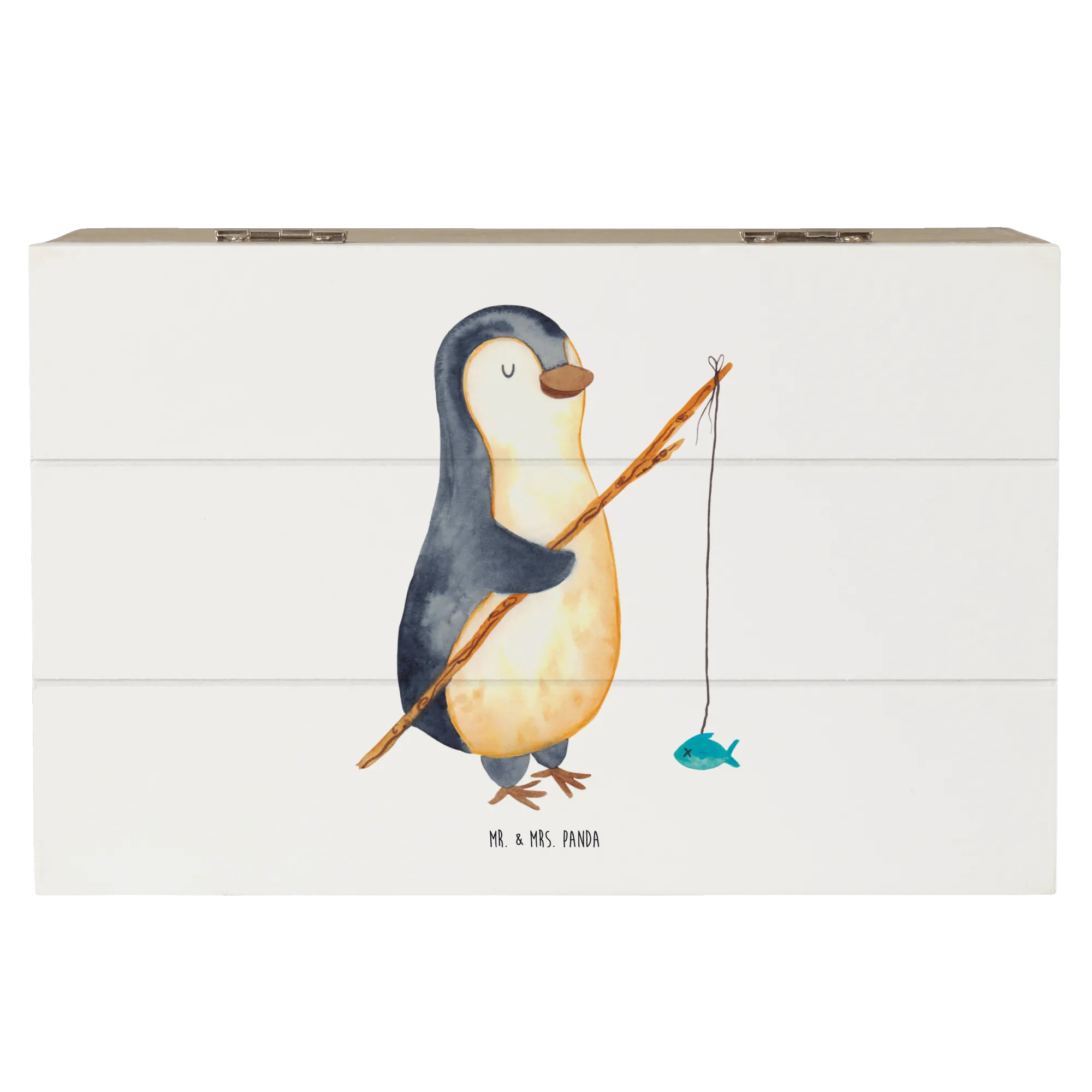 Du suchst nach dem perfekten Geschenk für einen Pinguinliebhaber oder jemanden, der gerne Zeit am Wasser verbringt? Unsere einzigartige Holzkiste mit dem fröhlichen Pinguin Angler Motiv aus der Mr. & Mrs. Panda Pinguin-Kollektion ist der ideale Begleiter dafür!