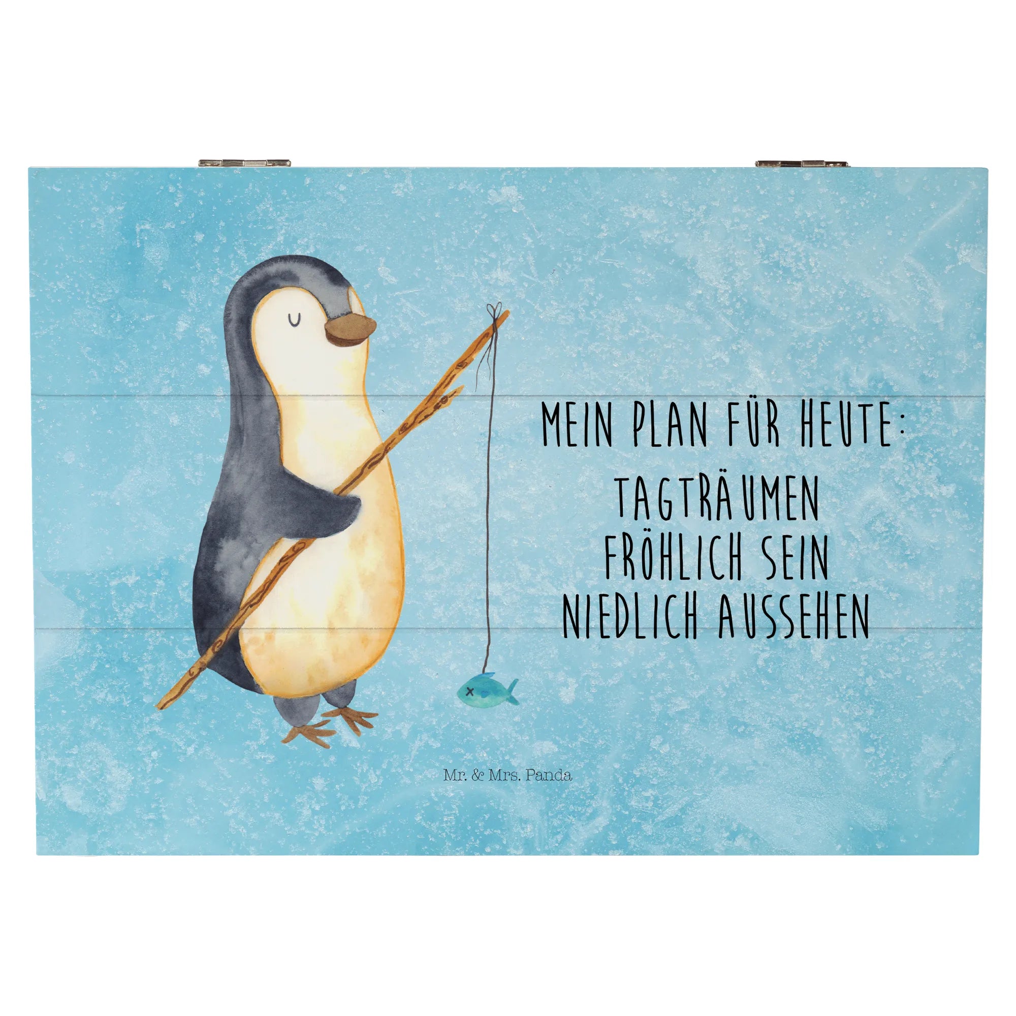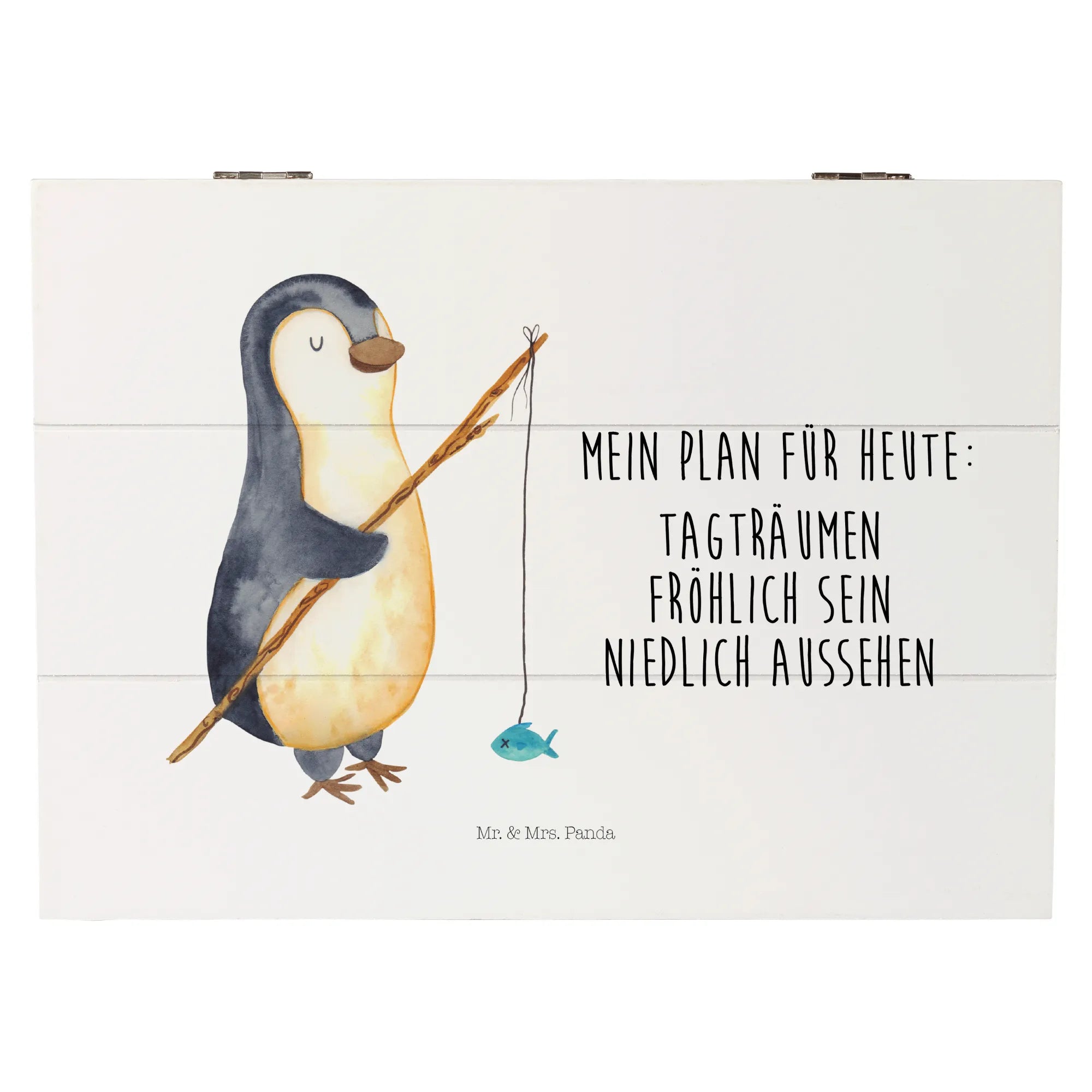 Die zauberhafte Holzkiste mit dem fröhlichen Pinguin Angler aus der Pinguin-Kollektion von Mr. & Mrs. Panda ist das perfekte Geschenk für alle, die das Wasser lieben oder einfach gerne die Seele baumeln lassen.