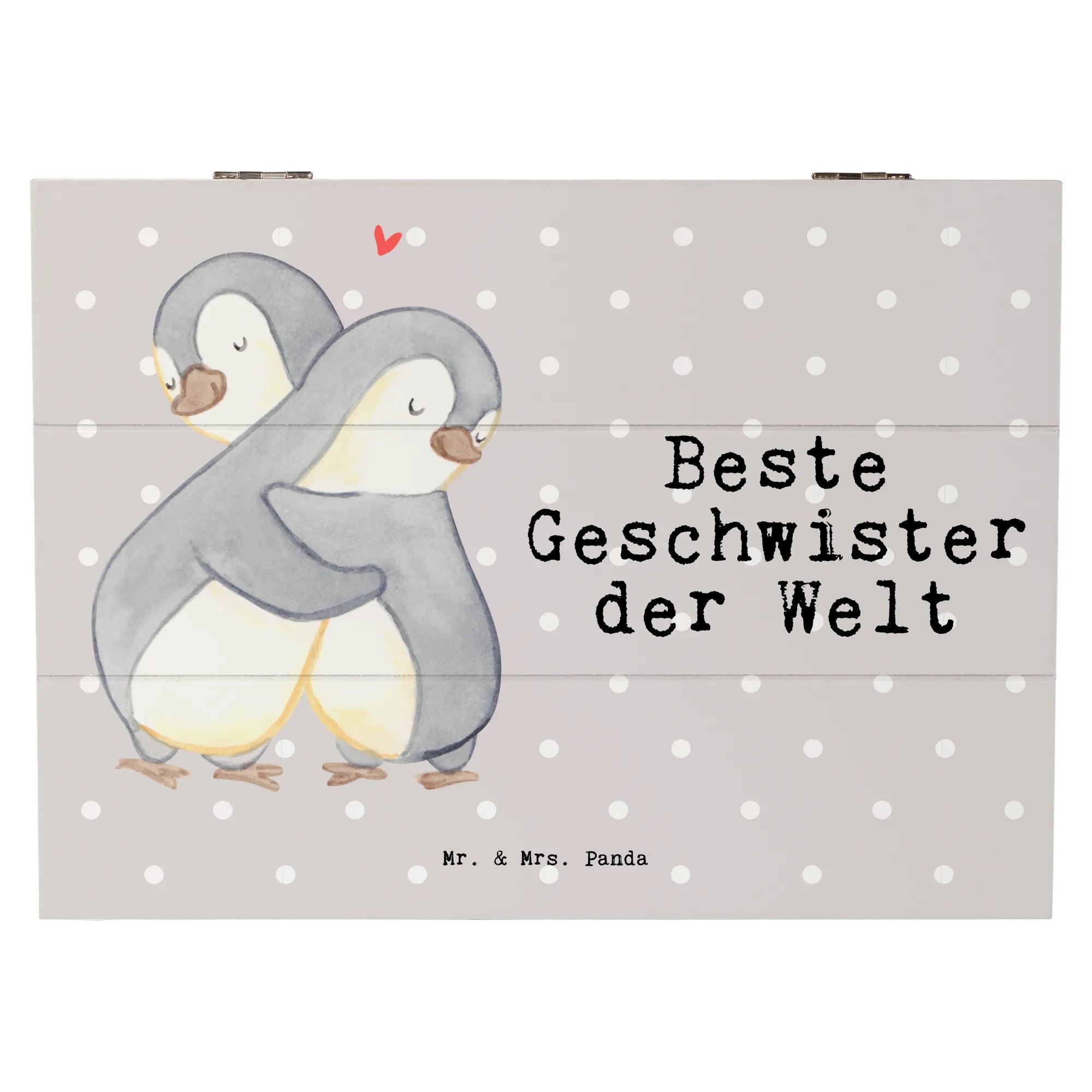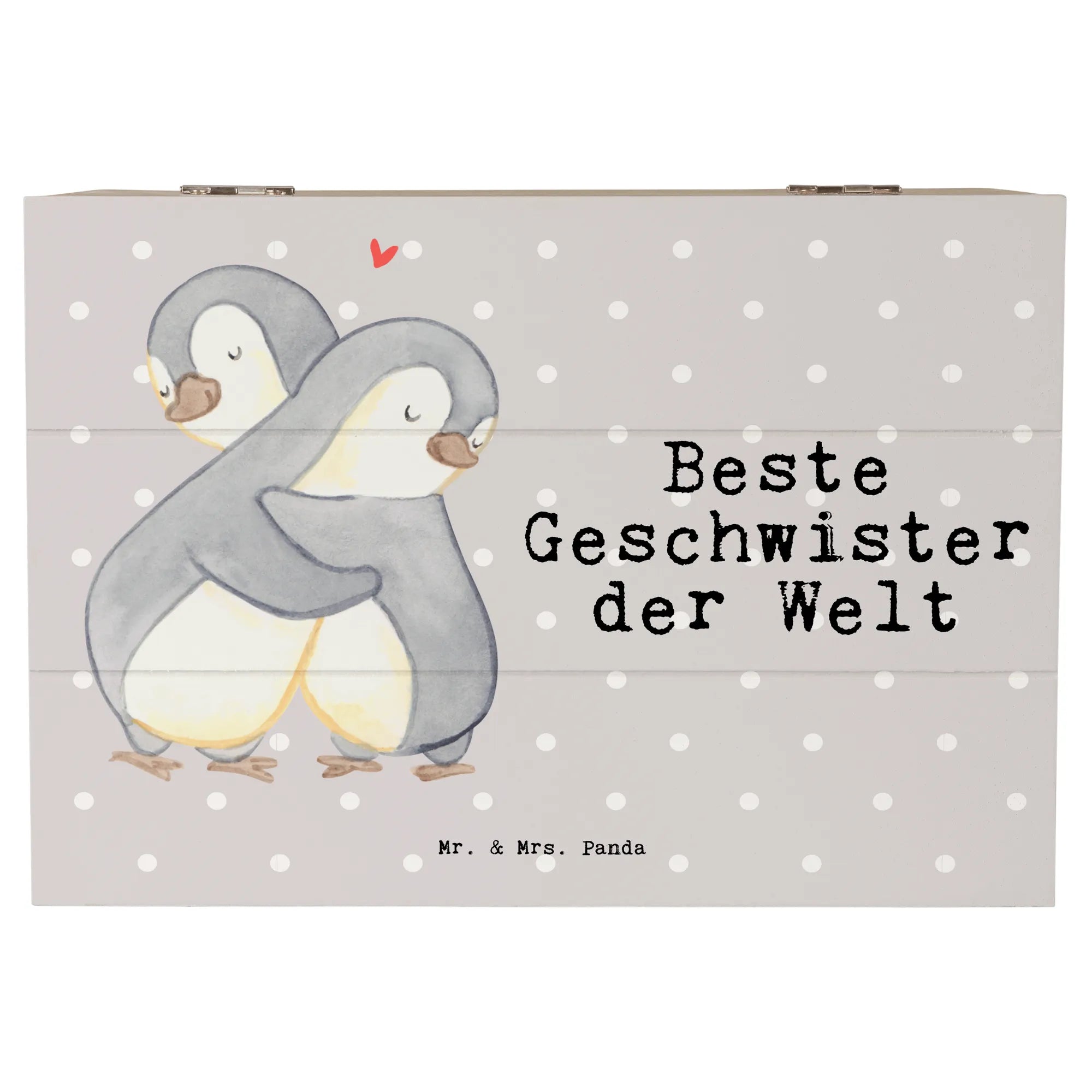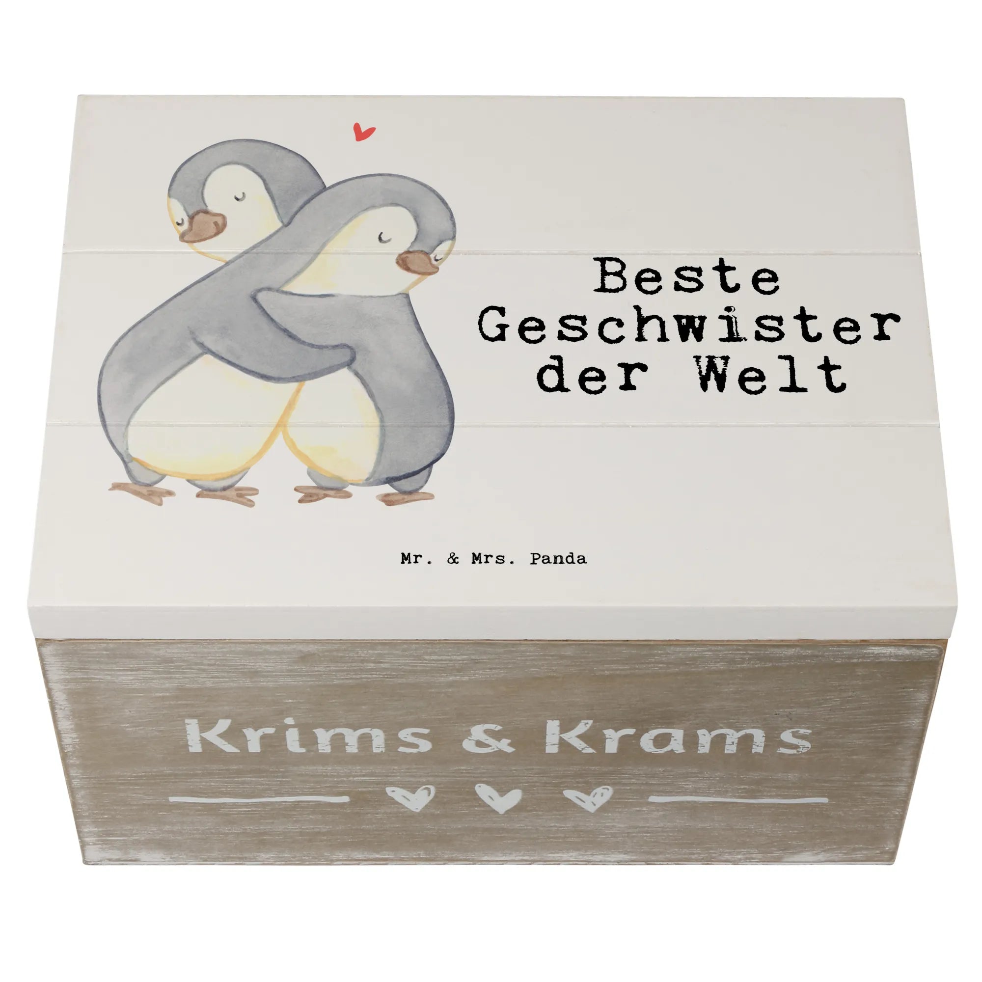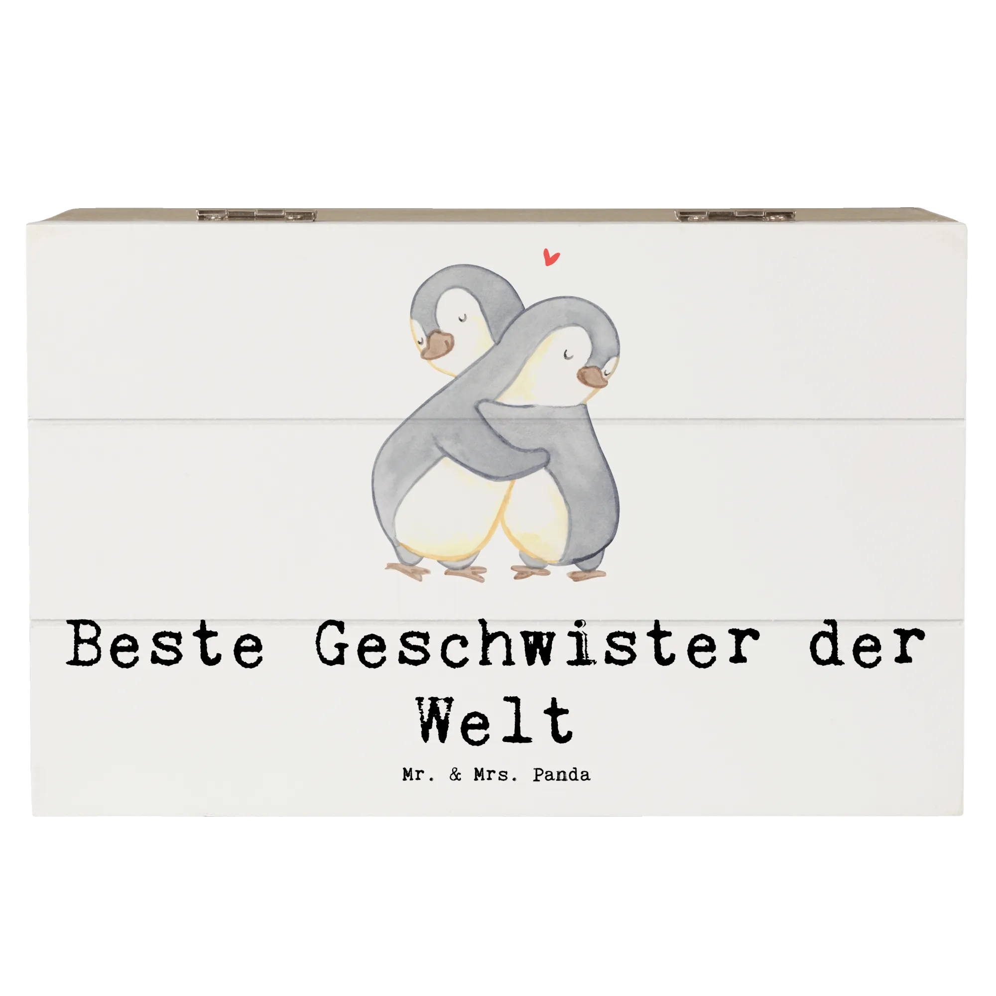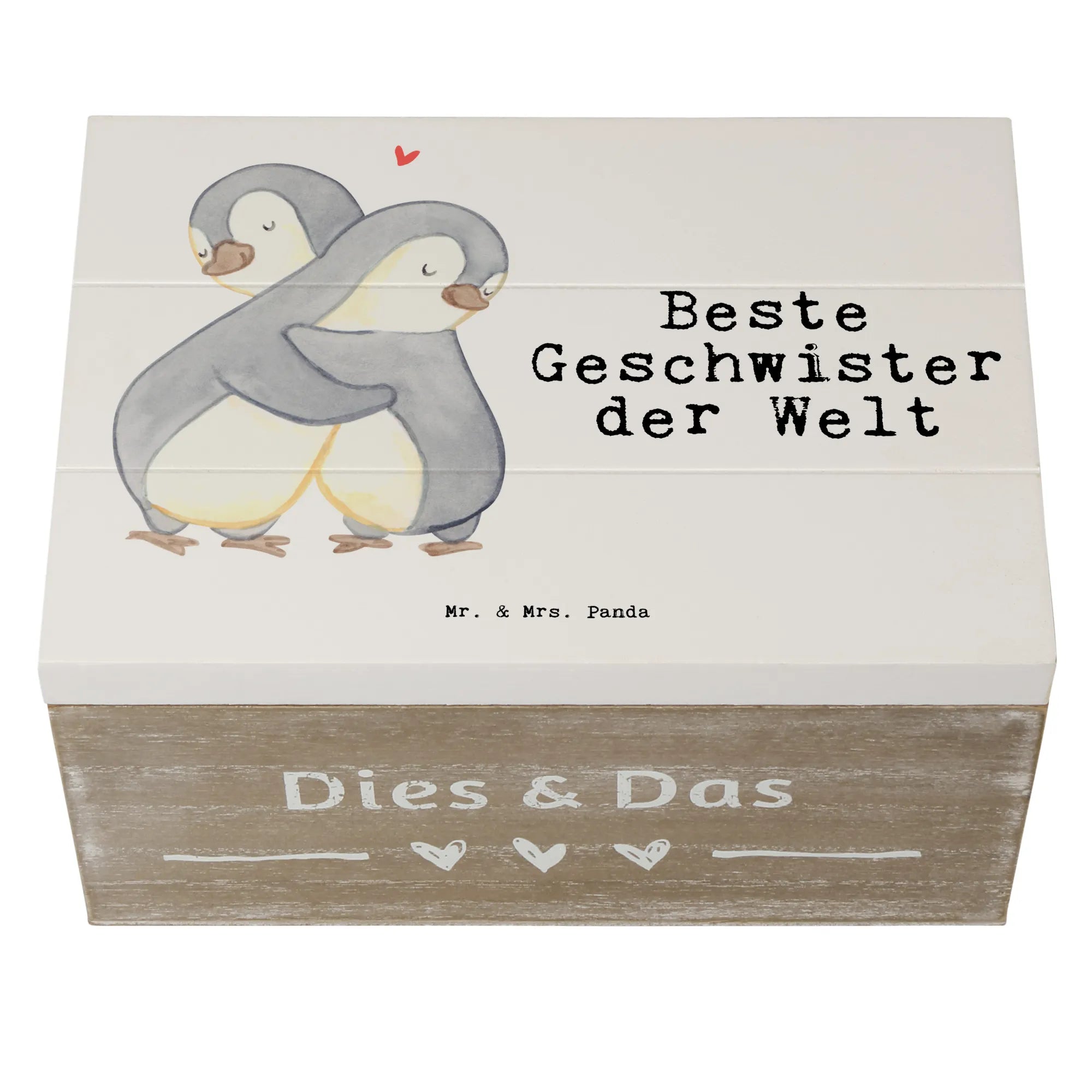 Die Holzkiste "Beste Geschwister der Welt" von Mr. & Mrs. Panda ist das perfekte Geschenk für Geschwister und Familienmitglieder. Mit ihrem niedlichen Pinguin-Motiv, das zwei Pinguine zeigt, die sich liebevoll umarmen, strahlt die Kiste pure Herzenswärme aus.