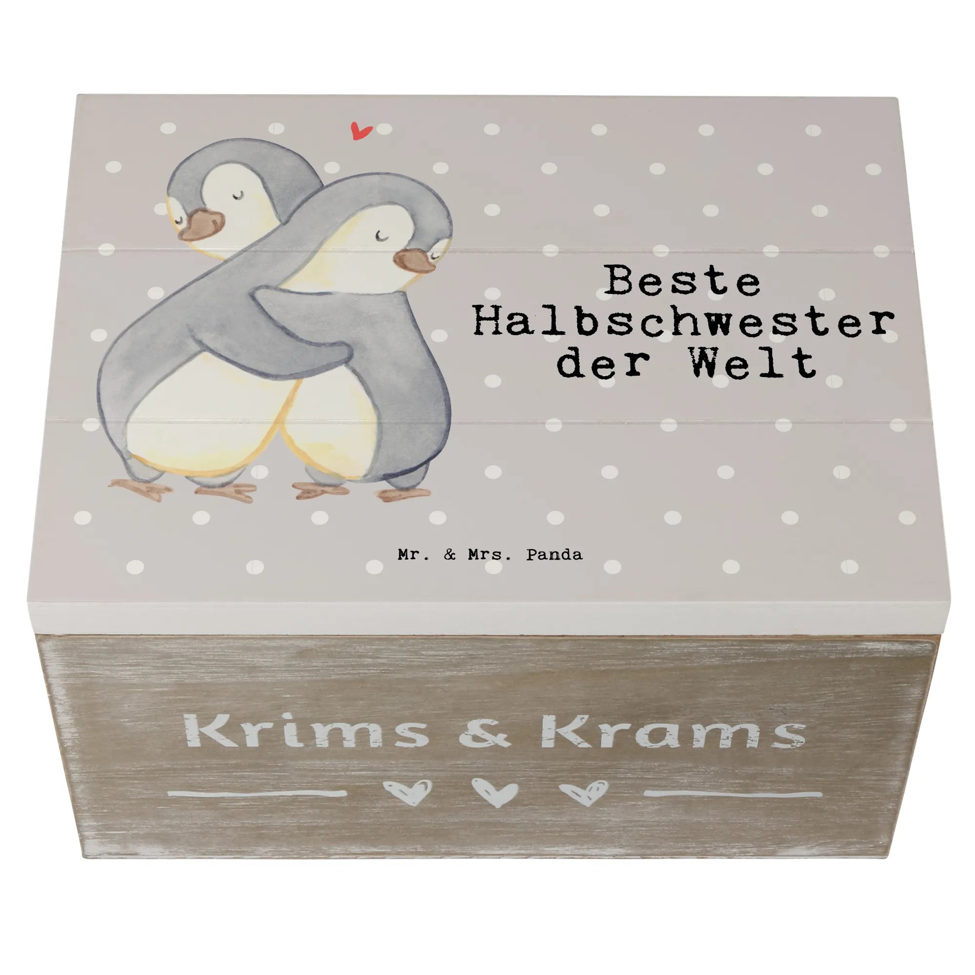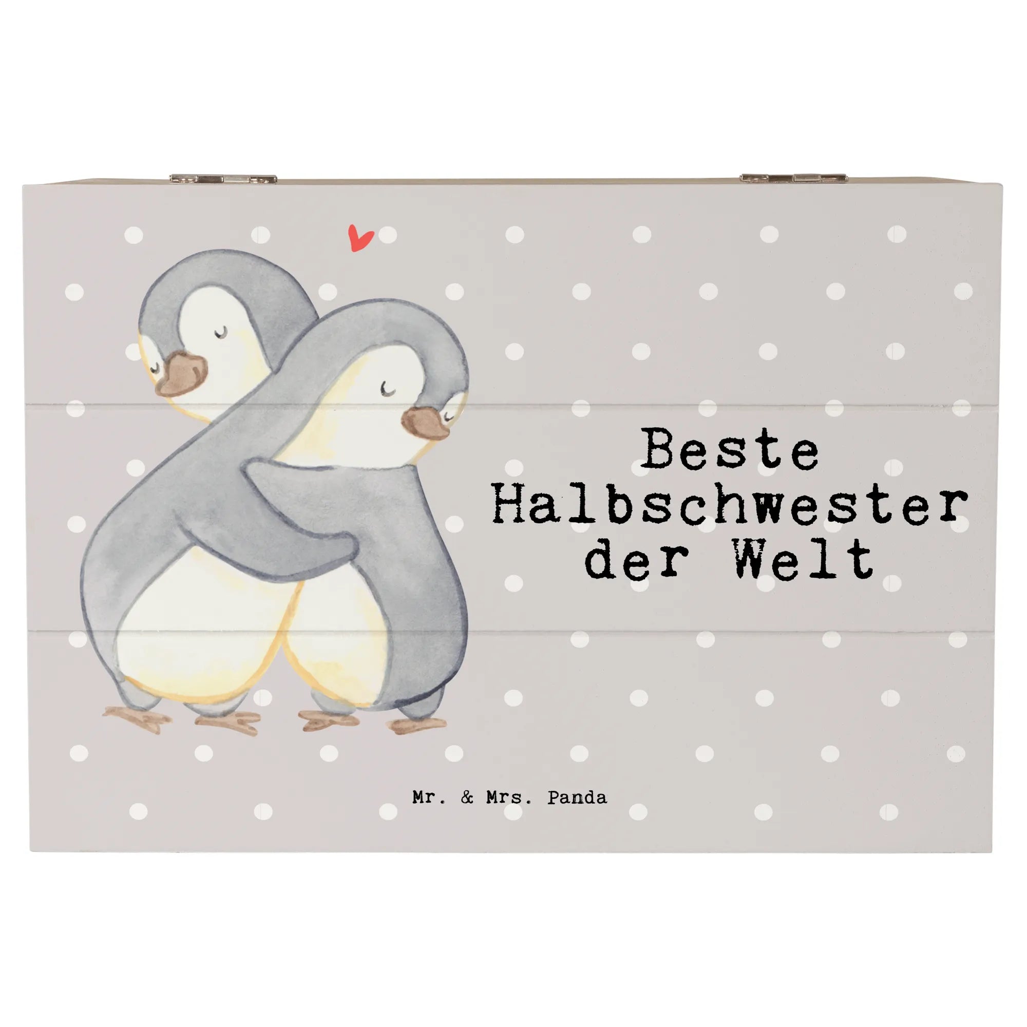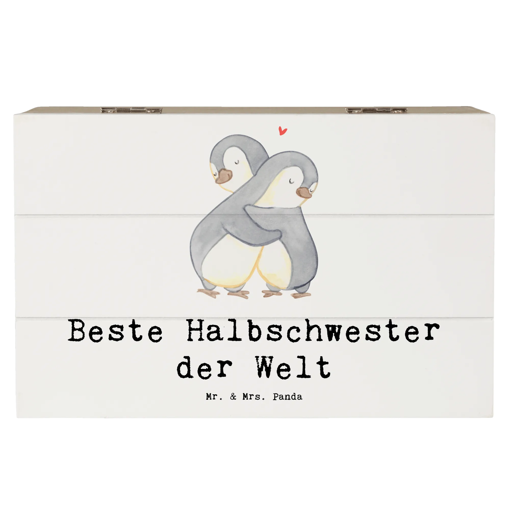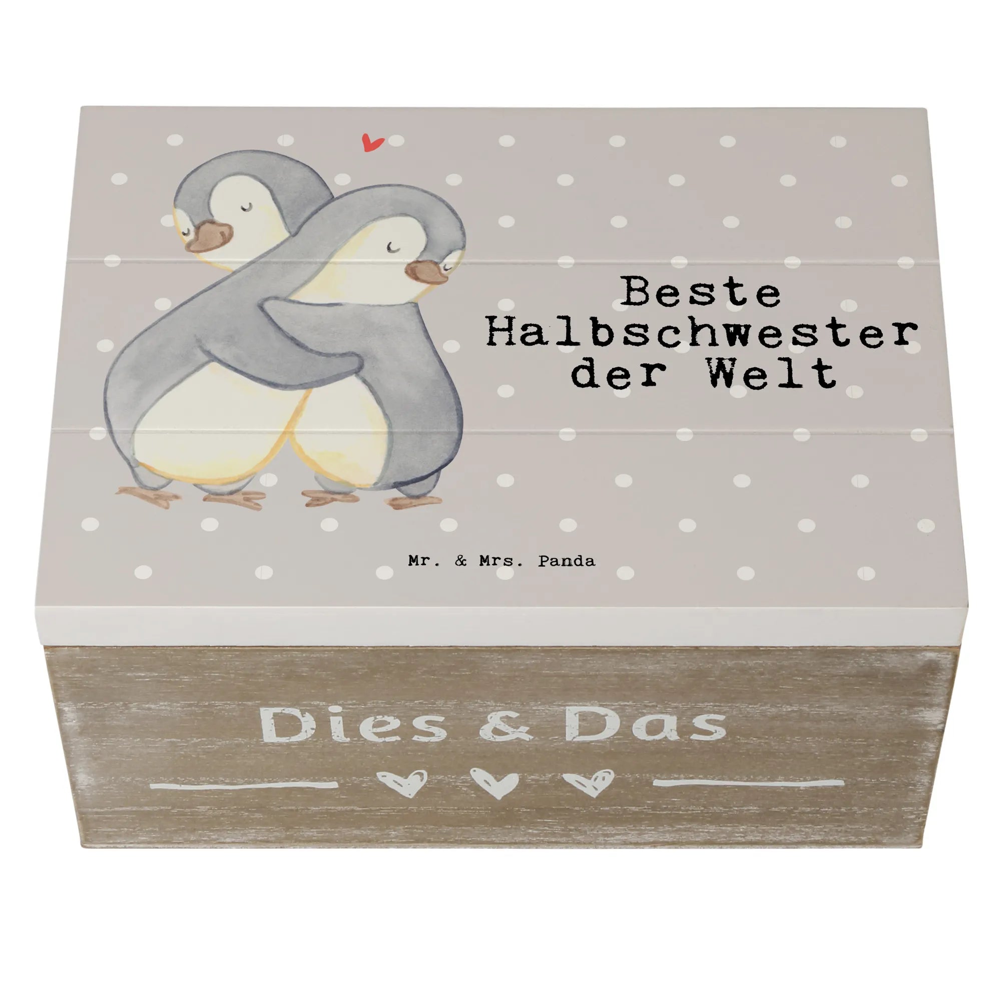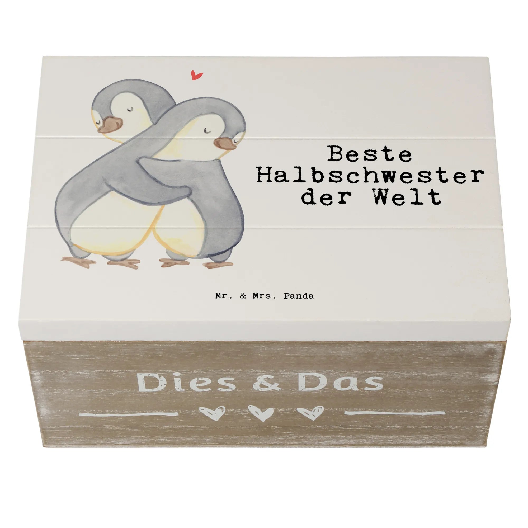 Die Holzkiste "Beste Halbschwester der Welt" von Mr. & Mrs. Panda ist das perfekte Geschenk für deine Halbschwester oder Stiefschwester. Wenn du etwas Besonderes für sie suchst, ist diese schöne Kiste genau das Richtige! Mit ihren liebevollen Motiven und dem niedlichen Pinguin-Design wird sie garantiert das Herz deiner Schwester berühren.