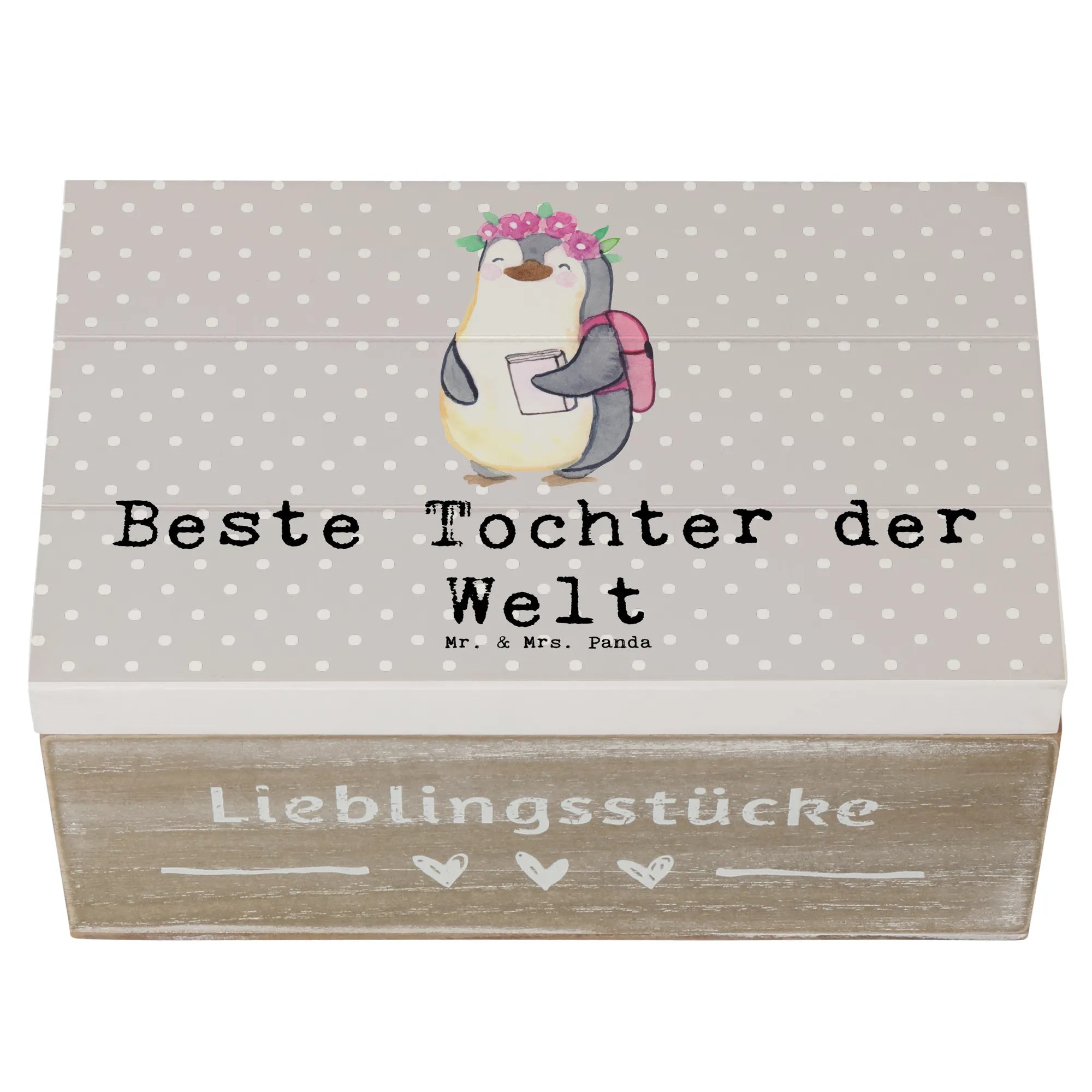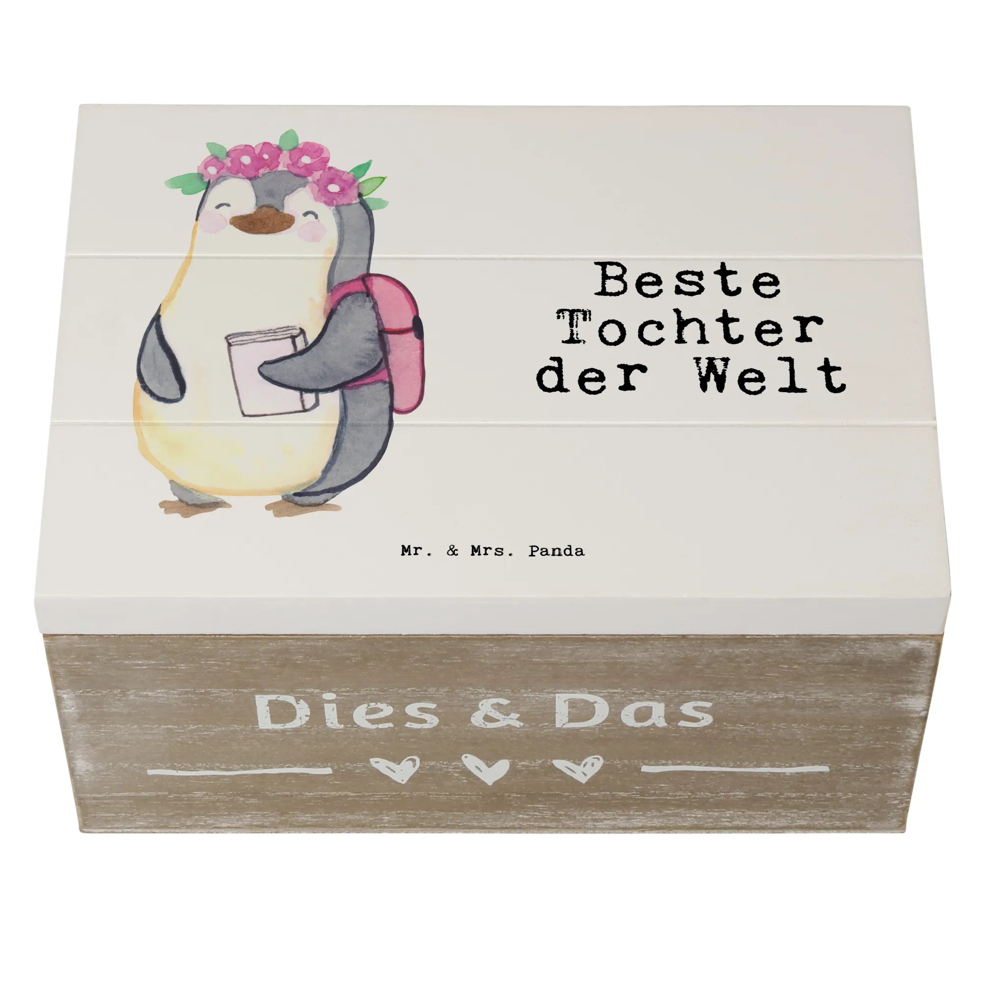Jedes Detail der Kiste fühlt sich liebevoll gestaltet an. Der kleine Pinguin auf der Vorderseite, der fröhlich mit einem Rucksack und einem Buch posiert, wird sicher das Herz jeder Tochter höher schlagen lassen. Verschenke nicht nur eine Kiste, sondern ein Stück Freude und eine Möglichkeit, Erinnerungen festzuhalten. Die Kollektion Beziehungen von Mr. & Mrs. Panda bietet viele weitere Motive, weshalb Du auch für Geschwister oder Freunde tolle Geschenke finden kannst.