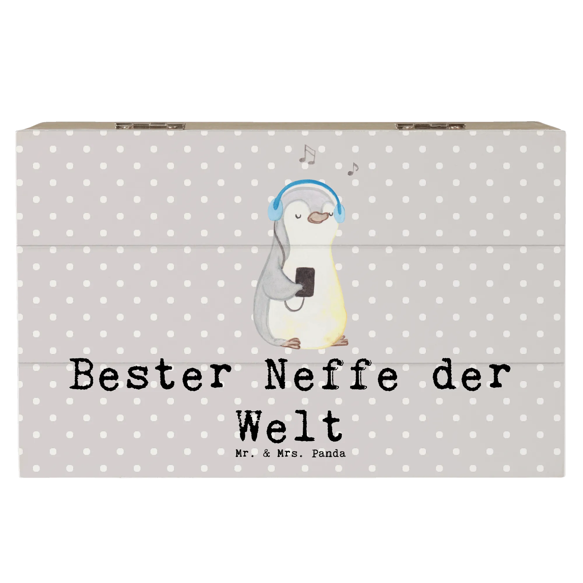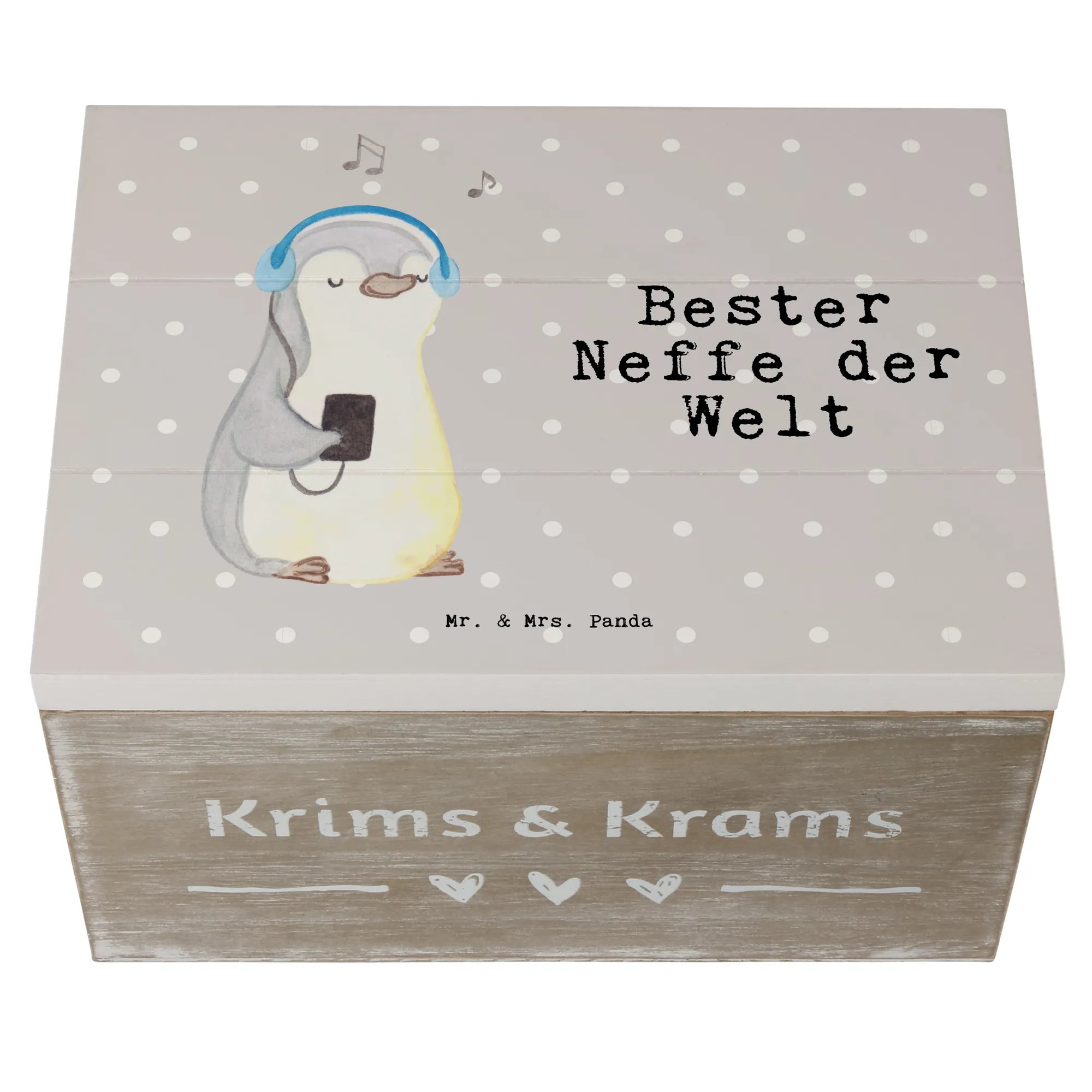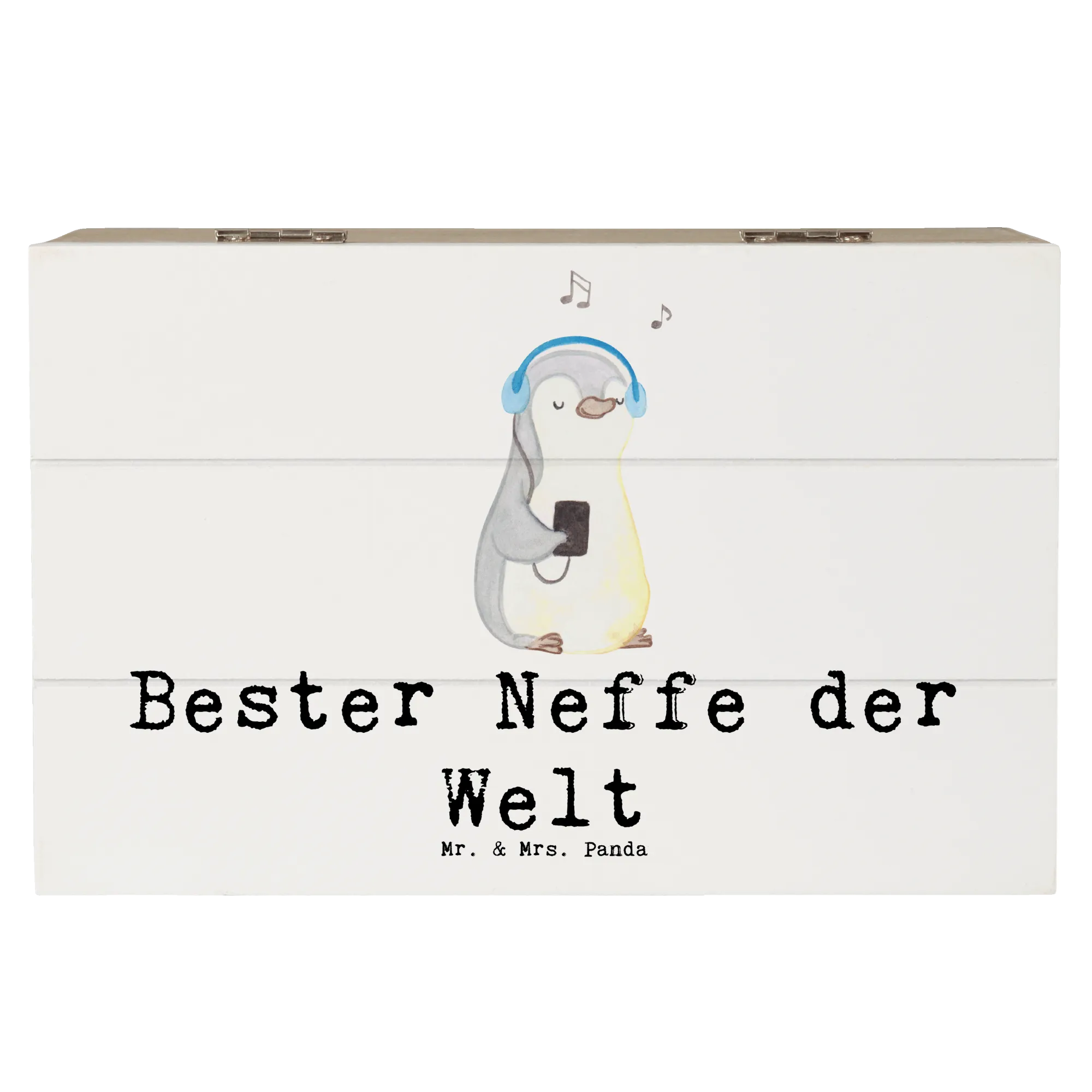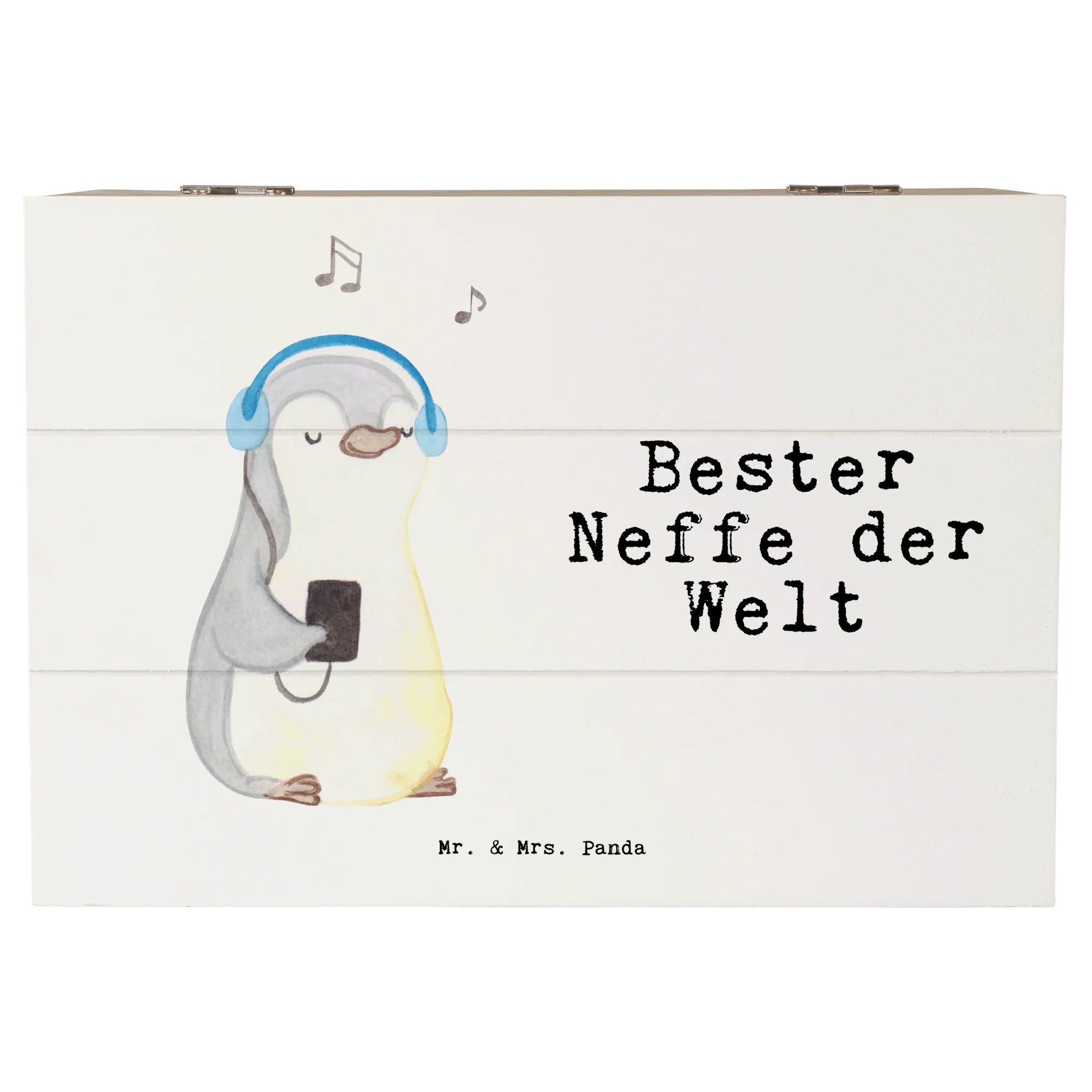 Die robuste Holzkiste, aus hochwertiger Premium Hartfaser gefertigt, besticht durch ihr süßes Design mit einem niedlichen Pinguin, der mit Kopfhörern Musik hört. Der Spruch "Bester Neffe der Welt" ist nicht nur ein schöner Zusatz, sondern auch eine liebevolle Botschaft, die Deinen Neffen wissen lässt, wie wichtig er Dir ist.
