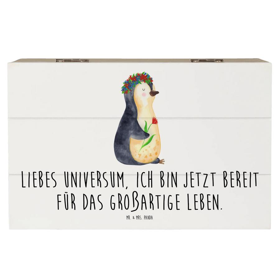 Die wunderschöne Holzkiste mit dem entzückenden Pinguin Blumenkranz-Motiv von Mr. & Mrs. Panda ist das perfekte Geschenk für all jene, die Lebensfreude und Erinnerungen schätzen. Diese Erinnerungskiste bietet nicht nur einen hübschen Platz für deine Schätze, sondern sorgt auch für ein Lächeln auf den Gesichtern deiner Liebsten.