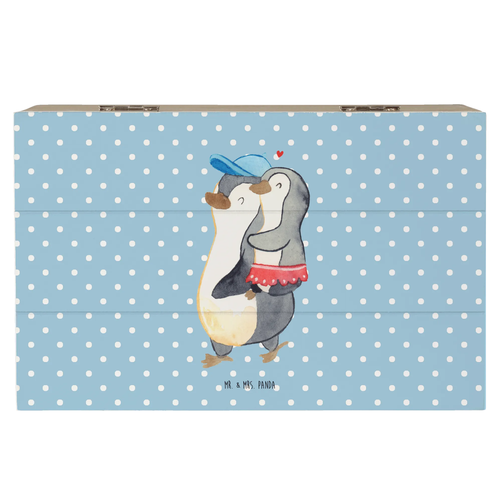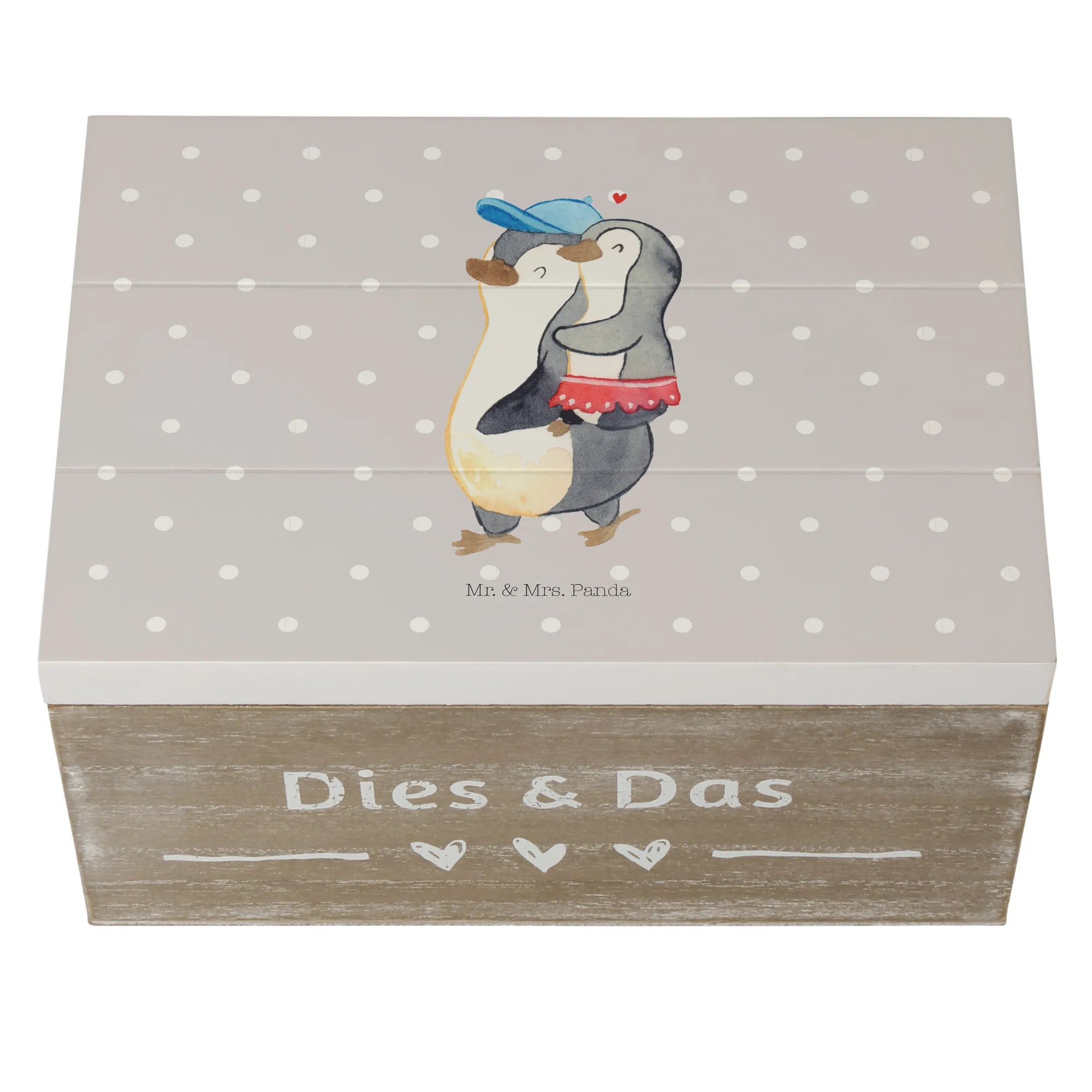 Auf dem liebevollen Motiv sieht man zwei Pinguine, die sich umarmen und Zuneigung ausstrahlen. Mit einem kleinen roten Herz, das über ihnen schwebt, vermittelt die Kiste das Gefühl von Liebe und Geborgenheit.