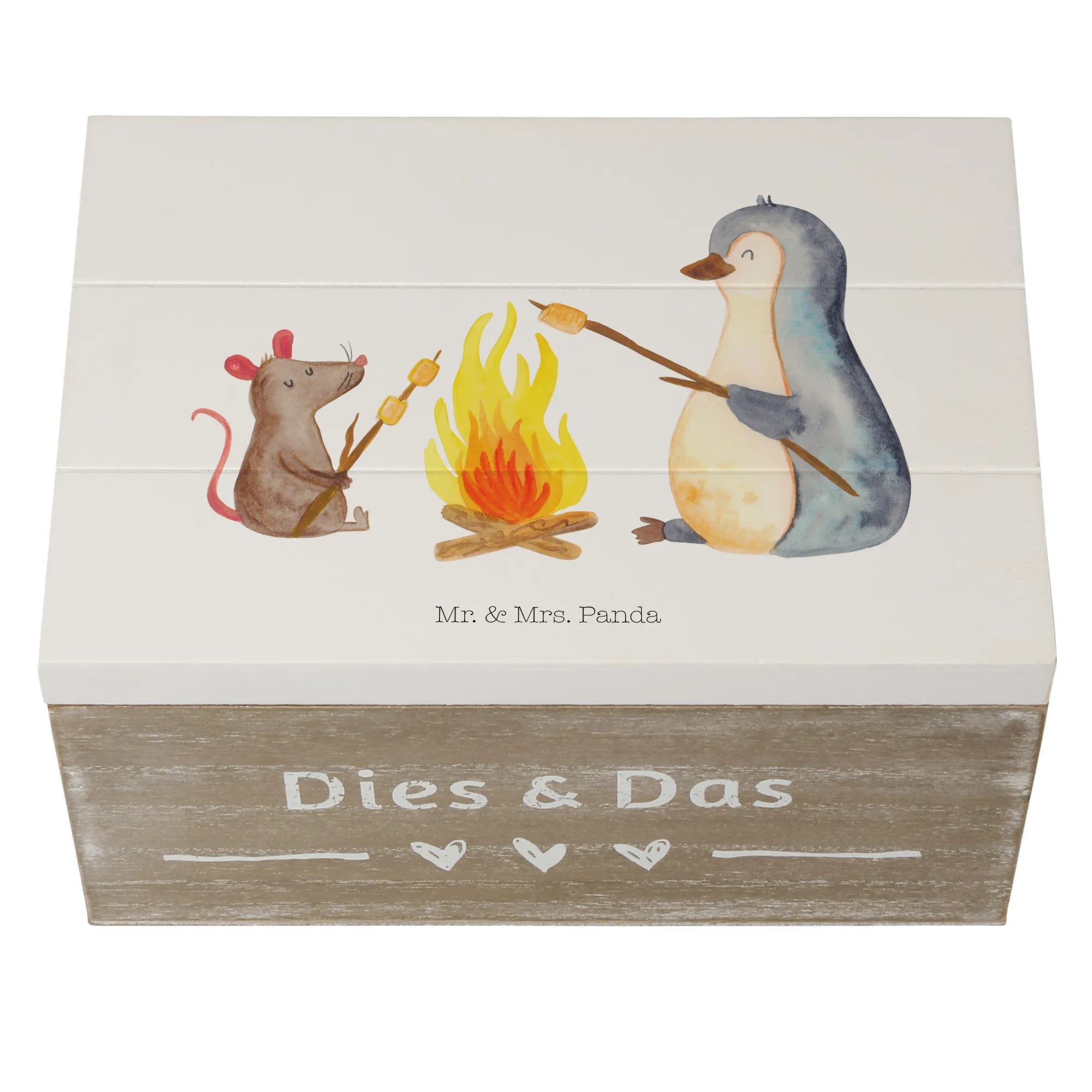 Die wunderschöne Holzkiste von Mr. & Mrs. Panda mit dem zauberhaften Motiv "Pinguin Lagerfeuer" ist der perfekte Aufbewahrungsort für all deine kostbaren Erinnerungen!