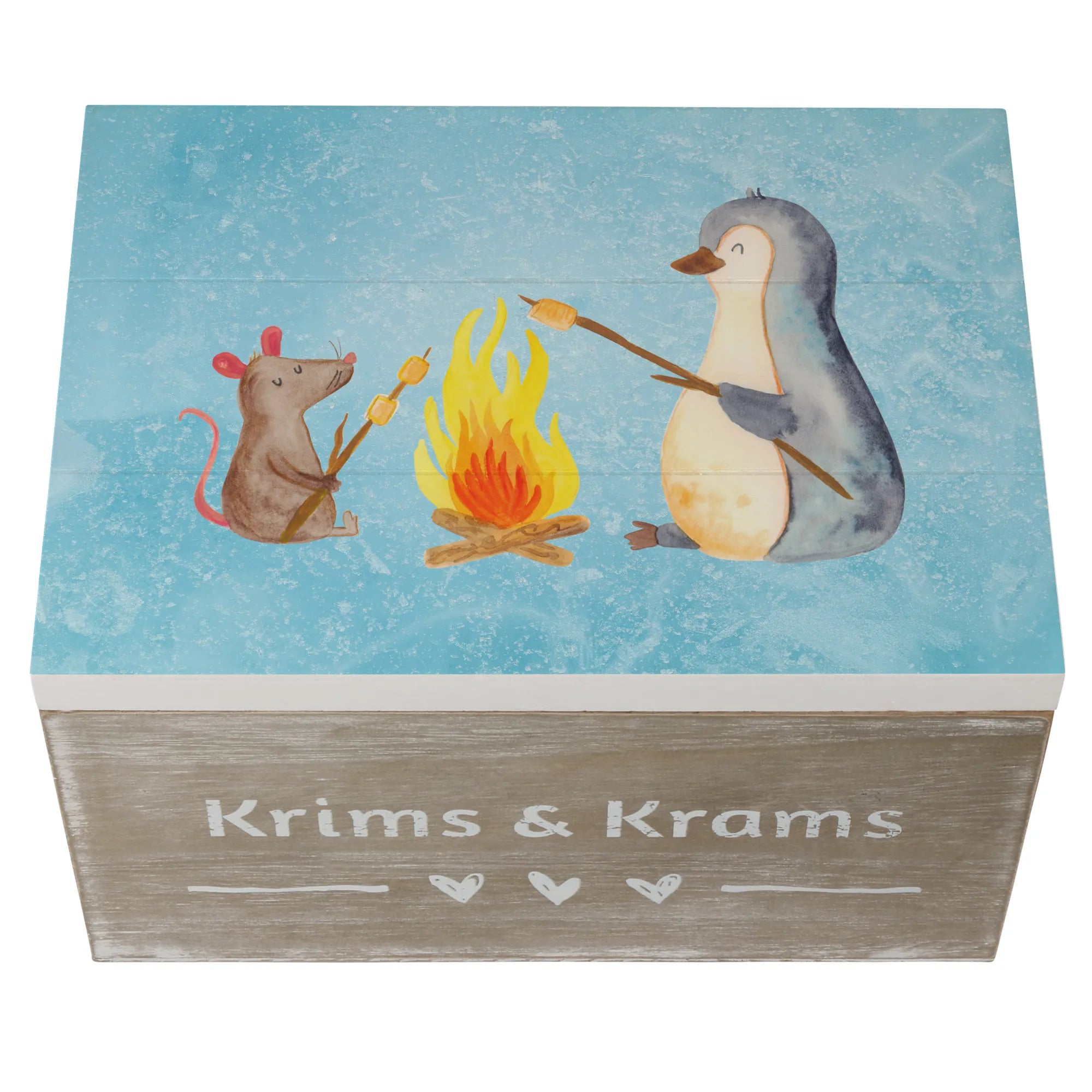Diese liebevoll gestaltete Erinnerungskiste aus robuster Holzfaser bietet nicht nur ausreichend Platz für all deine wertvollen Schätze, sondern besticht auch durch ein wunderschönes Motiv mit einem hohen Wiedererkennungswert. Der niedliche Pinguin und die fröhliche Maus, die gemeinsam am Lagerfeuer Marshmallows rösten, versprühen eine wunderbare, gemütliche Atmosphäre.