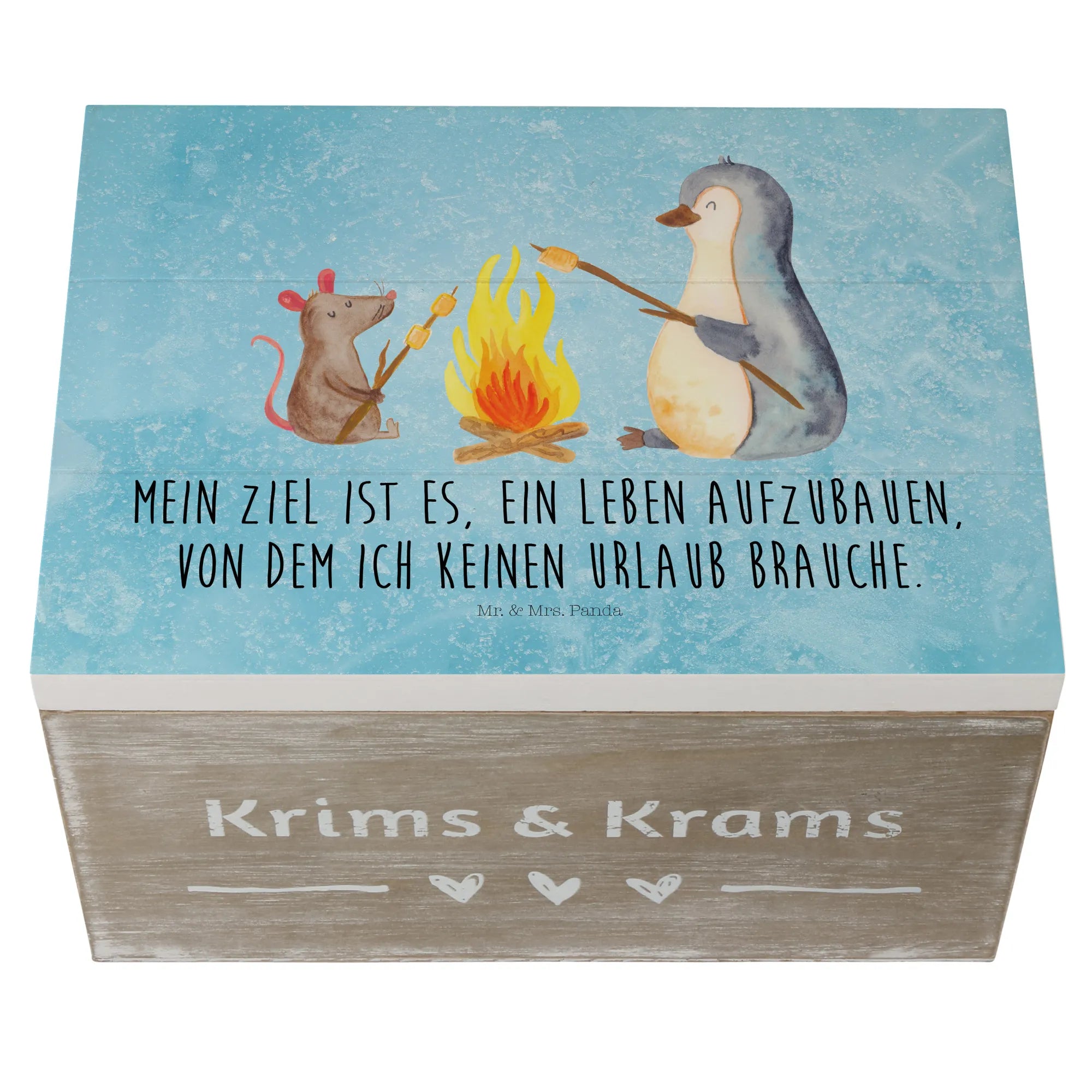 Eine wunderschöne Holzkiste von Mr. & Mrs. Panda – bedruckt mit dem liebevollen Pinguin Lagerfeuer Motiv und dem Spruch „Mein Ziel ist es, ein Leben aufzubauen, von dem ich keinen Urlaub brauche.“ Diese Erinnerungskiste vereint charmante Illustration und praktische Funktion in einem. Das Motiv zeigt einen süßen Pinguin und eine kleine Maus am Lagerfeuer beim Marshmallow-Grillen – ein Bild voller Wärme, Nähe und kleinen Alltagsglücksmomenten.