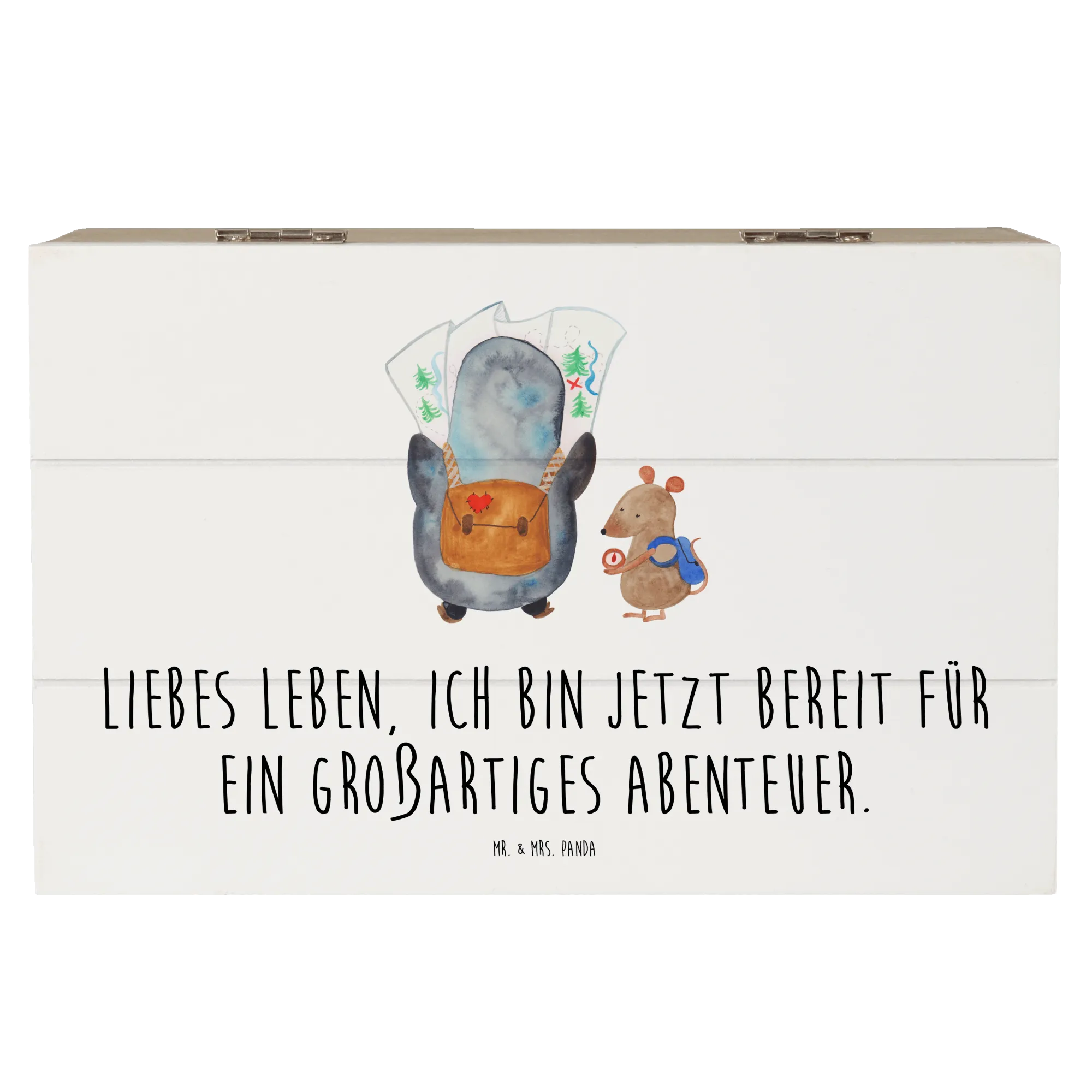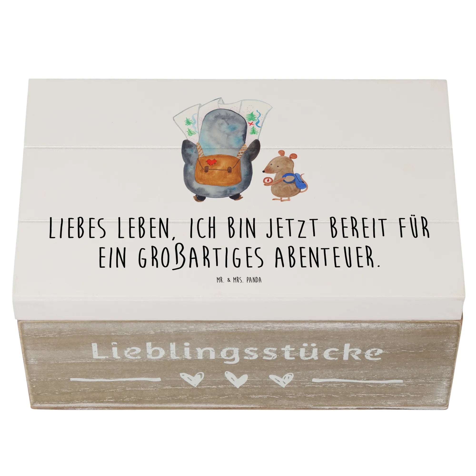 Mr. & Mrs. Panda Holzkiste „Pinguin & Maus Wanderer“ – eine zauberhafte Schatzkiste aus der Pinguin - Kollektion, ideal für alle, die Abenteuer lieben. 🐧🐭 Die niedlichen Gefährten planen gemeinsam ihren nächsten Ausflug: Der Pinguin schaut auf die Landkarte, die Maus prüft den Kompass. Dazu begleitet dich der Spruch: „Liebes Leben, ich bin jetzt bereit für ein großartiges Abenteuer.“