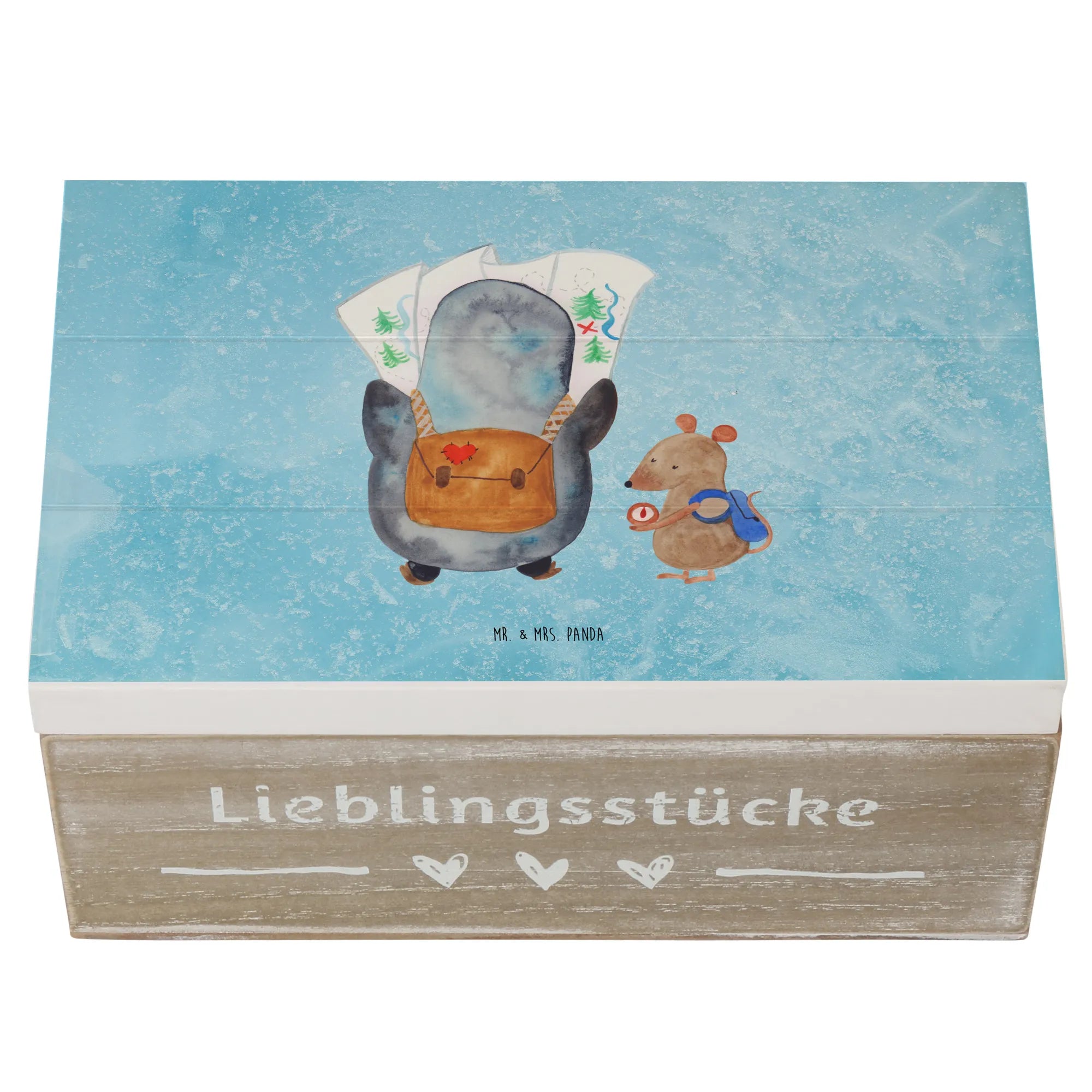 Die wunderschöne Holzkiste "Pinguin & Maus Wanderer" aus der Pinguin-Kollektion von Mr. & Mrs. Panda ist der perfekte Aufbewahrungsort für all deine wertvollen Schätze!