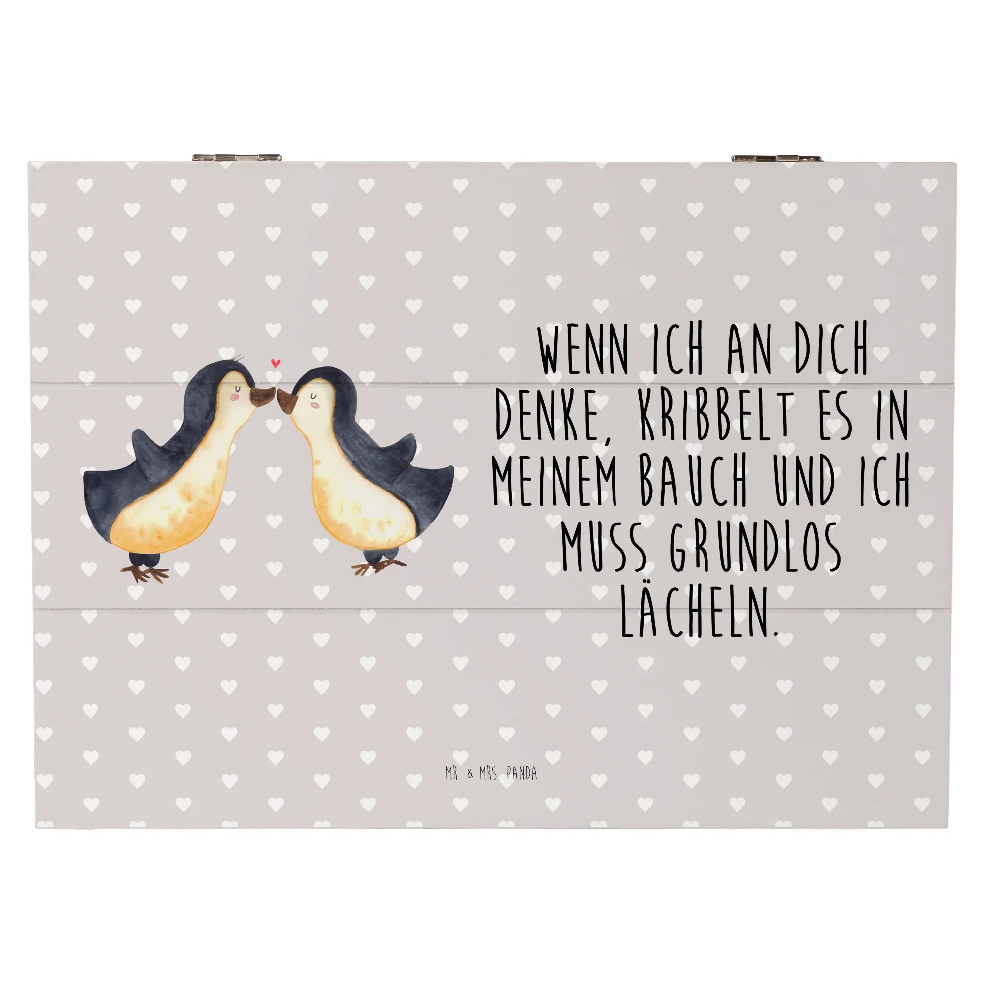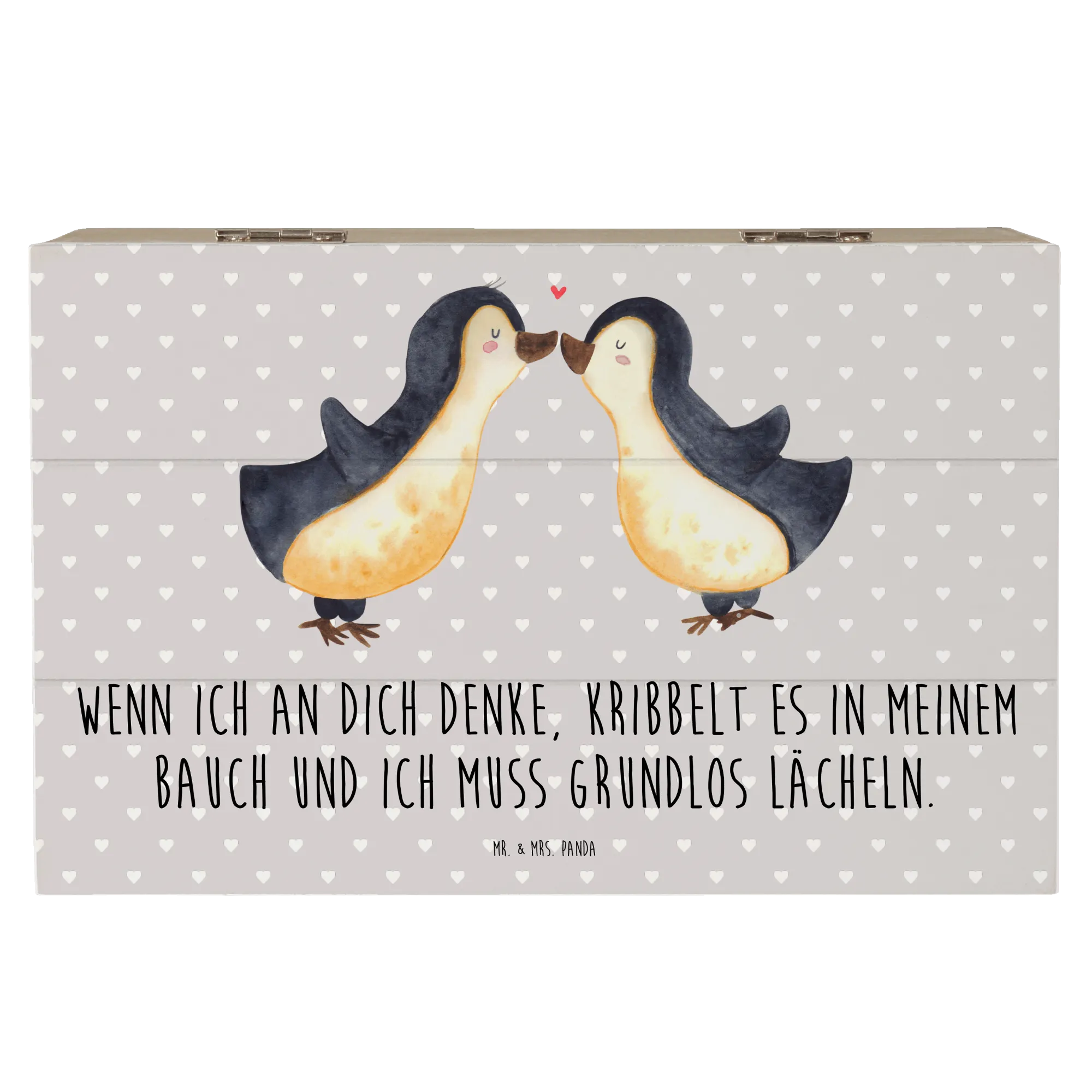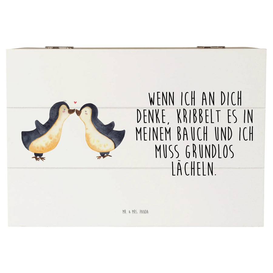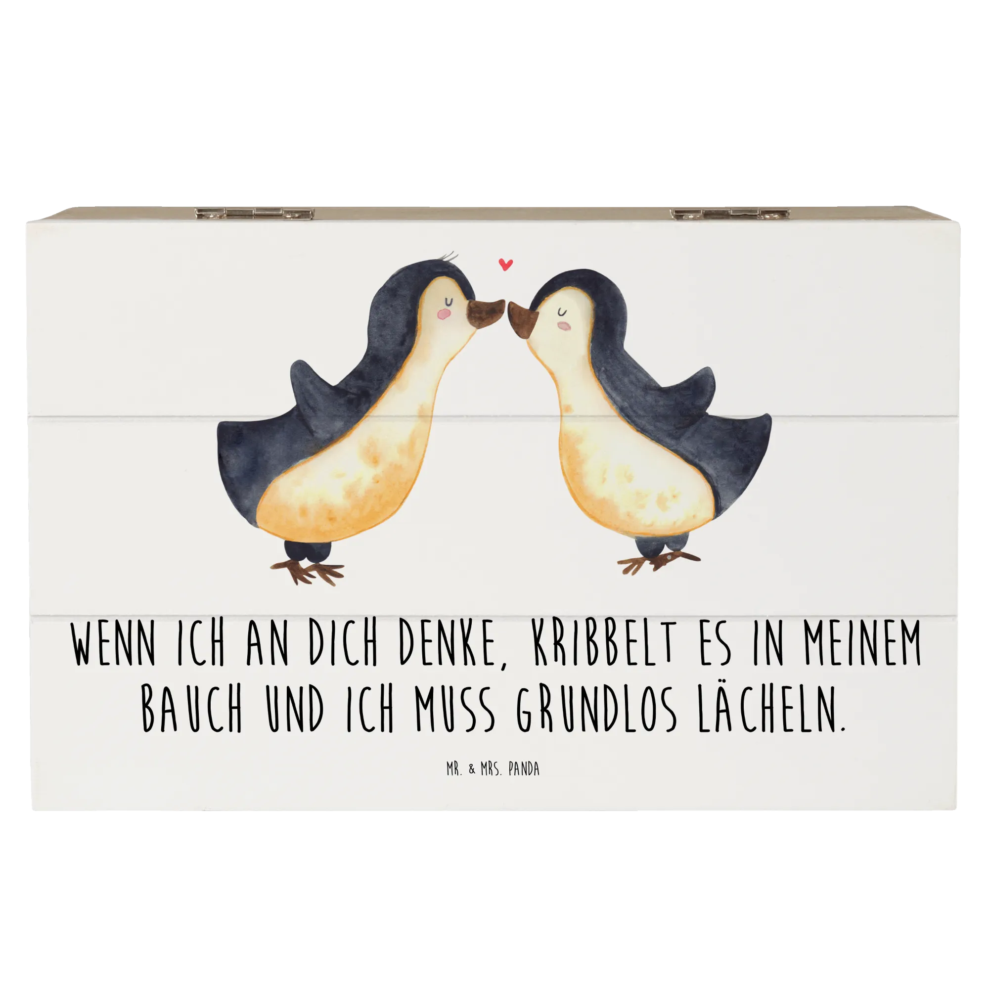 Die wunderschöne Holzkiste Pinguine Kuss von Mr. & Mrs. Panda ist das perfekte Geschenk für alle, die ihre Liebe auf eine besondere Art und Weise ausdrücken möchten. Diese dekorative Kiste ist ideal als Aufbewahrungsort für wertvolle Erinnerungen: Von Fotos über kleine Schätze bis hin zu besonderen Momenten aus der Kindheit.