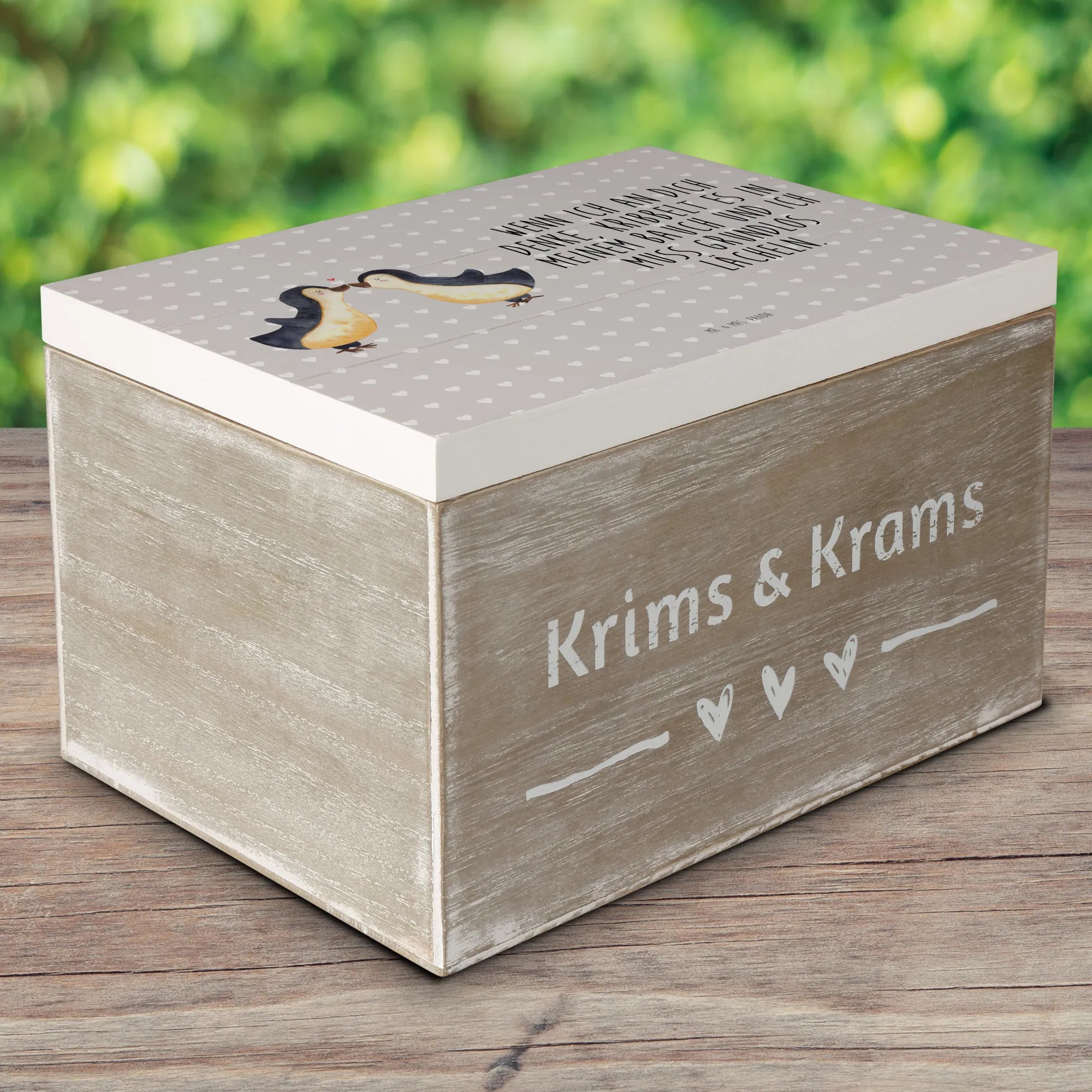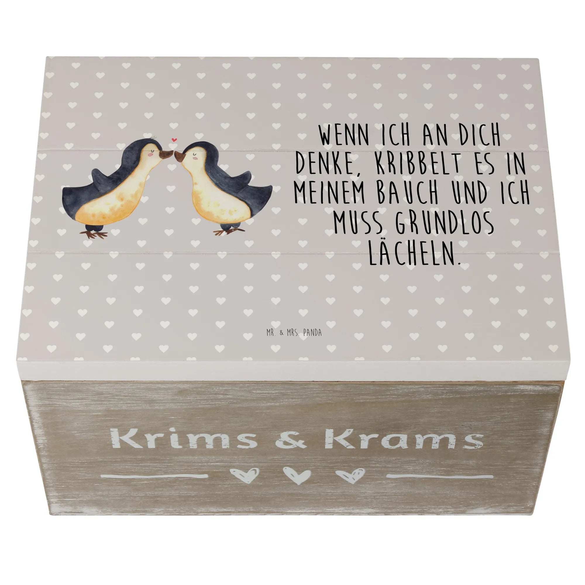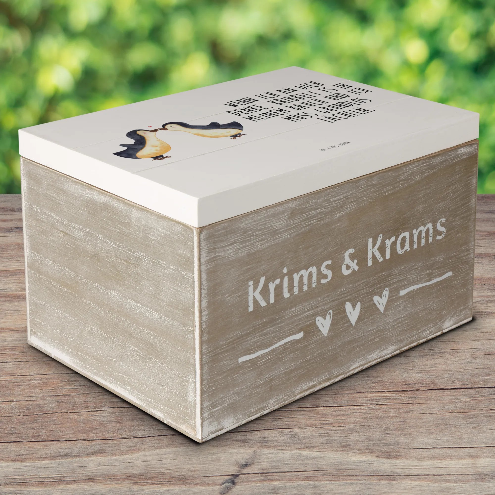 Die wunderschöne Holzkiste Pinguine Kuss von Mr. & Mrs. Panda ist das perfekte Geschenk für alle, die ihre Liebe auf eine besondere Art und Weise ausdrücken möchten. Diese dekorative Kiste ist ideal als Aufbewahrungsort für wertvolle Erinnerungen: Von Fotos über kleine Schätze bis hin zu besonderen Momenten aus der Kindheit.