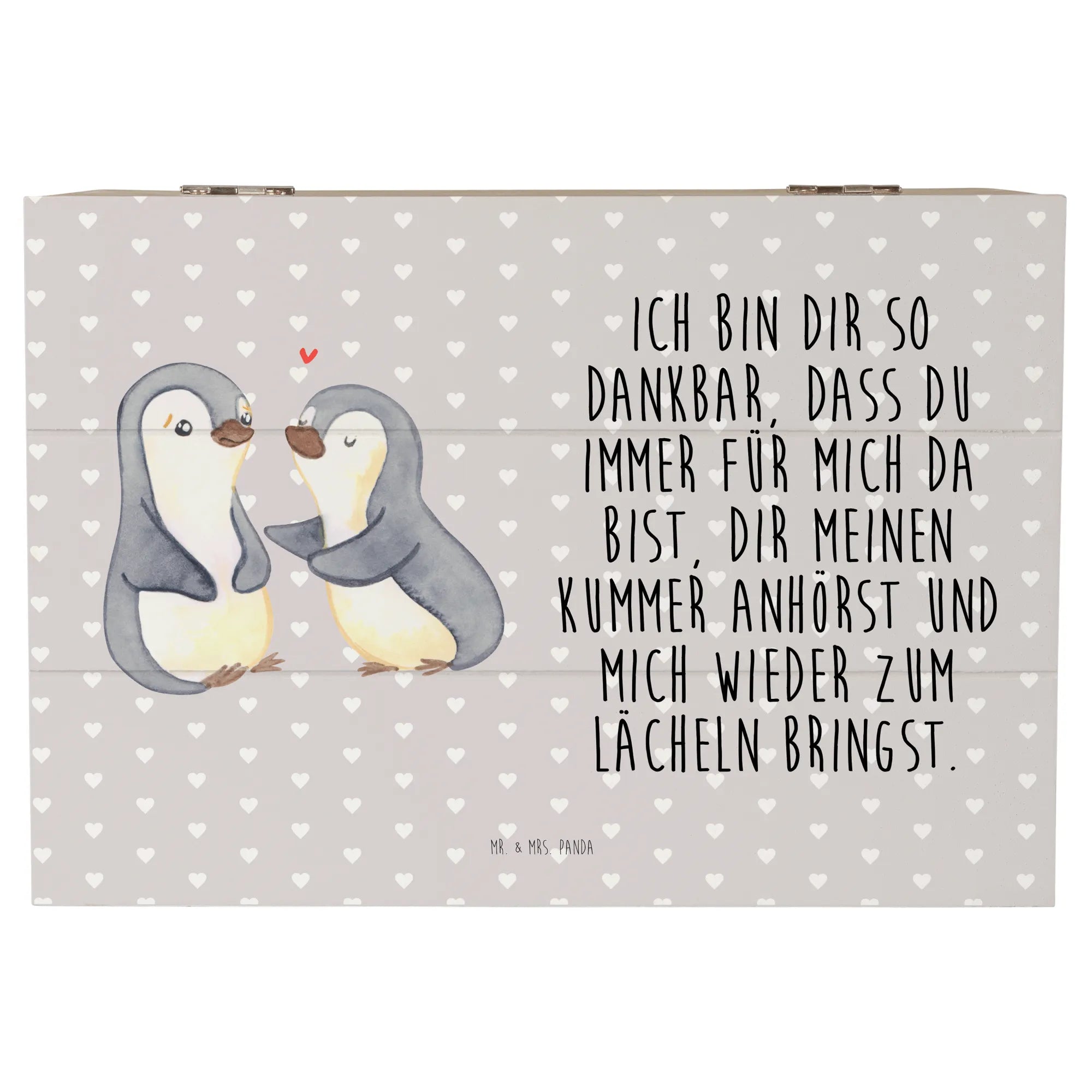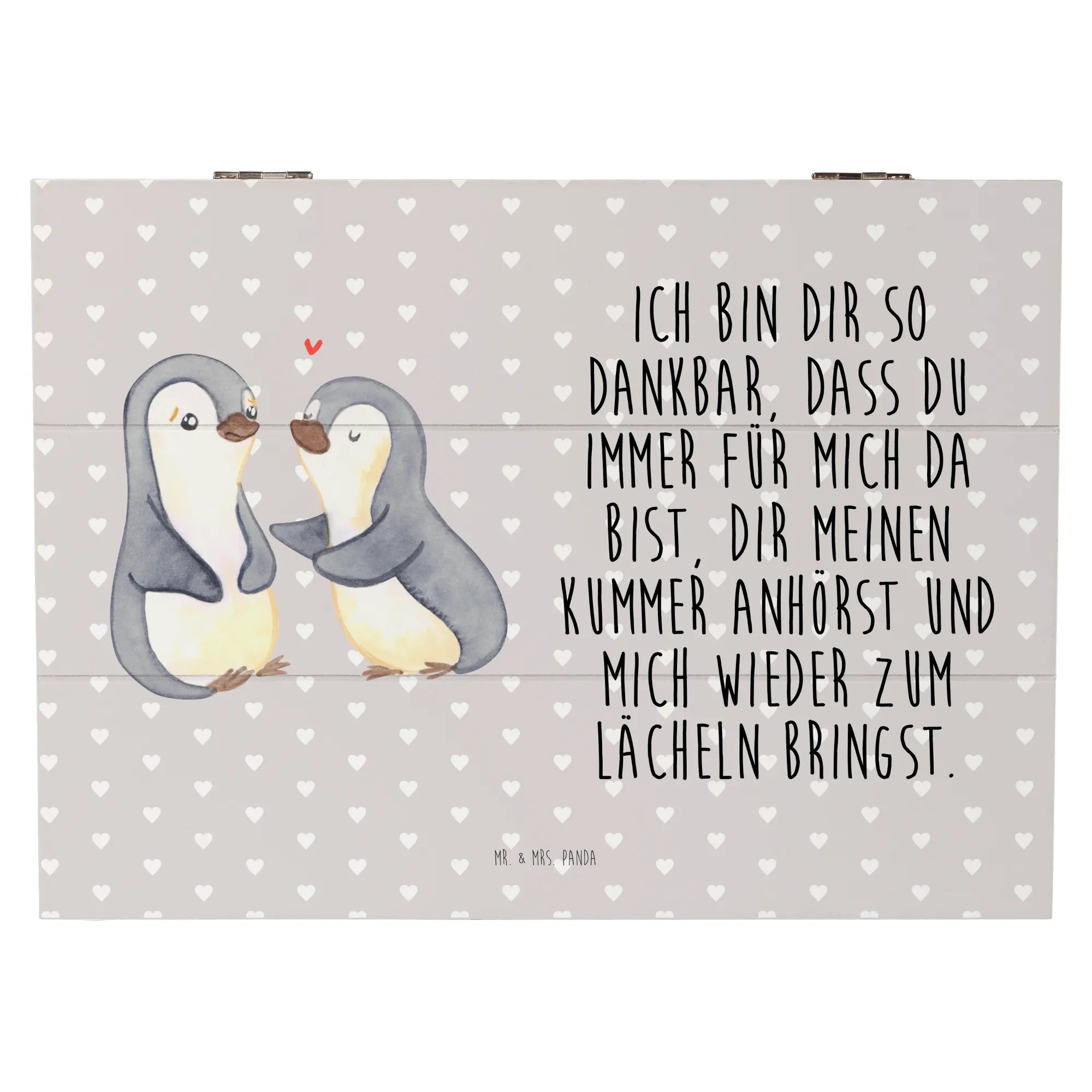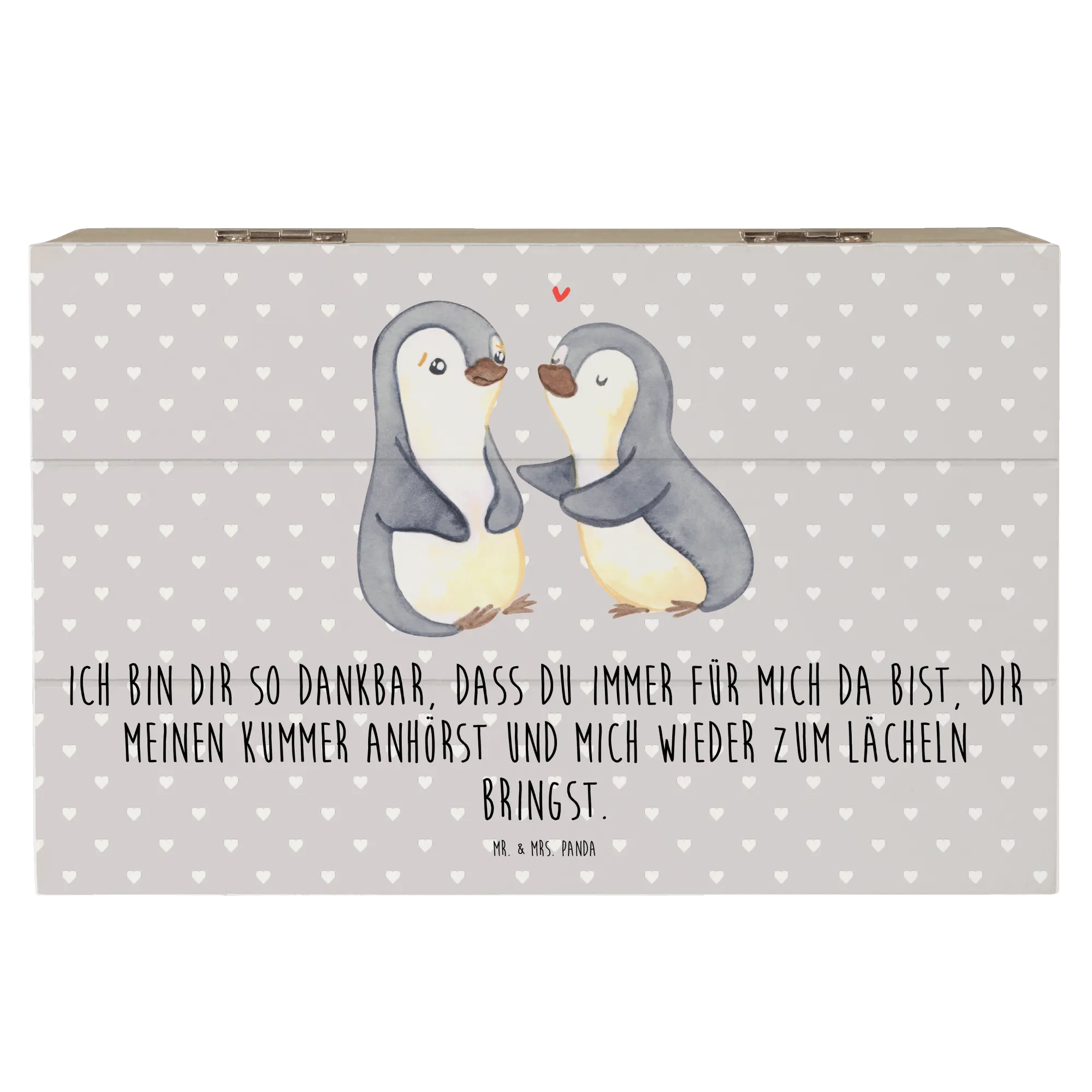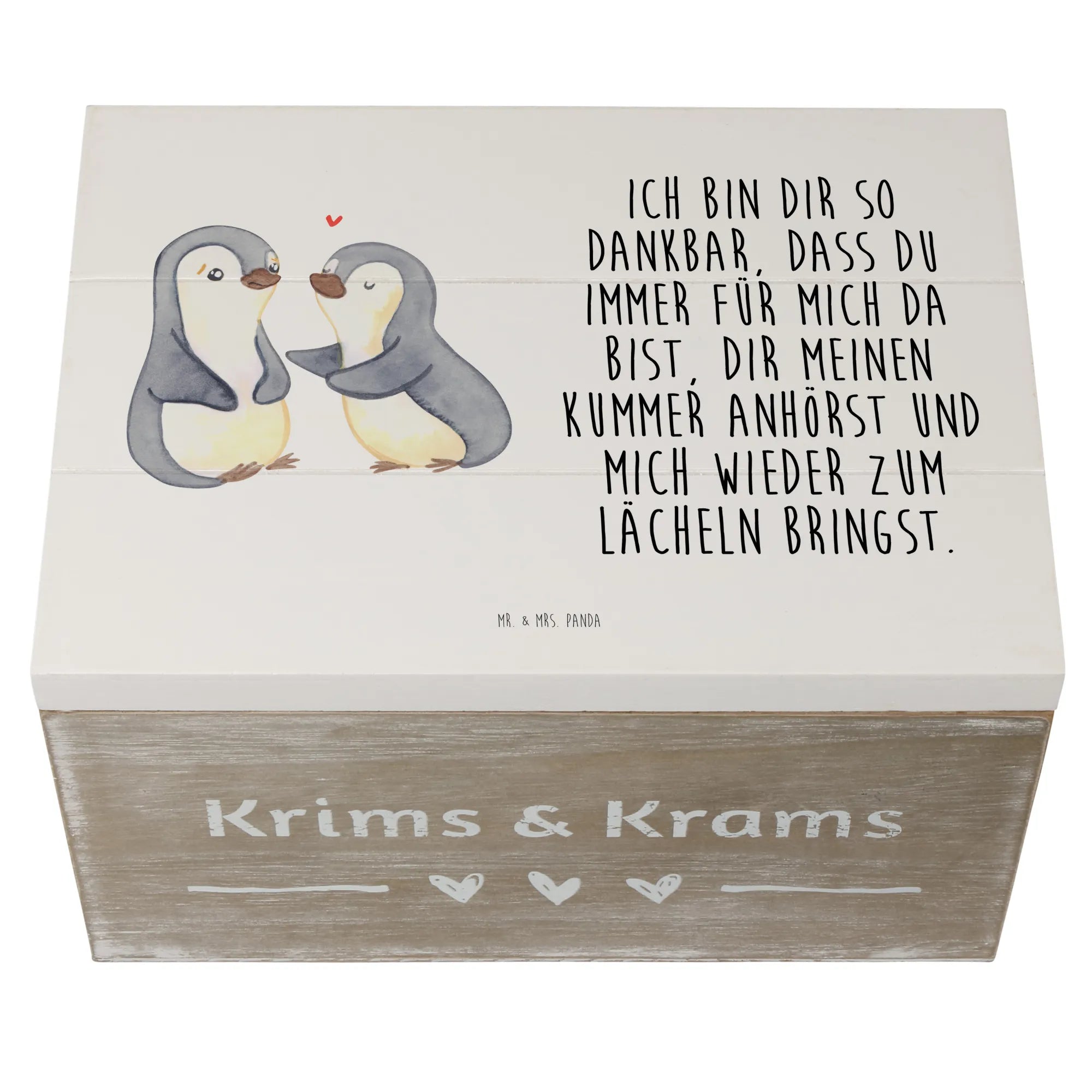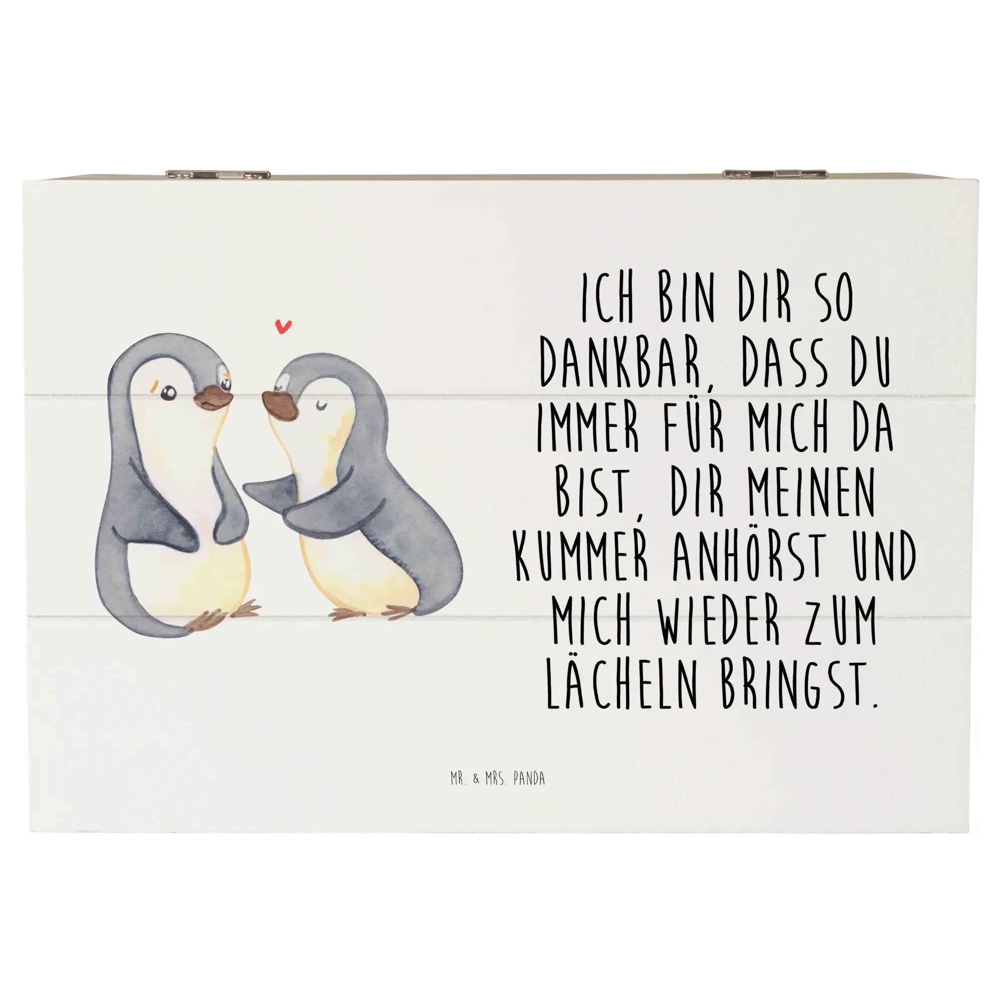 Eine kleine Schatztruhe voller Liebe: Unsere Holzkiste „Pinguine trösten“ aus der Liebe-Kollektion von Mr. & Mrs. Panda ist mehr als nur eine Aufbewahrungsbox. Auf dem Deckel nisten zwei zärtliche Pinguine, die sich tröstend zuneigen, begleitet von dem liebevollen Spruch „Ich bin dir so dankbar, dass du immer für mich da bist, dir meinen Kummer anhörst und mich wieder zum Lächeln bringst.“ 🎁 Dieses Design bringt Wärme, Geborgenheit und echtes Gefühl in jedes Zuhause.