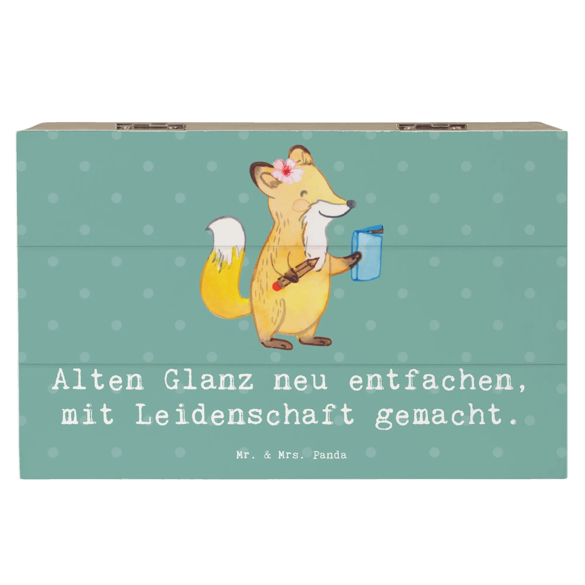 Die hochwertige Holzkiste besteht aus robuster Holzfaser und überzeugt durch ihre Stabilität und Langlebigkeit. Das liebevolle Design mit dem Spruch 'Alten Glanz neu entfachen, mit Leidenschaft gemacht.' spricht Kreative und Handwerksbegeisterte an. Die Arbeit einer Polsterin erfordert Geduld, Präzision und viel Talent; diese Kiste fängt genau dieses Gefühl ein.