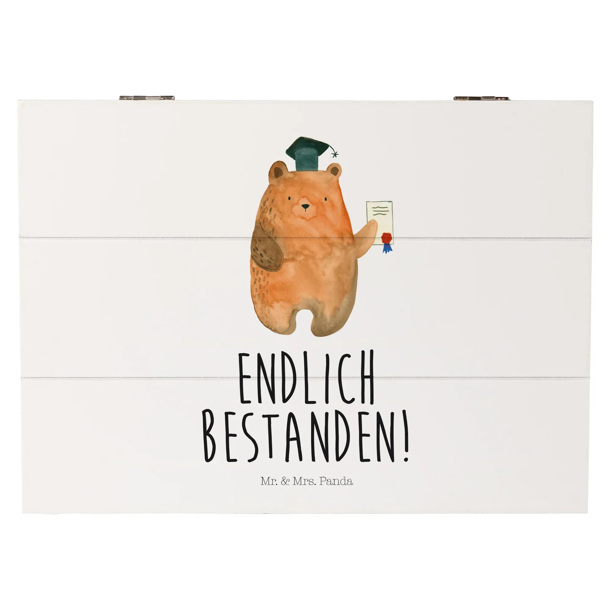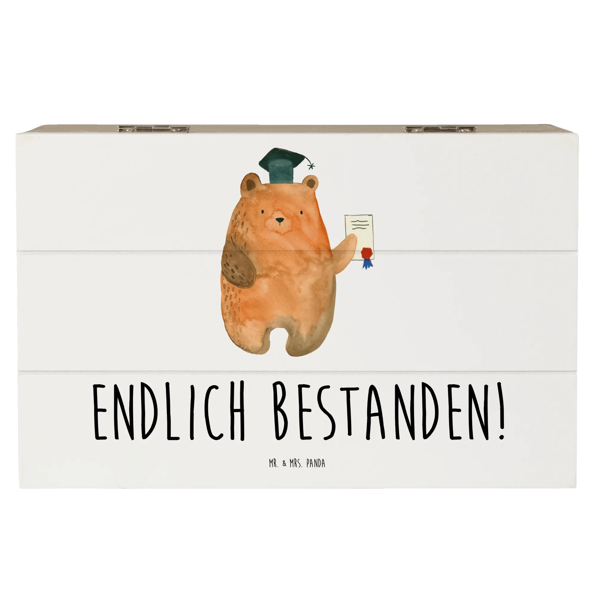 Die wunderschöne Holzkiste von Mr. & Mrs. Panda ist der ideale Begleiter für all eure wertvollen Erinnerungen! Mit dem niedlichen Prüfungsbär-Motiv und dem Slogan "Endlich bestanden!" ist diese dekorative Kiste perfekt geeignet, um besondere Augenblicke eures Lebens zu bewahren.