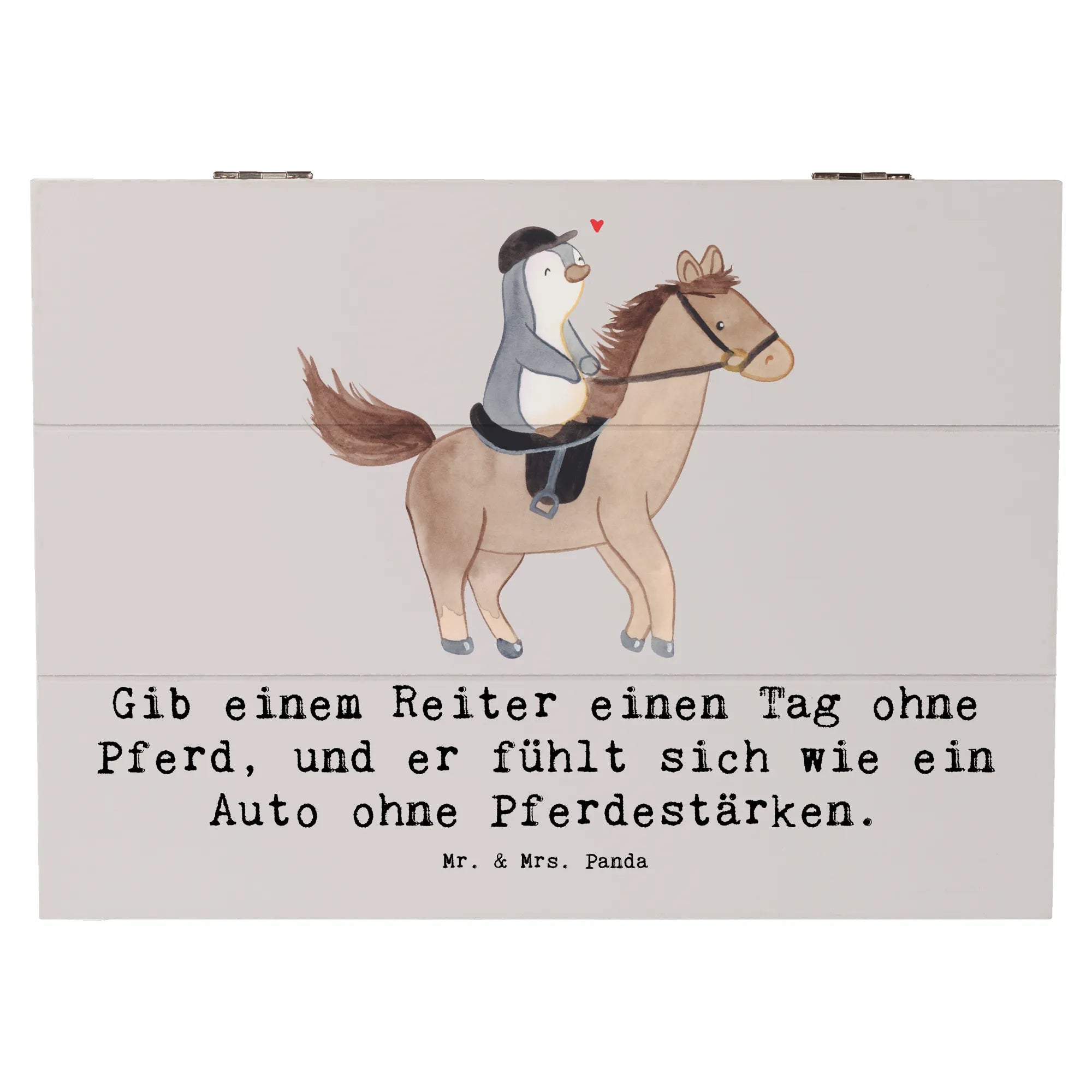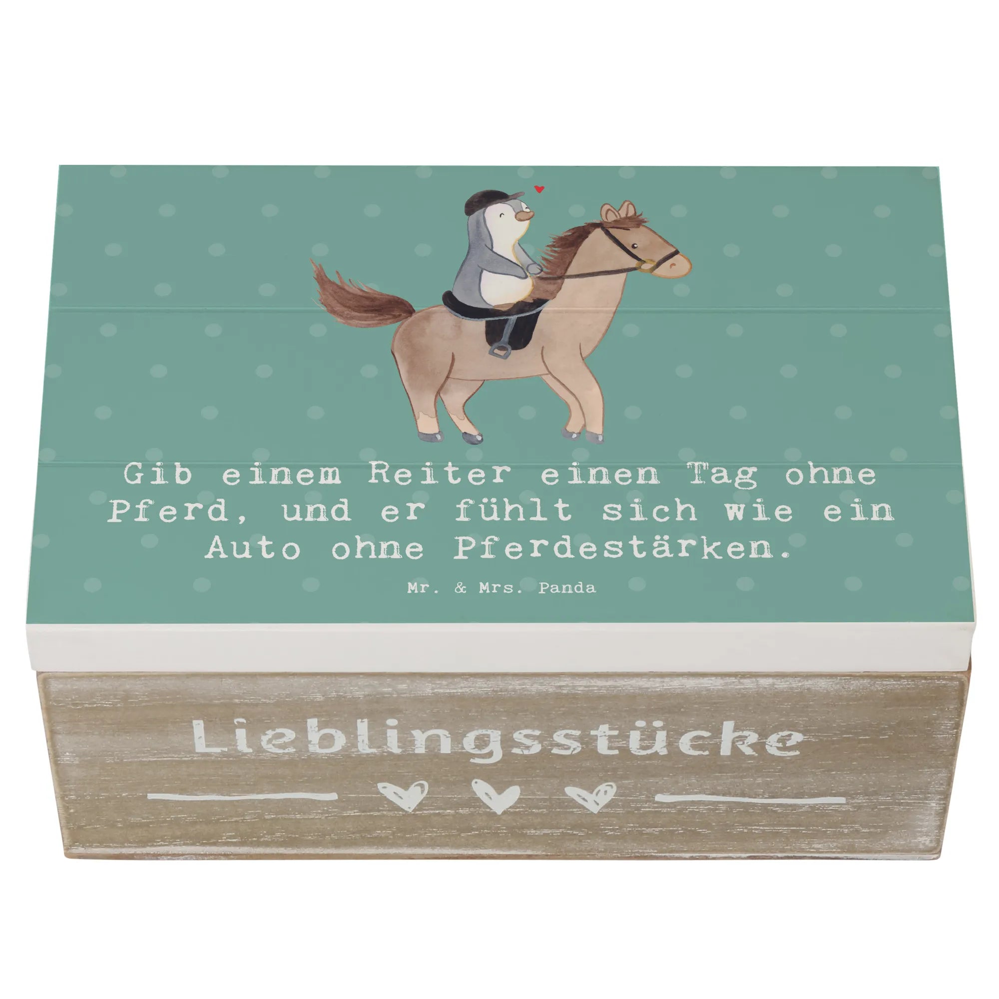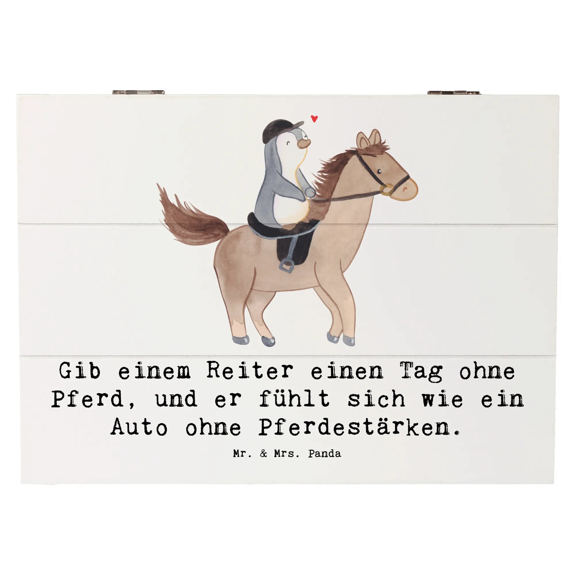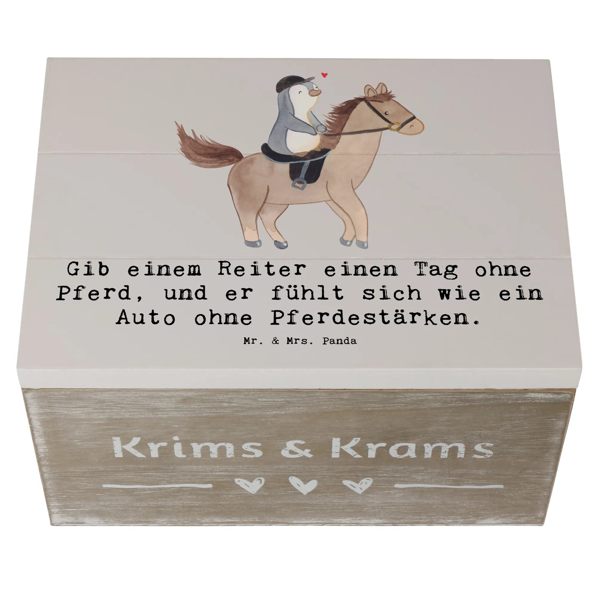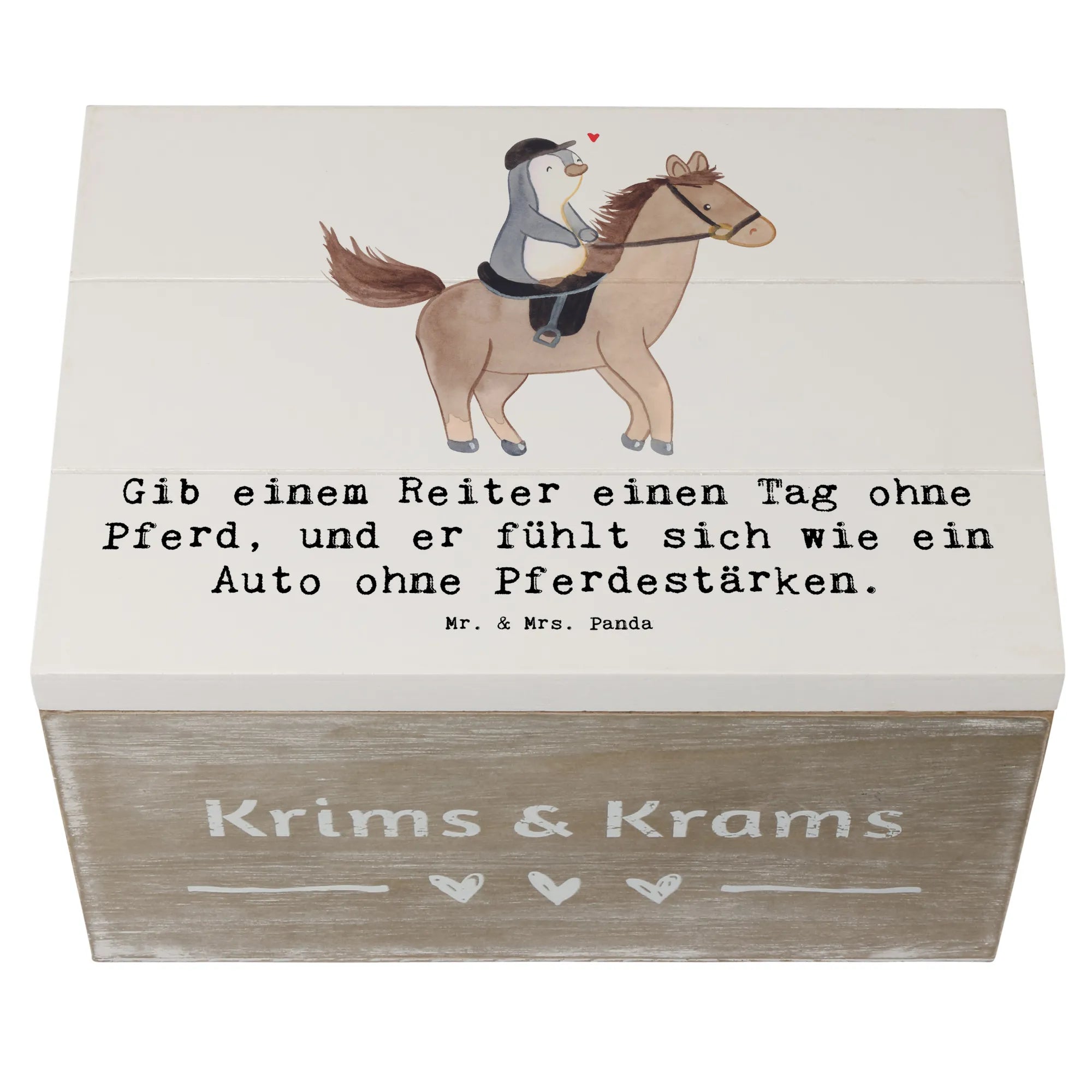 Die wunderschöne Holzkiste von Mr. & Mrs. Panda ist das perfekte Geschenk für alle Reitsportbegeisterten! Mit dem liebevollen Spruch: 'Gib einem Reiter einen Tag ohne Pferd, und er fühlt sich wie ein Auto ohne Pferdestärken.' wird diese Kiste zu einem echten Schatz für Erinnerungen rund um das Thema Pferde und Reitsport.