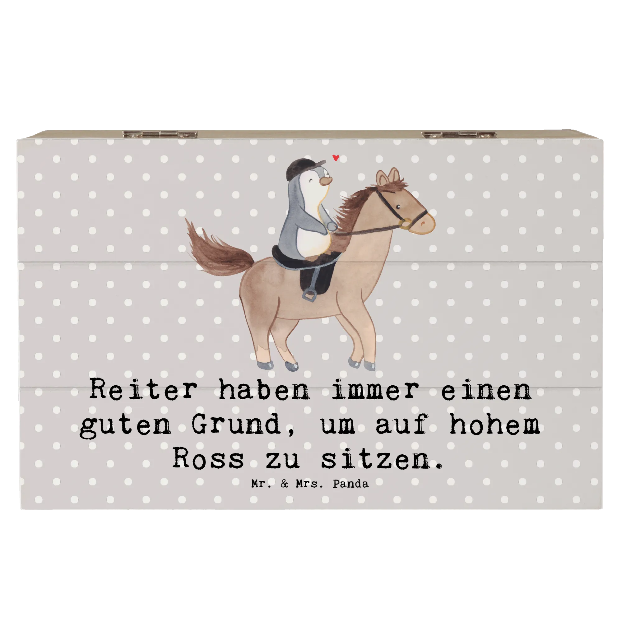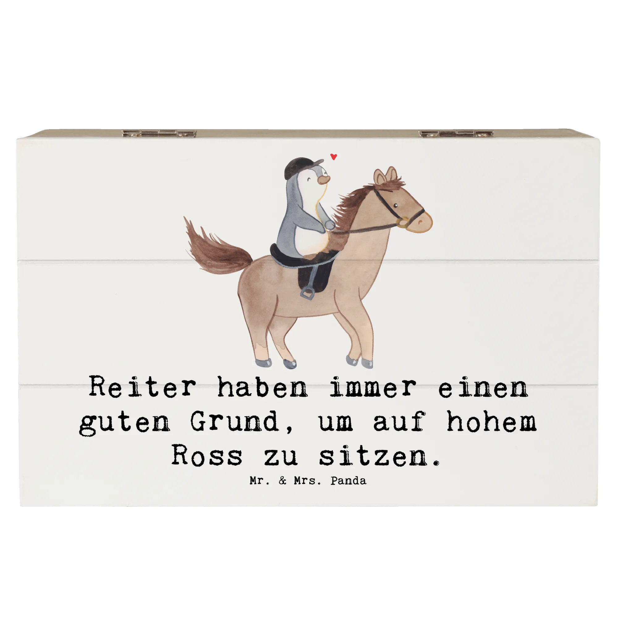 Mit ihrem liebevollen Motiv aus dem Bereich Reitsport und dem Slogan 'Reiter haben immer einen guten Grund, um auf hohem Ross zu sitzen', wird sie zum Highlight jedes Zimmers. Die robuste Holzkiste ist ideal als Aufbewahrungsort für wertvolle Schätze, Fotos oder Andenken und sorgt dafür, dass alles sicher und ordentlich verstaut ist.