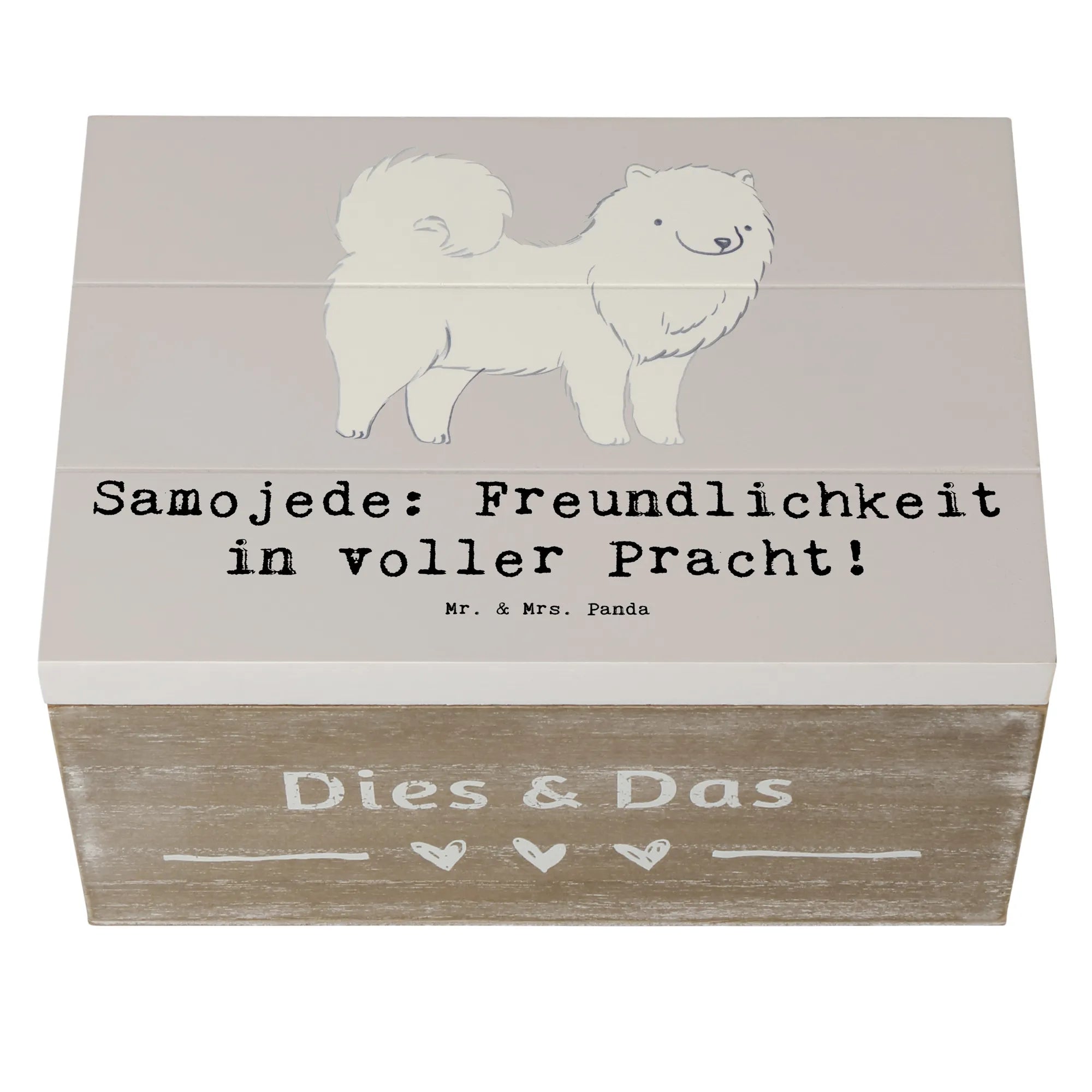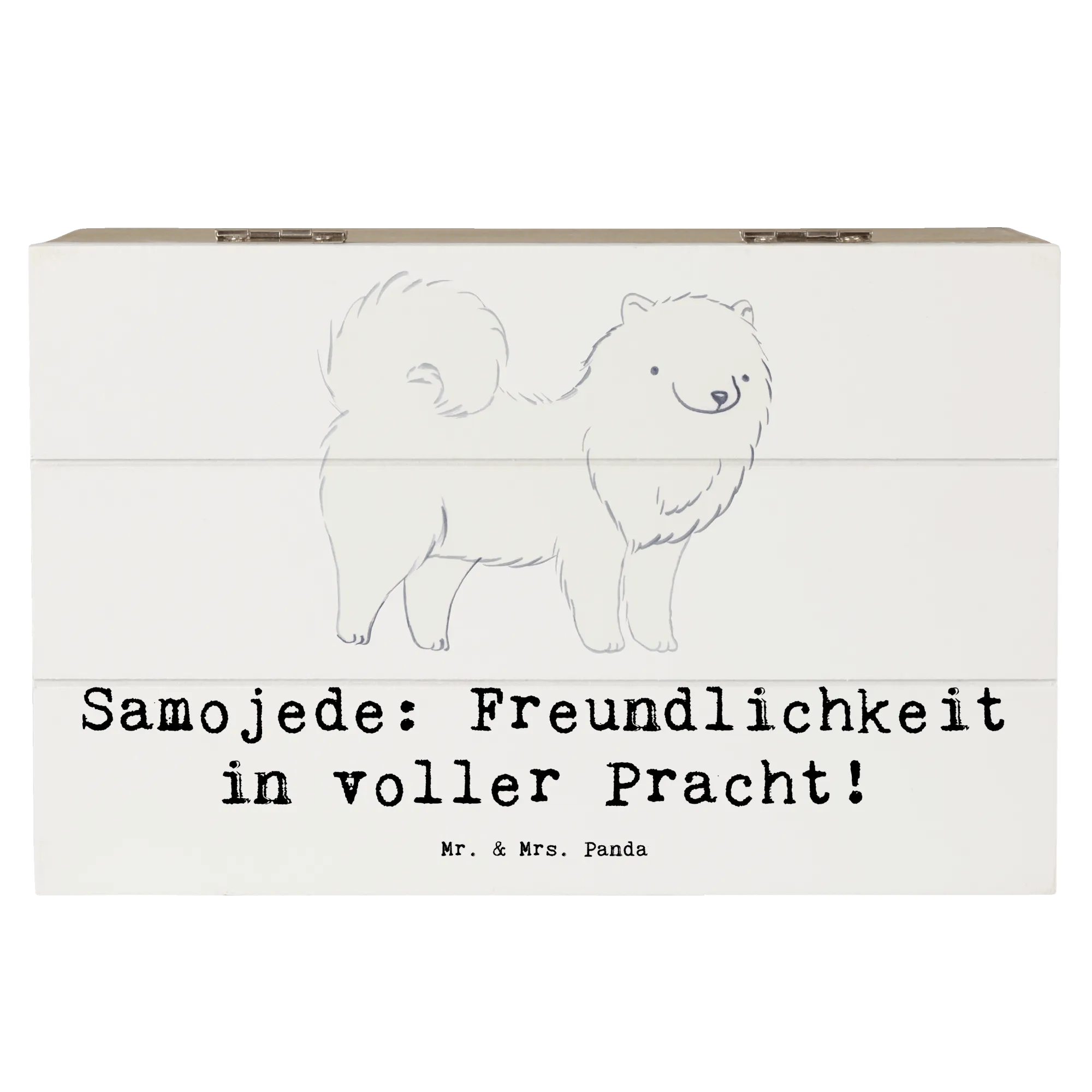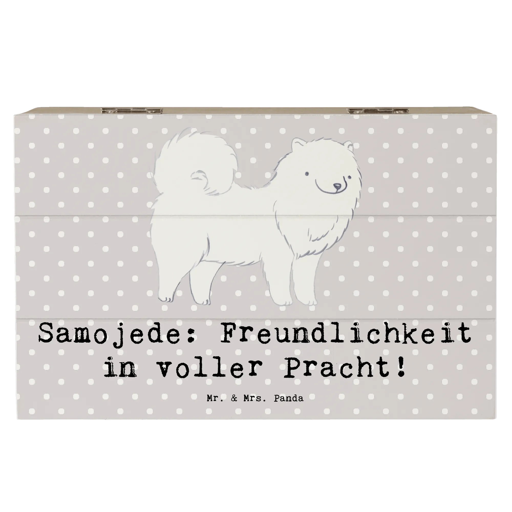 Die wunderschöne Holzkiste von Mr. & Mrs. Panda mit dem charmanten Samojede-Motiv ist das perfekte Geschenk für alle Hundeliebhaber und Hundefans. Mit dem Slogan "Samojede: Freundlichkeit in voller Pracht!" strahlt diese Kiste pure Lebensfreude aus und bietet gleichzeitig Platz für deine wertvollsten Erinnerungen.