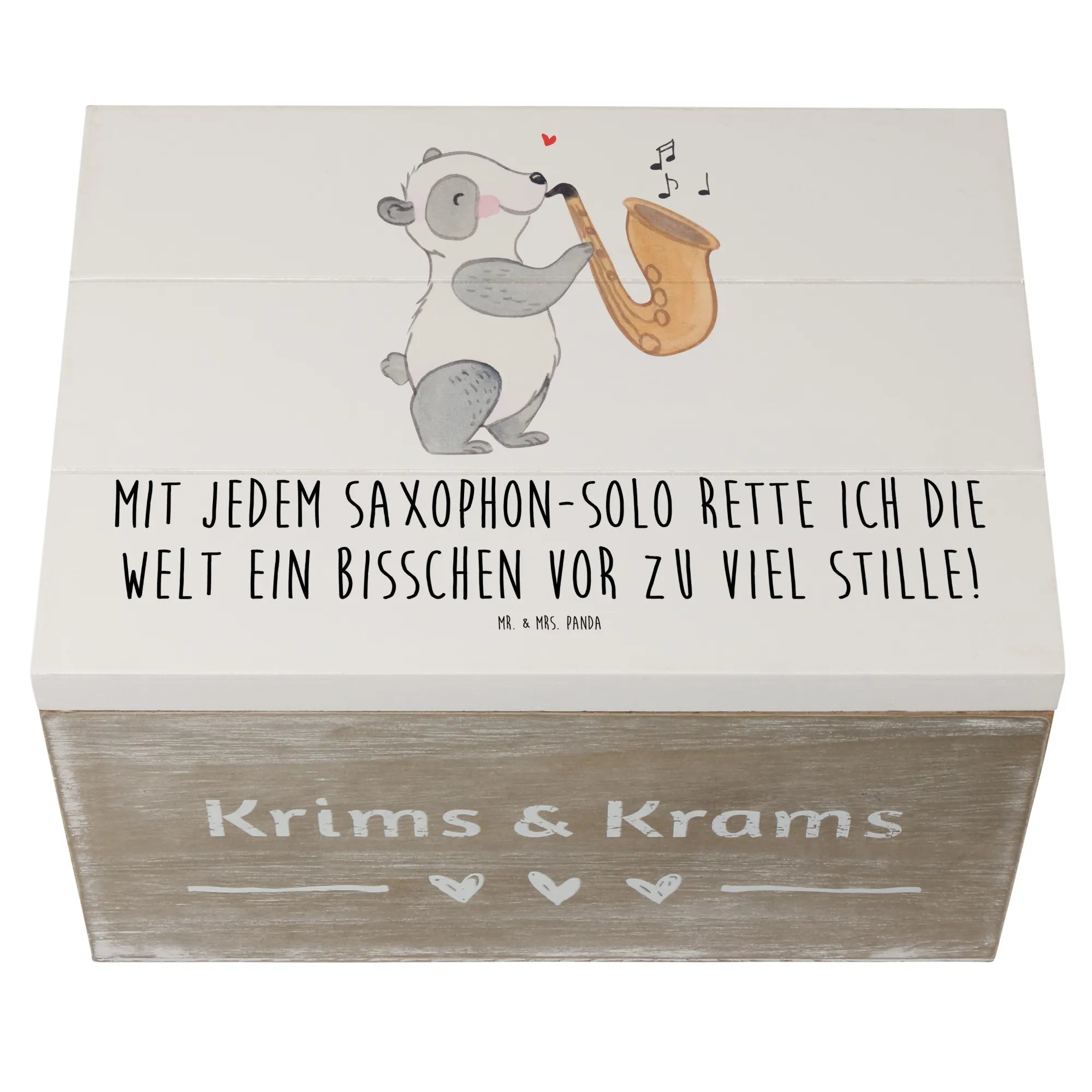 Entdecke die zauberhafte Holzkiste von Mr. & Mrs. Panda, die nicht nur ein echter Hingucker ist, sondern auch Dein perfekter Aufbewahrungsort für all Deine wertvollen Erinnerungen. Diese Kiste, liebevoll bedruckt mit einem wunderschönen Saxophon-Motiv und dem Slogan "Mit jedem Saxophon-Solo rette ich die Welt ein bisschen vor zu viel Stille!", strahlt die Leidenschaft für Musik und das Leben aus.