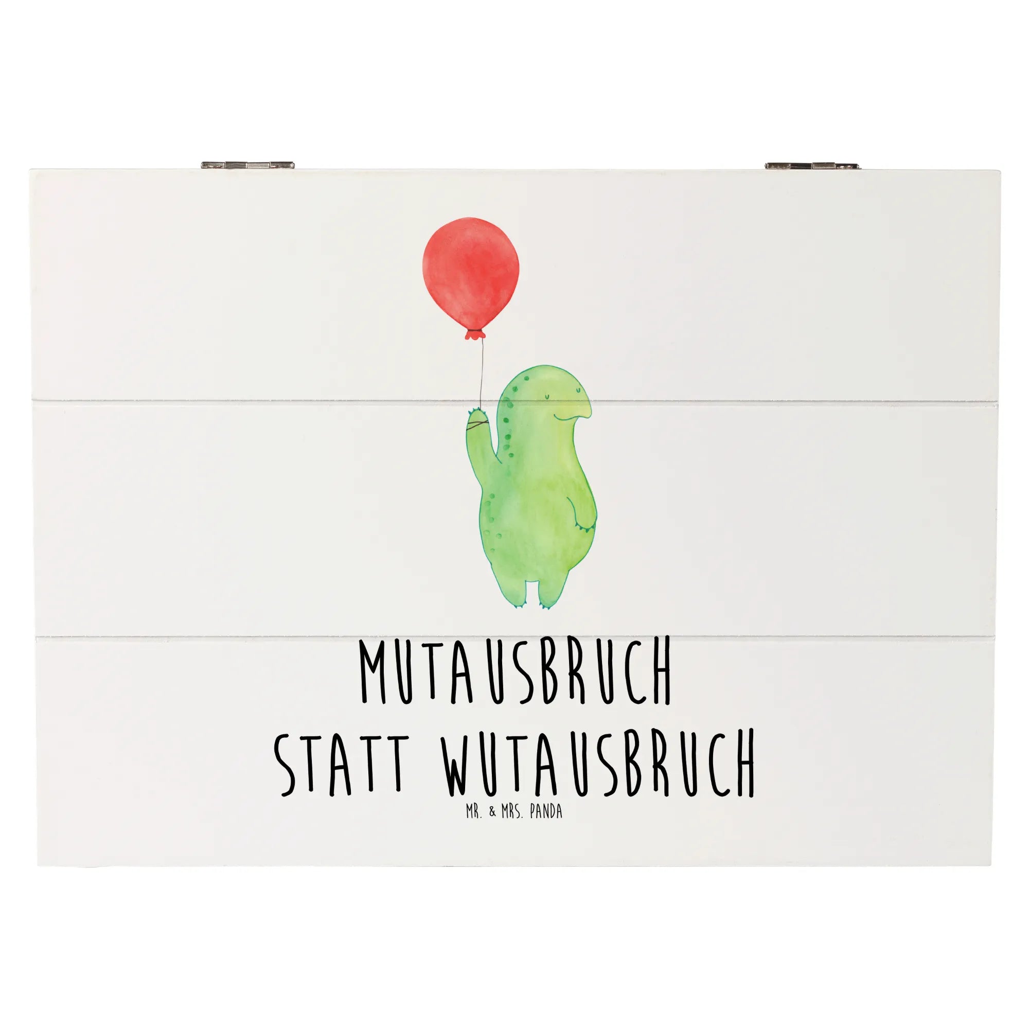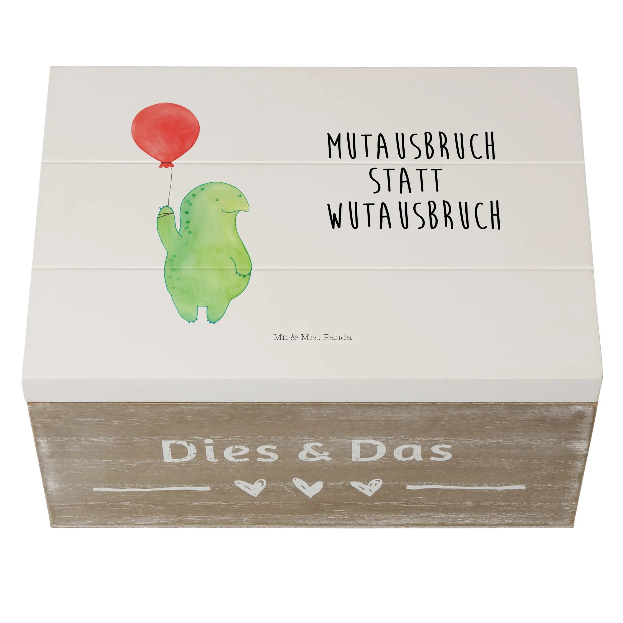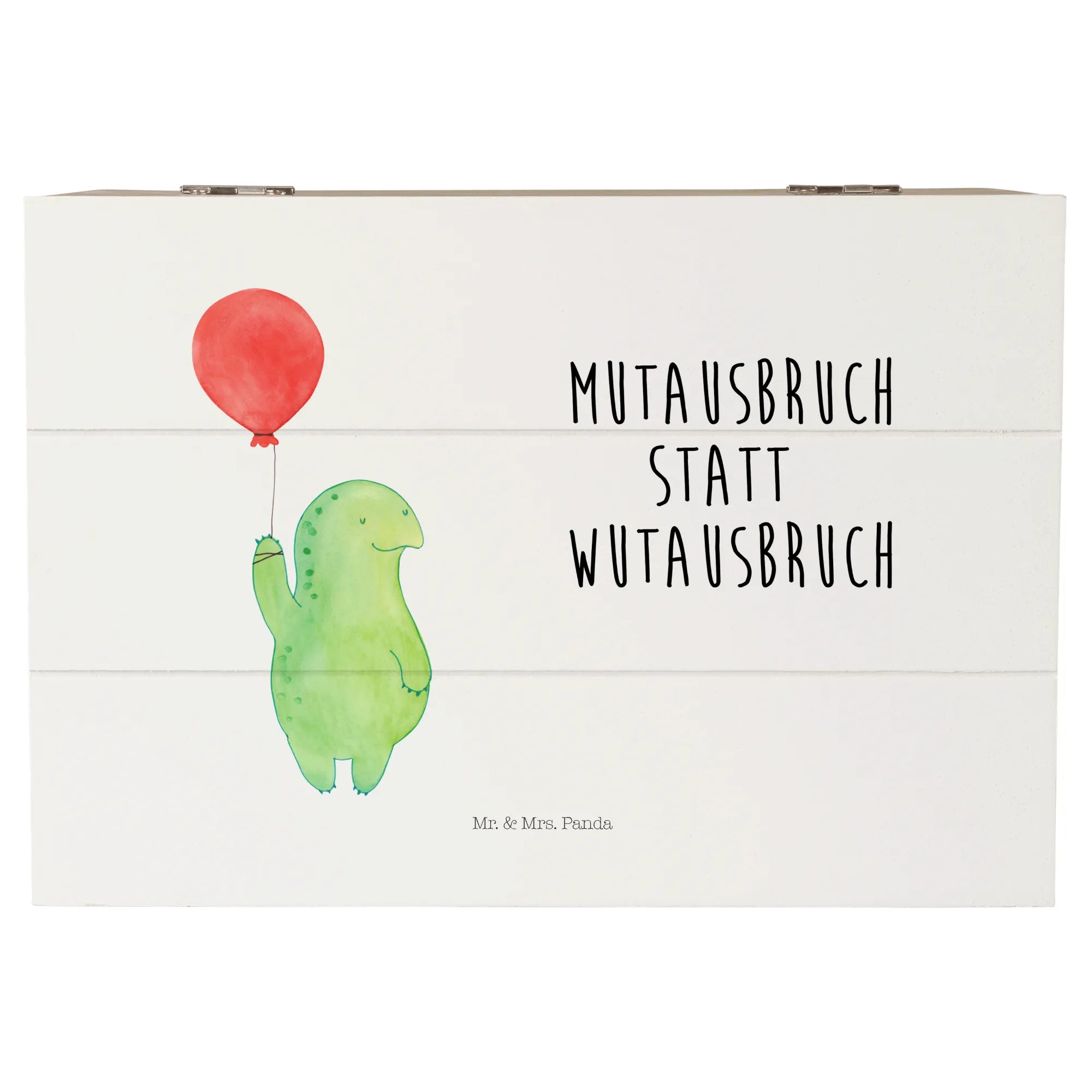 Die Holzkiste „Schildkröte Luftballon“ von Mr. & Mrs. Panda ist eine kleine Schatztruhe voller Charme und Gefühl. Das zarte Aquarell-Motiv einer schwebenden Schildkröte kombiniert mit dem lebensbejahenden Spruch „Mutausbruch statt Wutausbruch“ macht diese Kiste zur perfekten Erinnerungskiste für viele Anlässe.